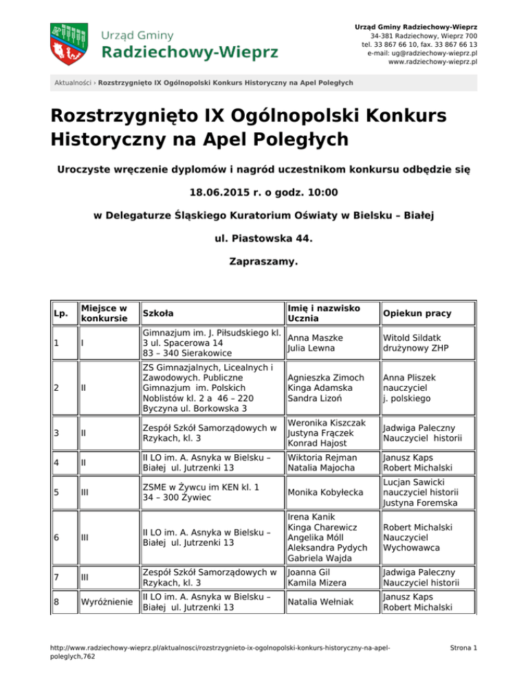 Urząd Gminy Radziechowy-Wieprz 34-381 Radziechowy, Wieprz 700 tel. 33 867 66 10, fax. 33 867 66 13 e-mail: [email protected] www.radziechowy-wieprz.pl Aktualności › Rozstrzygnięto IX Ogólnopolski Konkurs Historyczny na Apel Poległych Rozstrzygnięto IX Ogólnopolski Konkurs Historyczny na Apel Poległych Uroczyste wręczenie dyplomów i nagród uczestnikom konkursu odbędzie się 18.06.2015 r. o godz. 10:00 w Delegaturze Śląskiego Kuratorium Oświaty w Bielsku – Białej ul. Piastowska 44. Zapraszamy. Lp. Miejsce w konkursie Szkoła Imię i nazwisko Ucznia 1 I Gimnazjum im. J. Piłsudskiego kl. Anna Maszke 3 ul. Spacerowa 14 Julia Lewna 83 – 340 Sierakowice Witold Sildatk drużynowy ZHP 2 II ZS Gimnazjalnych, Licealnych i Zawodowych. Publiczne Gimnazjum im. Polskich Noblistów kl. 2 a 46 – 220 Byczyna ul. Borkowska 3 Agnieszka Zimoch Kinga Adamska Sandra Lizoń Anna Pliszek nauczyciel j. polskiego 3 II Zespół Szkół Samorządowych w Rzykach, kl. 3 Weronika Kiszczak Justyna Frączek Konrad Hajost Jadwiga Paleczny Nauczyciel historii 4 II II LO im. A. Asnyka w Bielsku – Białej ul. Jutrzenki 13 Wiktoria Rejman Natalia Majocha Janusz Kaps Robert Michalski 5 III ZSME w Żywcu im KEN kl. 1 34 – 300 Żywiec Monika Kobyłecka Lucjan Sawicki nauczyciel historii Justyna Foremska Robert Michalski Nauczyciel Wychowawca Opiekun pracy 6 III II LO im. A. Asnyka w Bielsku – Białej ul. Jutrzenki 13 Irena Kanik Kinga Charewicz Angelika Móll Aleksandra Pydych Gabriela Wajda 7 III Zespół Szkół Samorządowych w Rzykach, kl. 3 Joanna Gil Kamila Mizera Jadwiga Paleczny Nauczyciel historii 8 Wyróżnienie II LO im. A. Asnyka w Bielsku – Białej ul. Jutrzenki 13 Natalia Wełniak Janusz Kaps Robert Michalski http://www.radziechowy-wieprz.pl/aktualnosci/rozstrzygnieto-ix-ogolnopolski-konkurs-historyczny-na-apelpoleglych,762 Strona 1 Urząd Gminy Radziechowy-Wieprz 34-381 Radziechowy, Wieprz 700 tel. 33 867 66 10, fax. 33 867 66 13 e-mail: [email protected] www.radziechowy-wieprz.pl Aktualności › Rozstrzygnięto IX Ogólnopolski Konkurs Historyczny na Apel Poległych Wyróżnienie Zespół Szkół Samorządowych w Rzykach, kl. 3 Dominik Michałek Jadwiga Paleczny nauczyciel historii 10 Wyróżnienie II LO im. A. Asnyka w Bielsku – Białej ul.Jutrzenki 13 Sara Kwaśny Sara Kłusek Grzegorz Kawczak Robert Michalski Stanisław Grzybowski Jacek Lisicki 11 Wyróżnienie LO im. M. Kopernika 34 – 300 Żywiec ul. Słowackiego 2 Dawid Radecki kl. 2 f Ewa Górna nauczyciel historii 12 Wyróżnienie Gimnazjum ASLAN im. C.S. Lewisa w Głogowie kl. 2 a ul. P. Skargi 5 67 – 200 Głogów Agata Sidorowicz Marta Siennicka Hanna Pawłowska Małgorzata Zarubajko nauczyciel historii Wyróżnienie ZDZ w Katowicach, ZS Technikum Logistyczne kl.1 b ul. Angelika Broźny Sempołowskiej 1 43 – 300 Bielsko – Biała Orest Kłosowicz nauczyciel historii 14 Wyróżnienie ZSP nr 2 im. ppłk. dr. Stanisława Kulińskiego LO kl. 2 ul. Grzegorz Kościuszki 49 62 – 100 Szyszkowski Wągrowiec Marlena Klar – Jakubiak 15 Wyróżnienie ZSME w Żywcu im KEN kl. 1 34 – 300 Żywiec Joanna Szczotka Lucjan Sawicki nauczyciel historii Justyna Foremska 9 13 16 Wyróżnienie ZSME w Żywcu im KEN LO kl. 1 34 – 300 Żywiec Paulina Temel Lucjan Sawicki nauczyciel historii Justyna Foremska nauczyciel j. polskiego 17 Wyróżnienie Gimnazjum Pewel Ślemiejska Agnieszka Ciućka Maria Piecha Jolanta Mrowiec nauczyciel j. polskiego 18 Wyróżnienie ZDZ w Katowicach, ZS Technikum Logistyczne kl.1 a ul. Artur Szczotka Sempołowskiej 1 43 – 300 Bielsko – Biała Orest Kłosowicz nauczyciel historii 19 Wyróżnienie II LO im. A. Asnyka w Bielsku – Białej ul. Jutrzenki 13 Agnieszka Adamska Robert Michalski Janusz Kaps 20 Wyróżnienie II LO im. A. Asnyka w Bielsku – Białej ul. Jutrzenki 13 Szymon Chowaniec Sebastian Tyrlik Jakub Hańderek - 21 Wyróżnienie II LO im. A. Asnyka w Bielsku – Białej ul. Jutrzenki 13 Paweł Nitoń - 22 Wyróżnienie ZSME w Żywcu im KEN LO 34 – 300 Żywiec Dawid Motyka Lucjan Sawicki nauczyciel historii 23 Wyróżnienie II LO im. A. Asnyka w Bielsku – Białej ul. Jutrzenki 13 Natalia Noworyta Robert Michalski Janusz Kaps http://www.radziechowy-wieprz.pl/aktualnosci/rozstrzygnieto-ix-ogolnopolski-konkurs-historyczny-na-apelpoleglych,762 Strona 2 Urząd Gminy Radziechowy-Wieprz 34-381 Radziechowy, Wieprz 700 tel. 33 867 66 10, fax. 33 867 66 13 e-mail: [email protected] www.radziechowy-wieprz.pl Aktualności › Rozstrzygnięto IX Ogólnopolski Konkurs Historyczny na Apel Poległych Karolina Glos Patrycja Machalica Klaudia Sromek Marta Stryczek 24 Wyróżnienie II LO im. A. Asnyka w Bielsku – Białej ul. Jutrzenki 13 25 Wyróżnienie II 23LO im. A. Asnyka w Bielsku – Tomasz Nowak Białej ul. Jutrzenki 13 Robert Michalski nauczyciel Jacek Lisicki - Kategoria II Patriotyczny Montaż Poetycki 26 Kat. II Wyróżnienie ZSO i Z LO kl. 3 b ul. 23 stycznia 13 Magdalena Zając 86 - 050 Solec Kujawski Mariola Dębowska Milewska nauczyciel historii http://www.radziechowy-wieprz.pl/aktualnosci/rozstrzygnieto-ix-ogolnopolski-konkurs-historyczny-na-apelpoleglych,762 Strona 3