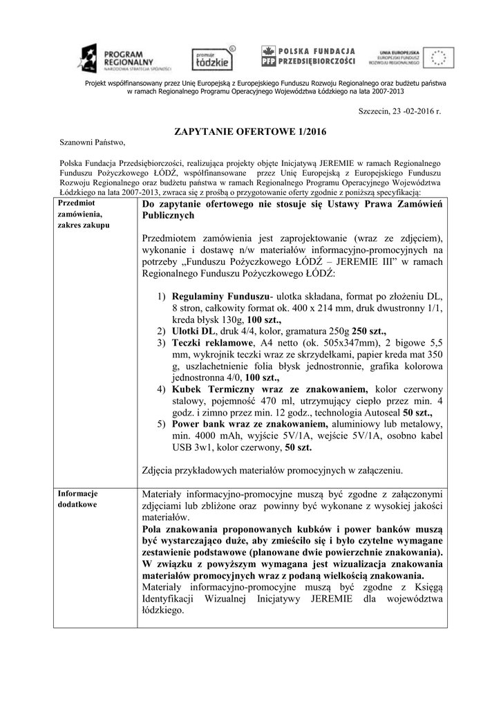 Projekt współfinansowany przez Unię Europejską z Europejskiego Funduszu Rozwoju Regionalnego oraz budżetu państwa w ramach Regionalnego Programu Operacyjnego Województwa Łódzkiego na lata 2007-2013 Szczecin, 23 -02-2016 r. ZAPYTANIE OFERTOWE 1/2016 Szanowni Państwo, Polska Fundacja Przedsiębiorczości, realizująca projekty objęte Inicjatywą JEREMIE w ramach Regionalnego Funduszu Pożyczkowego ŁÓDŹ, współfinansowane przez Unię Europejską z Europejskiego Funduszu Rozwoju Regionalnego oraz budżetu państwa w ramach Regionalnego Programu Operacyjnego Województwa Łódzkiego na lata 2007-2013, zwraca się z prośbą o przygotowanie oferty zgodnie z poniższą specyfikacją: Przedmiot Do zapytanie ofertowego nie stosuje się Ustawy Prawa Zamówień zamówienia, Publicznych zakres zakupu Przedmiotem zamówienia jest zaprojektowanie (wraz ze zdjęciem), wykonanie i dostawę n/w materiałów informacyjno-promocyjnych na potrzeby „Funduszu Pożyczkowego ŁÓDŹ – JEREMIE III” w ramach Regionalnego Funduszu Pożyczkowego ŁÓDŹ: 1) Regulaminy Funduszu- ulotka składana, format po złożeniu DL, 8 stron, całkowity format ok. 400 x 214 mm, druk dwustronny 1/1, kreda błysk 130g, 100 szt., 2) Ulotki DL, druk 4/4, kolor, gramatura 250g 250 szt., 3) Teczki reklamowe, A4 netto (ok. 505x347mm), 2 bigowe 5,5 mm, wykrojnik teczki wraz ze skrzydełkami, papier kreda mat 350 g, uszlachetnienie folia błysk jednostronnie, grafika kolorowa jednostronna 4/0, 100 szt., 4) Kubek Termiczny wraz ze znakowaniem, kolor czerwony stalowy, pojemność 470 ml, utrzymujący ciepło przez min. 4 godz. i zimno przez min. 12 godz., technologia Autoseal 50 szt., 5) Power bank wraz ze znakowaniem, aluminiowy lub metalowy, min. 4000 mAh, wyjście 5V/1A, wejście 5V/1A, osobno kabel USB 3w1, kolor czerwony, 50 szt. Zdjęcia przykładowych materiałów promocyjnych w załączeniu. Informacje dodatkowe Materiały informacyjno-promocyjne muszą być zgodne z załączonymi zdjęciami lub zbliżone oraz powinny być wykonane z wysokiej jakości materiałów. Pola znakowania proponowanych kubków i power banków muszą być wystarczająco duże, aby zmieściło się i było czytelne wymagane zestawienie podstawowe (planowane dwie powierzchnie znakowania). W związku z powyższym wymagana jest wizualizacja znakowania materiałów promocyjnych wraz z podaną wielkością znakowania. Materiały informacyjno-promocyjne muszą być zgodne z Księgą Identyfikacji Wizualnej Inicjatywy JEREMIE dla województwa łódzkiego. Materiały informacyjno-promocyjne: regulaminy, ulotki, teczki reklamowe muszą być oznakowane wg zestawienia rozszerzonego tj: logo Programu Regionalnego, logo województwa, logo Polskiej Fundacji Przedsiębiorczości, logo Unii Europejskiej (flaga, słowne odniesienie do Unii Europejskiej i Europejskiego Funduszu Rozwoju Regionalnego), informacja o współfinansowaniu projektu, hasło Inicjatywy JEREMIE, logo inicjatywy JEREMIE, kolorystyka inicjatywy JEREMIE, adres strony internetowej inicjatywy JEREMIE. Materiały promocyjne: Power banki oraz kubki termiczne muszą być oznakowane wg zestawienia podstawowego: ciąg 3 logotypów: logo Programu Regionalnego, logo województwa, logo Unii Europejskiej (flaga, słowne odniesienie do Unii Europejskiej i Europejskiego Funduszu Rozwoju Regionalnego), adres strony internetowej inicjatywy JEREMIE, logo Polskiej Fundacji Przedsiębiorczości. Projekty muszą zostać każdorazowo zaakceptowane przez Zamawiającego. Projekty regulaminów oraz znakowanie power banków i kubków termicznych w cenie. Projekt graficzny ulotek i teczek wraz ze zdjęciem w cenie, Koszt dostawy w cenie usługi. Miejsce dostawy: siedziba Zamawiającego Termin dostawy: do 21 dni od daty zaakceptowania projektu. Zamawiający zastrzega sobie prawo do odstąpienia od części zamówienia. Zamawiający zastrzega sobie prawo do wyłączenia części zamówienia. Zamawiający zastrzega sobie prawo do złożenia częściowego zamówienia. Przelew w terminie 14 dni od daty prawidłowo wystawionej faktury VAT przez Sprzedawcę na podstawie protokołu odbioru materiałów reklamowych. Termin nadsyłania 03.03.2016 r. do godziny 12:00 ofert osobiście w siedzibie Fundacji przy ul. Monte Cassino 32 w Szczecinie, pocztą elektroniczną na adres [email protected] lub faxem 91 312 92 02. Oferta Oferta musi zawierać: Dokładny opis (kolor, wymiary, gramatura, rodzaj, zdjęcia, itp.) wraz z informacją o znakowaniu, Projekt wizualizacji znakowania materiałów promocyjnych (kubki, powerbank) wraz z podaną wielkością znakowania, Wycenę (brutto) poszczególnych materiałów reklamowych, Termin realizacji zamówienia, Formę dostarczenia gadżetów, Czas związania z ofertą, Sposób zapłaty, Informację o kosztach dodatkowych jeśli występują, Forma płatności Kryteria wyboru Zleceniodawca Oświadczenie o braku powiązań kapitałowych i osobowych z Polską Fundacją Przedsiębiorczości zgodnie ze wzorem, Dokument lub potwierdzoną za zgodność z oryginałem kopię dokumentu potwierdzającego prawo do składania oświadczeń w imieniu Oferenta (np. odpis z KRS lub informacja odpowiadająca odpisowi aktualnemu z Centralnej Informacji KRS, wydruk wpisu w CEIDG, itp.). Doświadczenie oferenta w realizowaniu zamówień dla Inicjatywy JEREMIE. zgodność oferty z zapytaniem ofertowym, jakość, cena, czas realizacji zamówienia. Polska Fundacja Przedsiębiorczości ul. Monte Cassino 32, 70-466 Szczecin NIP 851-22-42-911 W razie jakichkolwiek pytań prosimy o kontakt z [email protected] Agnieszką Korkiewicz tel. 91 312 92 00, email; Z poważaniem,