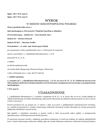 Sygn. akt I ACa 154/12 Sygn. akt I ACa 154/12 WYROK W IMIENIU RZECZYPOSPOLITEJ POLSKIEJ Dnia 5 października 2012 r. Sąd Apelacyjny w Warszawie I Wydział Cywilny w składzie: Przewodniczący – Sędzia SA – Ewa Kaniok /spr./ Sędzia SA – Roman Dziczek Sędzia SO del. – Mariusz Łodko Protokolant – st. sekr. sąd. Katarzyna Foltak po rozpoznaniu w dniu 5 października 2012 r. w Warszawie na rozprawie sprawy z powództwa (...) Spółdzielni Mieszkaniowej (...) w W. przeciwko W. K. i A. K. o zapłatę na skutek apelacji powoda od wyroku Sądu Okręgowego Warszawa-Praga w Warszawie z dnia 15 listopada 2011 r. sygn. akt II C 646/08 1. oddala apelację, 2. zasądza od (...) Spółdzielni Mieszkaniowej (...) w W. na rzecz W. K. i A. K. solidarnie kwotę 2700 (dwa tysiące siedemset) złotych tytułem zwrotu kosztów zastępstwa procesowego w postępowaniu apelacyjnym. I ACa 154/12 UZASADNIENIE (...) Spółdzielnia Mieszkaniowa (...) wniosła o zasądzenie od W. K. i A. K. kwoty 182 217,16 zł z tytułu dopłaty do wkładu budowlanego do lokalu mieszkalnego, jaki powód zobowiązał się zbudować dla pozwanych na mocy umowy z dnia 27.09.2004 r. Powód powoływał się na przepis art. 17 ustawy z dnia 15.12.2000 o spółdzielniach mieszkaniowych twierdząc, że z ustaleń poczynionych w wyniku ostatecznego rozliczenia inwestycji wynika obowiązek po stronie pozwanych dopłacenia określonej w pozwie kwoty. Sąd zgodnie z wnioskiem zawartym w pozwie wydał w dniu 24.04.2008 nakaz zapłaty w postępowaniu upominawczym, od którego pozwani złożyli sprzeciw. W sprzeciwie pozwani wnosili o oddalenie powództwa podnosząc, że brak jest podstaw do żądania jakichkolwiek kwot z tytułu ostatecznego rozliczenia wkładu, gdyż nie zostało dokonane ostateczne rozliczenia inwestycji budowy osiedla (...), w którym zlokalizowany jest ich lokal mieszkalny, bowiem nie zostało jeszcze dokonane zakończenie tej inwestycji, nie ma decyzji o odbiorze końcowym inwestycji, nie zostały wykonane wszystkie prace, brak też zezwolenia na użytkowanie obiektu. Wyrokiem z dnia 15.11.2011 r. Sąd Okręgowy Warszawa-Praga w Warszawie w punkcie I. oddalił powództwo; w punkcie II zasądził od (...) Spółdzielni Mieszkaniowej (...) w W. na rzecz pozwanych W. K. i A. K. kwotę 3600 zł tytułem zwrotu kosztów zastępstwa procesowego. W uzasadnieniu tego wyroku Sąd Okręgowy wskazał: Na mocy umowy zawartej przez strony w dniu 27.09.2004 /k-10/ o ustanowienie spółdzielczego własnościowego prawa do lokalu mieszkalnego powód zobowiązał się do wybudowania dla pozwanych lokalu mieszkalnego nr (...) / obecnie 138/ o pow. 119,7 m( 2) wraz z tarasem o powierzchni 17,6,m( 2) i pomieszczeniem przynależnym nr(...) o pow. 4,8 m2 w budynku(...) przy al. (...) w osiedlu (...). Z §2 tej umowy wynika, ż wysokość wkładu budowlanego związanego z przedmiotowym lokalem wynosi na podstawie wstępnego rozliczenia kosztów 399 606,48 zł, a za pomieszczenie przynależne 10. 015,20 zł. Pozwani wpłacili powyższą kwotę przy zawarciu umowy. Jednocześnie z §2 pkt. 3 umowy wynikał obowiązek uzupełnienia wkładu budowlanego, jeśli koszt budowy lokalu w wyniku rozliczenia ostatecznego będzie większy. Pozwani zostali przez powoda pismem z dnia 17.07.2007 wezwani do uzupełnienia wkładu budowlanego o kwotę 178 802,29 zł z tytułu lokalu mieszkalnego i 3 414,87 z tytułu pomieszczenia gospodarczego. Uchwałą Rady Nadzorczej powodowej Spółdzielni z dnia 28.05.2007 zostały rozliczone koszty ostateczne inwestycji, mimo że Spółdzielnia nie dysponowała zezwoleniem na użytkowanie, którego uzyskanie kończy inwestycję i umożliwia ostateczne rozliczenie, gdyż dopiero wówczas można stwierdzić, że zostały wykonane wszystkie prace i można policzyć pełne koszty całej inwestycji, a następnie rozliczyć wkład ostateczny zgodnie z postanowieniami umowy i przepisami ustawy o spółdzielniach mieszkaniowych. Żądana przez powoda kwota wynika z wyliczenia dokonanego zgodnie z powołaną uchwałą. Do daty wyroku nie została wydana ostateczna decyzja o pozwoleniu na użytkowanie obiektu, w którym zlokalizowany jest lokal mieszkalny pozwanych. Na rozprawie w dniu 15 listopada 2011 pełnomocnik powoda złożył oświadczenie o ograniczeniu powództwa o kwotę 21119,76 zł, gdyż pozwani w marcu 2011 zrezygnowali z miejsca garażowego wobec czego powód dokonał potrącenia tej kwoty i ostatecznie dochodzi kwoty 161 097,40 zł. Pozwani nie wyrazili zgody na potrącenie podnosząc, że roszczenie dochodzone w niniejszym postępowaniu nie jest wymagalne, w przeciwieństwie do roszczenia o zwrot wkładu z tytułu rezygnacji z miejsca garażowego, co czyni oświadczenie o potrąceniu bezskutecznym. Powództwo zostało oddalone jako przedwczesne. Sąd Okręgowy wskazał, że z przepisu art. 17 ustawy o spółdzielniach mieszkaniowych jednoznacznie wynika, że ostateczne rozliczenie wkładu budowlanego / lub kosztów budowy/ możliwe jest dopiero wówczas, gdy wydana zostanie prawomocna decyzja o zezwoleniu na użytkowanie zgodnie z przepisem art. 55 pkt. l Prawa budowlanego. Tymczasem powód zezwoleniem takim nie dysponuje. Wobec tego dokonywanie ostatecznego rozliczenia jest przedwczesne, nie może być uznane za całkowite i prawidłowe, gdyż w budynku do wykonania pozostało jeszcze część prac. Okoliczność ta powoduje, że podstawą rozliczenia nie mogą stać się przywoływane przez powoda dokumenty, w szczególności uchwała Rady Nadzorczej ustalająca zasady rozliczenia ostatecznego wkładu. Dopiero po uzyskaniu przez powoda decyzji administracyjnej wydanej na podstawie art. 15 pkt 1 Prawa budowlanego Rada Nadzorcza Spółdzielni będzie mogła podjąć uchwałę o rozliczeniu końcowym inwestycji i wówczas powód będzie mógł dokonać rozliczenia ostatecznego kosztów budowy poszczególnych lokali w inwestycji (...) w W.. Dopóki powód nie uzyska decyzji o pozwoleniu na użytkowanie wsze