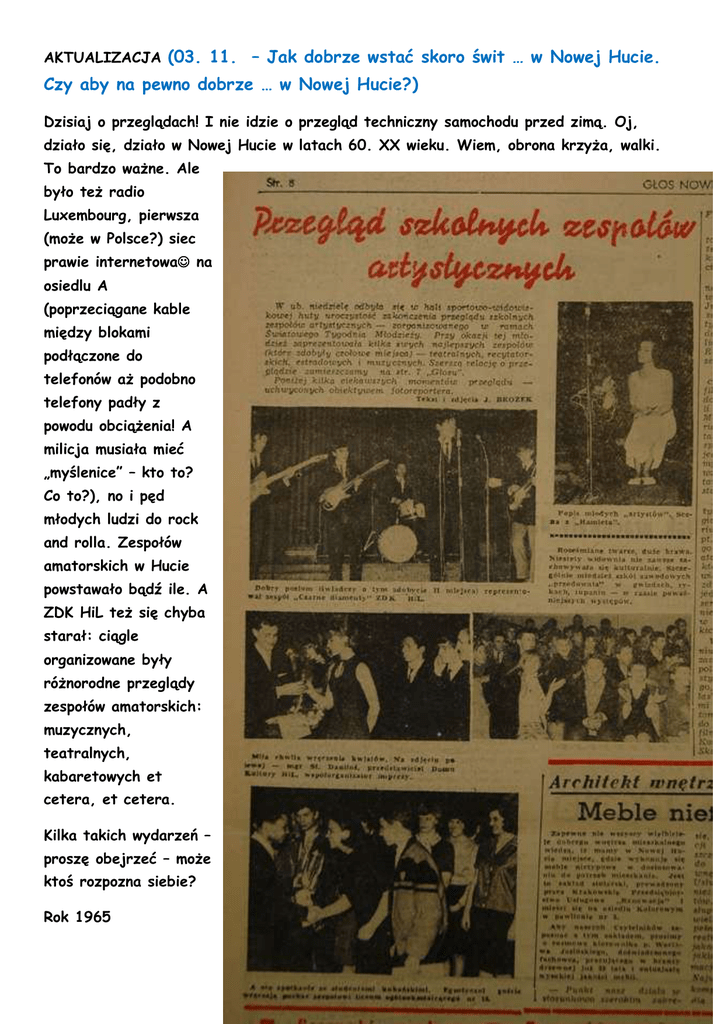 AKTUALIZACJA (03. 11. – Jak dobrze wstać skoro świt … w Nowej Hucie. Czy aby na pewno dobrze … w Nowej Hucie?) Dzisiaj o przeglądach! I nie idzie o przegląd techniczny samochodu przed zimą. Oj, działo się, działo w Nowej Hucie w latach 60. XX wieku. Wiem, obrona krzyża, walki. To bardzo ważne. Ale było też radio Luxembourg, pierwsza (może w Polsce?) siec prawie internetowa na osiedlu A (poprzeciągane kable między blokami podłączone do telefonów aż podobno telefony padły z powodu obciążenia! A milicja musiała mieć „myślenice” – kto to? Co to?), no i pęd młodych ludzi do rock and rolla. Zespołów amatorskich w Hucie powstawało bądź ile. A ZDK HiL też się chyba starał: ciągle organizowane były różnorodne przeglądy zespołów amatorskich: muzycznych, teatralnych, kabaretowych et cetera, et cetera. Kilka takich wydarzeń – proszę obejrzeć – może ktoś rozpozna siebie? Rok 1965 Głos Nowej Huty, 1965, nr 14, ostatnia strona Wyczytałam na stronie Mistrza skład „Czarnych diamentów”: gitara solo - Stanisław Alker, gitara bas - Kazimierz Raczyński, gitara rytm - Ryszard Murak, perkusja - Wiesław Kuśnierz i jako wokaliści Zbigniew Szczepanowski, Alicja Urbaś. Zapraszam do pomocy w przygotowaniu wystawy w Muzeum na os. Słonecznym „Historia muzyki rozrywkowej w Nowej Hucie 19502000). To zapowiedź kolejnego konkursu muzycznego dla zespołów amatorskich – rok 1967 Głos Nowej Huty, 1967, nr 48, str. 6 I kolejny nowohucki festiwal – rok 1968 Głos Nowej Huty, 1968, nr 7, str. 7 Głos Nowej Huty, 1968, nr 21, str. 4 I dzięki stronie Mistrza: Od lewej: Zbigniew Wąsowicz, Jerzy Garncarczyk i zasłonięty przez perkusistę Wojciech Budweil, last but not least Wojciech Wierzbicki. I jeszcze powrót do roku 1965 – kolejna impreza nowohucka – konkurs?, teleturniej? Wydziałów Kombinatu – co prawda napisano, że to krakowska piosenkarka, ale ktoś mi powiedział, że pani Jana Rimska to nowohucianka. Jak to było więc? Ktoś wie? Głos Nowej Huty, 1965, nr 22, str. 7 „A teraz będzie solo … organizacyjne A ja będę przeżywać!!!” Cudze chwalicie, swego nie znacie,! Jakże mi to znakomicie pasuje nowohuckim brzaskiem! Po wielu latach reaktywował się jeden z zespołów, szczególny zespół, najdłużej w Nowej Hucie grający, zresztą znakomicie grający (to tak, jak w tym kolejnym powiedzeniu: im starsze wino…) „RYSZARDY”. Są mile widziani w szkole, w której obecnie ćwiczą. Ale szkoła nie ma warunków lokalowych aż takich, aby wydzielić jedno pomieszczenie dla nich. Więc szukam w Nowej Hucie takiego miejsca – 50 m2 no może ciutka więcej. I kompletnie nie rozumiem – NIE MA TAKIEGO MIEJSCA W 200 000 OBECNIE NOWEJ HUCIE, aby ci, którzy kiedyś tworzyli specjalny klimat muzyczny Nowej Huty mogli sobie poćwiczyć. No, zwyczajnie nie ma! Łaźnia Nowa? Wysoka kultura, festiwale itd. – czy coś dla mieszkańców Nowej Huty? Zapewne prestiż ogromny, ale na co dzień? W NCK nie byłam jeszcze – ale pewnie będzie to samo. Światowid – Muzeum PRL. Po co w Nowej Hucie Muzeum PRL? Wczoraj przeczytałam, jak to kandydaci na prezydenta Krakowa prześcigają się w różnych obietnicach dla Nowej Huty, jak ją doceniają itd. No to proszę, może coś zrobicie dla nowohuckich muzyków amatorów sprzed lat. Piszę to, bo okazuje się, że odzywają się także inni byli członkowie byłych nowohuckich zespołów big-beatowych – chętnie by pograli, powspominali, ale nie ma gdzie! Pewnie – gdyby były warunki- przygotowali by wspólnie – Ametysty, Błękitni, Czarne Diamenty, Fantom, Ryszardy, i znowu itd., itd., itd., imprezę, jakiej dawno w Nowej Hucie nie było – DLA NOWOHUCIAN! Pewnie to ja nie umiem szukać, przekonywać, zachęcać, sama, jako ta emerytka nie mogę być sponsorem, mecenasem itp. A warto, oj, bardzo warto. Koncerty w ich wykonaniu, a zwłaszcza The Shadows – brzmią pięknie! Jeden z gitarzystów (grający w wielu zespołach m.in. w Skaldach, Akwarelach Niemena i innych) powiedział mi: „Właściwie to być może bez tych zespołów z lat 60., bez Wiesława Dymnego (kierownik „Szwagrów”) może dzisiaj nadal grałoby się krakowiaki tylko? (z całym szacunkiem dla pięknej melodii!). Im należy się pomnik w Krakowie”. No to ma Pan! Pan o pomniku, a tu kilku metrów kwadratowych nie ma!!!! Pozdrawiam, nieco politycznie zniechęcona Krystyna Downar