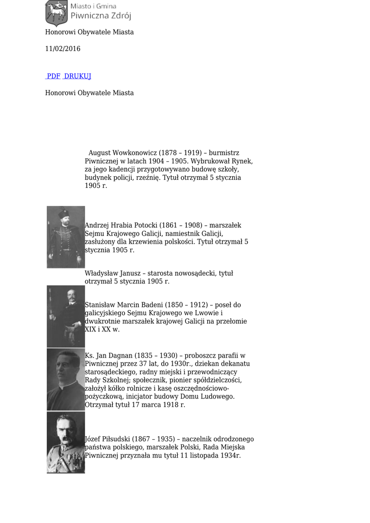 Honorowi Obywatele Miasta 11/02/2016 PDF DRUKUJ Honorowi Obywatele Miasta August Wowkonowicz (1878 – 1919) – burmistrz Piwnicznej w latach 1904 – 1905. Wybrukował Rynek, za jego kadencji przygotowywano budowę szkoły, budynek policji, rzeźnię. Tytuł otrzymał 5 stycznia 1905 r. Andrzej Hrabia Potocki (1861 – 1908) – marszałek Sejmu Krajowego Galicji, namiestnik Galicji, zasłużony dla krzewienia polskości. Tytuł otrzymał 5 stycznia 1905 r. Władysław Janusz – starosta nowosądecki, tytuł otrzymał 5 stycznia 1905 r. Stanisław Marcin Badeni (1850 – 1912) – poseł do galicyjskiego Sejmu Krajowego we Lwowie i dwukrotnie marszałek krajowej Galicji na przełomie XIX i XX w. Ks. Jan Dagnan (1835 – 1930) – proboszcz parafii w Piwnicznej przez 37 lat, do 1930r., dziekan dekanatu starosądeckiego, radny miejski i przewodniczący Rady Szkolnej; społecznik, pionier spółdzielczości, założył kółko rolnicze i kasę oszczędnościowopożyczkową, inicjator budowy Domu Ludowego. Otrzymał tytuł 17 marca 1918 r. Józef Piłsudski (1867 – 1935) – naczelnik odrodzonego państwa polskiego, marszałek Polski, Rada Miejska Piwnicznej przyznała mu tytuł 11 listopada 1934r. Jan Marciszewski (1871 – 1953) – burmistrz Piwnicznej w latach 1927 – 1938 (burmistrzem był także jego ojciec i dziadek). Za jego kadencji dokonano odwiertu wody mineralnej (1932), wybudowano łazienki mineralne i borowinowe. Tytuł otrzymał 8 lipca 1935 r. Maciej Łach (1892 – 1966) – starosta powiatowy w Nowym Sączu w latach 1929 – 1938. Tytuł otrzymał 8 lipca 1935 r. 1. Pułk Strzelców Podhalańskich – chluba Sądecczyzny, Rada Miejska podjęła uchwałę 15 maja 1938 r. Danuta Szaflarska (ur. 1915 r. w Kosarzyskach) – znakomita aktorka, debiutowała w nowosądeckim Teatrze Towarzystwa Dramatycznego prowadzonym przez Bolesława Barbackiego, aktorka teatrów w Wilnie, Krakowie, Łodzi i Warszawie, zagrała m.in. w filmie „Zakazane piosenki” i „Skarb”, a ostatnio „Pora umierać” i „Janosik”. „Ambasador” Piwnicznej w Warszawie. Tytuł otrzymała 14 lipca 2000 r. Henry Toikander – prezes Towarzystwa FińskoPolskiego w Kuusankoski (jego żona pochodzi z Piwnicznej), przyjaciel Piwnicznej, m.in. inicjator pomocy charytatywnej i współorganizator tournee Zespołu Regionalnego „Dolina Popradu” po Finlandii. Tytuł otrzymał 30 września 2005 r. Géza Cséby (ur. 1947 r. w Keszthely) – poeta, tłumacz, kulturoznawca, dyrektor Domu Kultury w Keszthely na Węgrzech, przyjaciel Polski, przetłumaczył na język węgierski wiersze poetek piwniczańskich: Barbary Paluchowej, Wandy Łomnickiej-Dulak, Stanisławy Widomskiej-Fiedor. Tytuł otrzymał 10 października 2006 r. Maria Lebdowiczowa (ur. 1934 r. w Nawojowej) – emerytowana nauczycielka języka polskiego, społecznik, współzałożycielka i redaktorka lokalnej gazety „Znad Popradu”, współautorka monografii Piwnicznej „Studia i szkice z dziejów miasta 1772 – 1998” i innych książek o Piwnicznej: „Rzeka z miasteczkiem w tle”, „Dawni Piwniczanie: słownik biograficzny”, „Skarby w Kicarzy”. Tytuł otrzymała 30 października 2008 r. Krystyna z Jurgielewiczów - Bielczykowa (ur. 1921 r. w Krakowie) – działała we fransuskim ruchu oporu, więzień Ravensbruck i Neubrandenburg, nauczycielka języka francuskiego w liceach warszawskich, a także na AWF w Warszawie. Po przejściu na emeryturę wraz z mężem zamieszkała w Piwnicznej Zdroju, gdzie udziela się społecznie. Tytuł otrzymała 30 października 2008 r. Prof. Zygmunt Bielczyk (ur. 1913 r. w Nowym Sączu) – żołnierz września 1939 r. i AK, prof. AWF w Warszawie, w latach 70. prodziekan, dziekan i prorektor tej uczelni, autor opracowań dotyczących techniki i metodyki narciarstwa, założyciel unikalnego w skali światowej muzeum nart w Piwnicznej, do którego przekazał cenną kolekcję - zbiory nart. Tytuł otrzymał 30 października 2008 r. Maria Zubek (ur. 1919 r. w Nowym Sączu) – wdowa po mjr. Zubku ps. „Tatar”, podczas II w. światowej łączniczka i pielęgniarka AK, ps. „Tatarzyna”, udziela się w związkach kombatanckich, doprowadził do wydania wspomnień wojennych swojego męża. Tytuł otrzymała 30 października 2008 r. Przemysław Stanko – dr historii z Papieskiej Akademii Teologicznej w Krakowie, badacz królewskich pergaminów dotyczących Piwnicznej, odnalazł oryginał dokumentu lokacyjnego Piwnicznej, uważany dotychczas za zaginiony lub zniszczony. Tytuł otrzymał 30 października 2008 r. Ks. Jan Wątroba (ur. 1939 r. w Łososinie Górnej) – proboszcz w Piwnicznej w latach od 1983 do 2009, pierwszy dziekan dekanatu Piwniczna, zasłużony dla budownictwa sakralnego, turysta, kapelan koła PTTK im. Władysława Oleksego w Piwnicznej-Zdroju. Otrzymał tytuł 28 lipca 2009 r.