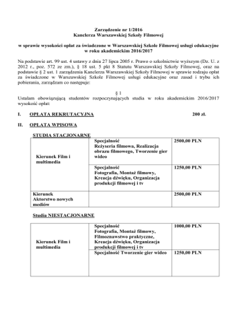 Zarządzenie nr 1/2016 Kanclerza Warszawskiej Szkoły Filmowej w sprawie wysokości opłat za świadczone w Warszawskiej Szkole Filmowej usługi edukacyjne w roku akademickim 2016/2017 Na podstawie art. 99 ust. 4 ustawy z dnia 27 lipca 2005 r. Prawo o szkolnictwie wyższym (Dz. U. z 2012 r., poz. 572 ze zm.), § 18 ust. 5 pkt 8 Statutu Warszawskiej Szkoły Filmowej, oraz na podstawie § 2 ust. 1 zarządzenia Kanclerza Warszawskiej Szkoły Filmowej w sprawie rodzaju opłat za świadczone w Warszawskiej Szkole Filmowej usługi edukacyjne oraz zasad i trybu ich pobierania, zarządzam co następuje: §1 Ustalam obowiązującą studentów rozpoczynających studia w roku akademickim 2016/2017 wysokość opłat: I. OPŁATA REKRUTACYJNA II. OPŁATA WPISOWA 200 zł. STUDIA STACJONARNE Kierunek Film i multimedia Specjalność Reżyseria filmowa, Realizacja obrazu filmowego, Tworzenie gier wideo 2500,00 PLN Specjalność Fotografia, Montaż filmowy, Kreacja dźwięku, Organizacja produkcji filmowej i tv 1250,00 PLN Kierunek Aktorstwo nowych mediów 2500,00 PLN Studia NIESTACJONARNE Kierunek Film i multimedia Specjalność Fotografia, Montaż filmowy, Filmoznawstwo praktyczne, Kreacja dźwięku, Organizacja produkcji filmowej i tv Specjalność Tworzenie gier wideo 1000,00 PLN 1250,00 PLN III. CZESNE (opłata roczna) STUDIA STACJONARNE Czes czesne dla płatności w formie Specjalność jednjednorazowej opłaty rocznej Reżyseria filmowa, Realizacja obrazu filmowego, 00 zł 11 500,00 PLN Kierunek Film i Tworzenie gier wideo multimedia czesne dla płatności w formie miesięcznych opłat ratalnych: 1250,00 PLN(od października do czerwca włącznie) 100,00 PLN (od lipca do września włącznie) Specjalność Fotografia, Montaż filmowy, Kreacja dźwięku, Organizacja produkcji filmowej i tv czesne dla płatności w formie jednorazowej opłaty rocznej 12 300PLN czesne dla płatności w formie miesięcznych opłat ratalnych: 1350,00 (od października do czerwca włącznie) 500,00 (od lipca do września włącznie) Kierunek Aktorstwo nowych mediów Studia anglojęzyczne Kierunek Film i multimedia czesne dla płatności w formie jednorazowej opłaty rocznej 8800 PLN czesne dla płatności w formie miesięcznych opłat ratalnych: 950,00 (od października do czerwca włącznie) 400,00 (od lipca do września włącznie) Specjalność Film directing, cimenatography czesne dla płatności w formie jednorazowej opłaty rocznej EUR 4500 czesne dla płatności w formie miesięcznych opłat ratalnych: EUR 500,00 (od października do lipca włącznie) STUDIA NIESTACJONARNE Czes czesne dla płatności w formie Specjalność Fotografia, Montaż filmowy,jednjednorazowej opłaty rocznej Kreacja dźwięku 00 zł6700 PLN Kierunek Film i multimedia czesne dla płatności w formie miesięcznych opłat ratalnych: 800,00 PLN(od października do czerwca włącznie) 100,00 PLN (od lipca do września włącznie) SpecSpecjalność Filmoznawstwo praktyczne Kierunek Film i multimedia Specjalność Organizacja produkcji filmowej i tv czesne dla płatności w formie jednorazowej opłaty rocznej 5100 PLN czesne dla płatności w formie miesięcznych opłat ratalnych: 600,00 (od października do czerwca włącznie) 100,00 (od lipca do września włącznie) czesne dla płatności w formie jednorazowej opłaty rocznej 6700PLN czesne dla płatności w formie miesięcznych opłat ratalnych: 800,00 (od października do czerwca włącznie) 100,00 (od lipca do września włącznie) Specjalność Tworzenie gier wideo czesne dla płatności w formie miesięcznych opłat ratalnych: 950,00 (od października do czerwca włącznie) 100 (od lipca do września) IV. Czesne dla studentów powtarzających rok lub semestr: opłata w pełnej wysokości zgodnie z katalogiem z punktu I V. Opłata za dopuszczenie do warunkowej kontynuacji nauki na danym semestrze i zaliczenie przedmiotów objętych wpisem warunkowym 400 zł. za każdy przedmiot VI. Opłaty za dokumenty wydawane studentowi przez Uczelnię 1. 2. 3. Opłata za wydanie duplikatu legitymacji studiów - 10 zł. Opłata za wydanie dyplomu ukończenia studiów wraz z dwoma odpisami - 60 zł. Opłata za wydanie odpisu dyplomu w tłumaczeniu na jez. obcy - 40 zł. §2 Płatność czesnego może być dokonywana: 1) w formie jednorazowej opłaty rocznej, wnoszonej w terminie: a) do 7 dni od dnia podpisania umowy o kształcenie - w przypadku studentów rozpoczynających studia; b) do dnia 15-go października każdego roku akademickiego – w przypadku studentów kontynuujących studia, 2) w formie miesięcznych opłat ratalnych: a) I rata: 7 dni od dnia podpisania umowy w przypadku studentów rozpoczynających studia, zaś w przypadku studentów kontynuujących studia w terminie do dnia 5-go października każdego następnego roku; b) pozostałe raty: do dnia 5-tego dnia każdego miesiąca w począwszy od listopada do września każdego roku akademickiego. 2. Wyboru jednej z form płatności określonych w ust. 1, studenci dokonują poprzez złożenie stosownej deklaracji w Dziekanacie Uczelni w terminach: 1) studenci rozpoczynający studia - w dniu podpisania umowy, o której mowa w § 7, 2) studenci kontynujący studia do dnia 30 września każdego roku akademickiego. 1. §3 Zarządzenie obowiązuje od roku akademickiego 2016/2017 r.