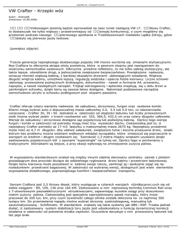 AutoRok.PL / DesignForum.PL VW Crafter - Krzepki wóz Autor: AndrzejR Zmieniony 15.09.2006. Volkswagen jesienią będzie wprowadzał na nasz rynek następcę VW LT. Nowy Crafter, to dostawczak nie tylko większy i przestronniejszy od swojej konkurencji, o czym mogliśmy się przekonać podczas naszego pierwszego spotkania w Trzebieszowicach niedaleko Lądka Zdroju, gdzie dobyły się pierwsze jazdy testowe. (powiększ zdjęcie) Trzecia generacja największego dostawczego pojazdu VW mocno wyróżnia się zmianami stylizacyjnymi. Nos Craftera to olbrzymia atrapa wlotu powietrza, która w pewnym stopniu jest nawiązaniem do wizerunku samochodów osobowych. Olbrzymie przednie reflektory, to nie tylko zabieg stylizacyjny, ale także lepsze oświetlenie drogi, a jednocześnie zwiększone bezpieczeństwo. Powiększone nadwozie, oznacza również większą kabinę, z bardziej okazałymi drzwiami ułatwiającymi wsiadanie. Większa długość wnętrza kabiny, umożliwia lepszą regulację siedziska i oparcia fotela kierowcy. Liczne schowki ułatwiają przewożenie podręcznych drobiazgów, dokumentów - nawet w formacie A4, prowiantu, napojów, a nawet niezbędnych narzędzi. Trójkąt ostrzegawczy i apteczka znajdują się u dołu drzwi w zamkniętym schowku, dzięki temu są zawsze łatwo dostępne. Natomiast podstawowe narzędzia samochodowe ukryto w schowku podłogowym pod stopami pasażera. Crafter oferuje cztery warianty nadwozia: do zabudowy, skrzyniowy, furgon oraz osobowe kombi. Klienci mogą wybrać auto o dopuszczalnej masie całkowitej 3.0, 3.5 lub 5.0 ton, co odzwierciedla oznaczane - Crafter 30, 35 i 50. Jednakże w zależności od objętości ładunku lub liczby przewożonych osób można wybrać jeden z trzech rozstawów osi: 325, 366,5, 432,5 cm oraz cztery długości całkowite. Wersje do zabudowy i skrzyniowe dostępne sąz pojedynczą lub podwójną kabiną. Oprócz tego wersje furgon i kombi w zależnożci od potrzeby mogą mieć trzy wysokości dachu. Ciekawostką jest to, iż największy Crafter pomieści aż 17 m3 ładunku o maksymalnej masie 2670 kg. Największy przedmiot może mieć aż 4,7 m długości. Aby ułatwić załadunek, zwiększono tylne i boczne przesuwne drzwi, dzięki którym bez problemu można wózkiem widłowym wkładać europalety, które zmieszczś się poprzecznie w wersjach ze średnim i długim rozstawem osi. Szerokość 1,3 metra między wnękami uzyskano dzięki zastosowaniu pojedynczych kół z oponami "supersingle" na tylnej osi. Oprócz tego w porównaniu z tradycyjnymi bliźniakami są lżejsze, a przy okazji wpływają na zmniejszenie zużycia paliwa. W wyposażeniu standardowym znalazł się między innymi zdalnie sterowany centralny zamek z pilotem posiadającym dwa przyciski służące do oddzielnego ryglowania drzwi kabiny i przestrzeni ładunkowej. Dzięki temu kierowca może pozostawić w kabinie swoje rzeczy, zamknąć ją i spokojnie zająć się np. rozładunkiem przestrzeni bagażowej. W zależności od wybranej wersji, dostępnych jest wiele elementów wyposażenia dodatkowego, poprawiajścego komfort i bezpieczeństwo transportu. Sercem Craftera jest 2,5 litrowy diesel, który występuje w czterech wersjach różnišcych się od siebie osiągami - 89, 109, 136 oraz 164 KM. Zastosowano w nim najnowszą technikę Common Rail wraz z 7-otworkowymi piezoelektrycznymi wtryskiwaczami, zapewniając wysokie osiągi przy stosunkowo niskim zużyciu paliwa. Ciekawostką jest specjalnie zaprojektowany pasek rozrządu, który może pracować do 200 tys. km, przy czym żywotność całego silnika została obliczona na co najmniej 300 tysięcy km. Do przeniesienia napędu można wybrać skrzynię sześciobiegową, manualną lub zautomatyzowaną - Schiftmatic. W standardzie znalazły się takie systemy jak ABS i ESP. Trzeba jednak dodać, iż zastosowany system stabilizacji toru jazdy jest udoskonalony o funkcję dynamicznej korekcji działania w zależności od położenia środka ciężkości. Oczywiście decyduje o nim przewożony ładunek lub też jego brak. http://mas.auto.pl Kreator PDF Utworzono 3 March, 2017, 15:56 AutoRok.PL / DesignForum.PL VW wyposażono standardowo w airbag dla kierowcy, a jako opcja dostępne są poduszki gazowe dla pasażerów oraz kurtyny w wersji kombi, tak by móc zachować maksimum bezpieczeństwa wszystkim podróżującym. Furgon wyposażony jest w stałą przegrodę oddzielającą kabinę od przestrzeni ładunkowej i posiada specjalne uchwyty do mocowania przewożonych przedmiotów. Oprócz tego podłoga przestrzeni ładunkowej może być wyłożona drewnem z wykładziną zapobiegającą poślizgowi. Opcjonalnie instalowane są szyny do mocowania bagaży tak by zachować płaską i równą podłogę. Dodatkowo również mogą znaleźć się elementy mocowań na wysokości balustrady oraz dla wysokich rzeczy pod ramą dachu. http://mas.auto.pl Kreator PDF Utworzono 3 March, 2017, 15:56