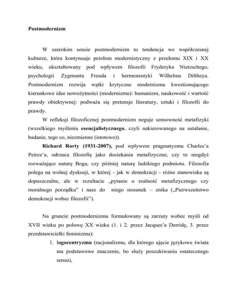 Postmodernizm W szerokim sensie postmodernizm to tendencja we współczesnej kulturze, która kontynuuje przełom modernistyczny z przełomu XIX i XX wieku, ukształtowany pod wpływem filozofii Fryderyka Nietzschego, psychologii Zygmunta Postmodernizm rozwija Freuda wątki i hermeneutyki krytyczne Wilhelma modernizmu Diltheya. kwestionującego kierunkowe idee nowożytności (modernizmu): humanizm, naukowość i wartość prawdy obiektywnej: podważa się pretensje literatury, sztuki i filozofii do prawdy. W refleksji filozoficznej postmodernizm neguje sensowność metafizyki (wszelkiego myślenia esencjalistycznego, czyli nakierowanego na ustalanie, badanie, tego co, niezmienne (istotowe)). Richard Rorty (1931-2007), pod wpływem pragmatyzmu Charles’a Peirce’a, odrzuca filozofię jako dociekania metafizyczne, czy to niegdyś rozważające naturę Boga, czy później naturę ludzkiego podmiotu. Filzoofia polega na wolnej dyskusji, w której - jak w demokracji - różne stanowiska są dopuszczalne, ale w rezultacie „pytanie o realność metafizycznego czy moralnego porządku” i nasz do niego stosunek – znika („Pierwszeństwo demokracji wobec filozofii”). Na gruncie postmodernizmu formułowany są zarzuty wobec myśli od XVII wieku po połowę XX wieku (1. i 2. przez Jacques’a Derridę, 3. przez przedstawicielki feminizmu): 1. logocentryzmu (racjonalizmu, dla którego ujęcie językowe świata ma podstawowe znaczenie, bo służy poszukiwaniu ostatecznego sensu), 2. fonocentryzmu (dominacja języka mówionego nad pismem, silny z wiązek z logocentryzmem) i 3. fallocentryzmu (dominacja męskości w kulturze, zwłaszcza w myśleniu i w języku). Odrzucenie racjonalności i logiczności wyraża pojęcie kłącza (rhizome (fr.) od Agropyri rhizoma, czyli kłącze perzu), które wskazuje na brak centrum, dowolne połączenia elementów, brak głębokiej struktury w: człowieku, ja, społeczeństwie, tekście, rozumie i filozofii. „Kłącze to dziczka, skomplikowany system podziemnych pędów lub nadziemnych korzeni, kłąb, bulwa, cebulka. Kłącze to ziemniak i perz, zgraja szczurów i zwierzęce nory, mrówki i trawa. Rizomatyczny jest język i pamięć, tkanka glejowa i nitki marionetki, aparalelna ewolucja osy i orchidei, kota i pawiana, wschodnie ogrodnictwo "klonów" i amerykański kapitalizm, underground i bitnicy.” Pojęcie kłącza zostało wprowadzone przez Gilles Deleuze’a (1925-1995) i Féliksa Guattari’ego (1930-1992) w 2. tomie Capitalisme et schizophrénie: 1. L’Anti-Œdipe (1972),2. Mille Plateaux (1980), Postmodernizm podważa wiarę w postęp, i w wielkie narracje (grands récits), czyli całościowe interpretacje dziejów i kultury, rozległe uzasadnienia wartości i utopijne wizje optymalizującej ewolucji społecznej (Jean-François Lyotard 1924-1998). Kwestionuje badanie faktów, uznając je za konstrukcje. Obiektywność nauki uznaje za maskę władzy i przemocy (Michel Foucault), a autorytety akademickie za przywileje białych mężczyzn (feminizm w USA): krytyka optymizmu poznawczego związanego z sukcesami nauki, niewiara w możliwość polepszenia bytu ludzi dzięki nauce, podkreślanie zawodności poznania w humanistyce. W humanistyce możliwa jest dekonstrukcja, czyli odbiór/interpretacja tekstu, bez możliwości określenia o czym mówi tekst, nie istnieje bowiem uprzywilejowana instancja (autor tekstu czy świat opisany), która umożliwiałaby ustalenie obiektywnego znaczenia tekstu. Tworzenie nowych komentarzy czy tekstów ma charakter nieograniczony. Dekonstrukcja tekstu polega na wychwyceniu w nim sprzeczności i napięć, wskutek czego zmienia on swój sens. Ponieważ jednak nie możliwości ostatecznego rozumienia tekstu, pozostaje on, mimo dekonstrukcji, taki sam (Derrida). Literatura: J. Derrida, „Różnia” [w:] Drogi współczesnej filozofii, pod red. M. Siemka, Warszawa 1978 J. Derrida, Pismo filozofii, Kraków 1993 J.-F. Lyotard, Kondycja ponowoczesna: raport o stanie wiedzy (1979), Warszawa : Fundacja "Aletheia", 1997, R. Rorty, „Pierwszeństwo demokracji wobec filozofii”, [w:] tegoż, Obiektywność, relatywizm i prawda, Warszawa 1999 K. Wilkoszewska, Wariacje na postmodernizm, rozdz. Postmodernizm w filozofii, Postmodernizm w sztuce: literatura, Kraków 2000.