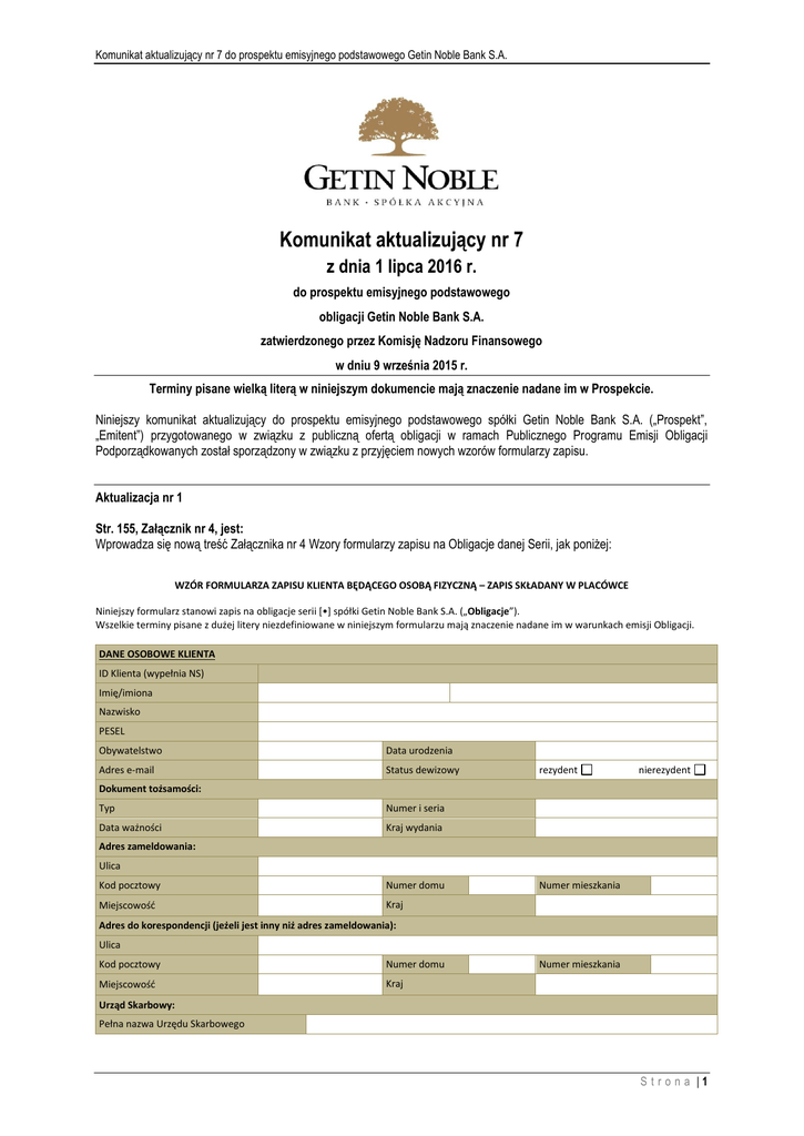 Komunikat aktualizujący nr 7 do prospektu emisyjnego podstawowego Getin Noble Bank S.A. Komunikat aktualizujący nr 7 z dnia 1 lipca 2016 r. do prospektu emisyjnego podstawowego obligacji Getin Noble Bank S.A. zatwierdzonego przez Komisję Nadzoru Finansowego w dniu 9 września 2015 r. Terminy pisane wielką literą w niniejszym dokumencie mają znaczenie nadane im w Prospekcie. Niniejszy komunikat aktualizujący do prospektu emisyjnego podstawowego spółki Getin Noble Bank S.A. („Prospekt”, „Emitent”) przygotowanego w związku z publiczną ofertą obligacji w ramach Publicznego Programu Emisji Obligacji Podporządkowanych został sporządzony w związku z przyjęciem nowych wzorów formularzy zapisu. Aktualizacja nr 1 Str. 155, Załącznik nr 4, jest: Wprowadza się nową treść Załącznika nr 4 Wzory formularzy zapisu na Obligacje danej Serii, jak poniżej: WZÓR FORMULARZA ZAPISU KLIENTA BĘDĄCEGO OSOBĄ FIZYCZNĄ – ZAPIS SKŁADANY W PLACÓWCE Niniejszy formularz stanowi zapis na obligacje serii [•] spółki Getin Noble Bank S.A. („Obligacje”). Wszelkie terminy pisane z dużej litery niezdefiniowane w niniejszym formularzu mają znaczenie nadane im w warunkach emisji Obligacji. DANE OSOBOWE KLIENTA ID Klienta (wypełnia NS) Imię/imiona Nazwisko PESEL Obywatelstwo Data urodzenia Adres e-mail Status dewizowy rezydent nierezydent Dokument tożsamości: Typ Numer i seria Data ważności Kraj wydania Adres zameldowania: Ulica Kod pocztowy Numer domu Miejscowość Kraj Numer mieszkania Adres do korespondencji (jeżeli jest inny niż adres zameldowania): Ulica Kod pocztowy Numer domu Miejscowość Kraj Numer mieszkania Urząd Skarbowy: Pełna nazwa Urzędu Skarbowego S t r o n a |1 Komunikat aktualizujący nr 7 do prospektu emisyjnego podstawowego Getin Noble Bank S.A. DANE OSOBY FIZYCZNEJ REPREZENTUJĄCEJ KLIENTA PRZY SKŁADANIU ZAPISU ! Wypełnia się wyłącznie, jeżeli przy złożeniu niniejszego formularza Klient reprezentowany jest przez pełnomocnika ! Imię/imiona Nazwisko PESEL Obywatelstwo Data urodzenia Dokument tożsamości: Typ Numer i seria Data ważności Kraj wydania Adres zameldowania: Ulica Kod pocztowy Numer domu Miejscowość Kraj Numer mieszkania ZAPIS NA OBLIGACJE Liczba Obligacji, na które składany jest zapis Słownie Cena jednostkowa (cena emisyjna/sprzedaży) Słownie Kwota prowizji maklerskiej ([•]%) Słownie Łączna kwota wpłaty na Obligacje Słownie WPŁATA NA OBLIGACJE Przelew na rachunek bankowy Noble Securities S.A. o numerze [•] W przypadku przelewu na rachunek bankowy w tytule przelewu należy podać następujący kod: obciążenie rachunku pieniężnego służącego do obsługi należącego do Klienta rachunku papierów wartościowych prowadzonego przez Noble Securities S.A o numerze ZWROT NADPŁACONYCH ŚRODKÓW PIENIĘŻNYCH, W PRZYPADKU WYSTĄPIENIA NADPŁATY Rodzaj rachunku (RPW – rachunek papierów wartościowych prowadzony przez Noble Securities S.A.; RB – rachunek bankowy) Numer ww. rachunku Klienta Podmiot prowadzący ww. rachunek WYPŁATA ŚWIADCZEŃ Z OBLIGACJI W przypadku, gdy w dniu wypłaty świadczeń z Obligacji Obligacje nie będą zapisane na rachunku papierów wartościowych obligatariusza, wypłata wszelkich świadczeń z Obligacji (w tym m.in. odsetek, kwoty wykupu, kwoty premii, o ile będzie przysługiwała) będzie następowała na poniższy rachunek bankowy należący do Klienta ( ! Niniejsza dyspozycja ma również zastosowanie do obligacji zapisanych na Koncie Sponsora Emisji ! ) Numer rachunku bankowego Klienta Podmiot prowadzący ww. rachunek DEPONOWANIE OBLIGACJI NA RACHUNKU PAPIERÓW WARTOŚCIOWYCH W przypadku, gdy przydzielone Klientowi Obligacje zostaną zarejestrowane w Krajowym Depozycie Papierów Wartościowych S.A., zostaną one zdeponowane na niżej wskazanym rachunku papierów wartościowych należącym do Klienta ! W przypadku, gdy Warunki Emisji nie przewidują, że Obligacje zostaną zdematerializowane w rozumieniu właściwych przepisów ustawy o obrocie instrumentami finansowymi, tj. zarejestrowane w Krajowym Depozycie Papierów Wartościowych S.A., podanie numeru rachunku papierów wartościowych nie jest wymagane (nie odniesie skutku w postaci zapisania tych Obligacji na rachunku papierów wartościowych Klienta) ! Numer rachunku papierów wartościowych Klienta Podmiot prowadzący ww. rachunek S t r o n a |2 Komunikat aktualizujący nr 7 do prospektu emisyjnego podstawowego Getin Noble Bank S.A. OŚWIADCZENIA KLIENTA Jeżeli z kontekstu nie wynika inaczej, wyrażenia użyte poniżej w liczbie pojedynczej odnoszą się również do liczby mnogiej i odwrotnie Klient oświadcza, że: • w celu wzięcia udziału w Ofercie, w tym w zakresie niezbędnym do przeprowadzenia Oferty i złożenia zapisów na Obligacje, oraz w zakresie niezbędnym do późniejszej realizacji świadczeń wynikających z Obligacji w przypadku ich przydzielenia Klientowi, dobrowolnie przekazał dane osobowe i wyraził zgodę na ich przetwarzanie przez NS oraz Emitenta będącymi administratorem danych osobowych; • został poinformowany, że przysługuje mu prawo dostępu do jego danych osobowych i ich poprawiania; • powyższe dane są aktualne i zobowiązuje się do niezwłocznego uaktualnienia powyższych danych w przypadku jakiejkolwiek ich zmiany; • miał możliwość zapoznania się z Prospektem emisyjnym przed podjęciem decyzji inwestycyjnej; • zapoznał się z treścią Prospektu i akceptuje w szczególności Warunki Emisji, warunki oferty Obligacji, a także ryzyka (czynniki ryzyka), które zostały opisane przez Emitenta w Prospekcie emisyjnym; • zapoznał się z zasadami przydziału Obligacji i akceptuje możliwość, że nie zostanie mu przydzielona ani jedna Obligacja; • został poinformowany o charakterze nabywanych instrumentów finansowych; • jest osobą, która zgodnie z przepisami prawa obowiązującego w kraju, którego jest rezydentem, może wziąć udział w ofercie Obligacji