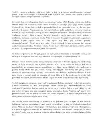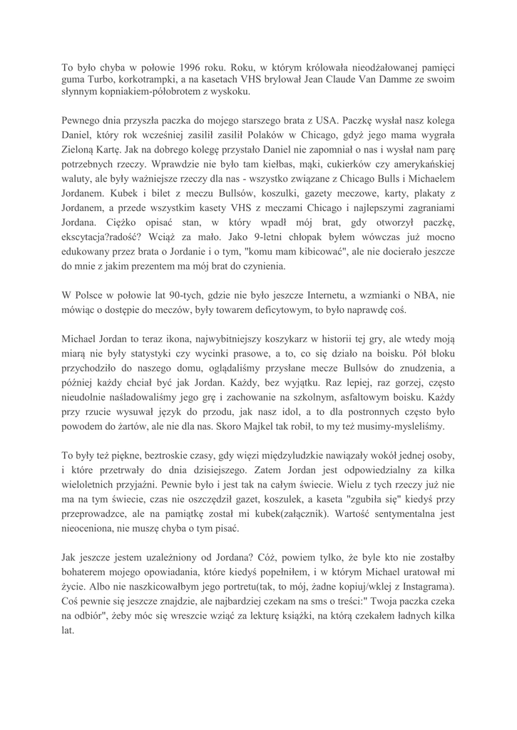 To było chyba w połowie 1996 roku. Roku, w którym królowała nieodżałowanej pamięci guma Turbo, korkotrampki, a na kasetach VHS brylował Jean Claude Van Damme ze swoim słynnym kopniakiem-półobrotem z wyskoku. Pewnego dnia przyszła paczka do mojego starszego brata z USA. Paczkę wysłał nasz kolega Daniel, który rok wcześniej zasilił zasilił Polaków w Chicago, gdyż jego mama wygrała Zieloną Kartę. Jak na dobrego kolegę przystało Daniel nie zapomniał o nas i wysłał nam parę potrzebnych rzeczy. Wprawdzie nie było tam kiełbas, mąki, cukierków czy amerykańskiej waluty, ale były ważniejsze rzeczy dla nas - wszystko związane z Chicago Bulls i Michaelem Jordanem. Kubek i bilet z meczu Bullsów, koszulki, gazety meczowe, karty, plakaty z Jordanem, a przede wszystkim kasety VHS z meczami Chicago i najlepszymi zagraniami Jordana. Ciężko opisać stan, w który wpadł mój brat, gdy otworzył paczkę, ekscytacja?radość? Wciąż za mało. Jako 9-letni chłopak byłem wówczas już mocno edukowany przez brata o Jordanie i o tym, "komu mam kibicować", ale nie docierało jeszcze do mnie z jakim prezentem ma mój brat do czynienia. W Polsce w połowie lat 90-tych, gdzie nie było jeszcze Internetu, a wzmianki o NBA, nie mówiąc o dostępie do meczów, były towarem deficytowym, to było naprawdę coś. Michael Jordan to teraz ikona, najwybitniejszy koszykarz w historii tej gry, ale wtedy moją miarą nie były statystyki czy wycinki prasowe, a to, co się działo na boisku. Pół bloku przychodziło do naszego domu, oglądaliśmy przysłane mecze Bullsów do znudzenia, a później każdy chciał być jak Jordan. Każdy, bez wyjątku. Raz lepiej, raz gorzej, często nieudolnie naśladowaliśmy jego grę i zachowanie na szkolnym, asfaltowym boisku. Każdy przy rzucie wysuwał język do przodu, jak nasz idol, a to dla postronnych często było powodem do żartów, ale nie dla nas. Skoro Majkel tak robił, to my też musimy-mysleliśmy. To były też piękne, beztroskie czasy, gdy więzi międzyludzkie nawiązały wokół jednej osoby, i które przetrwały do dnia dzisiejszego. Zatem Jordan jest odpowiedzialny za kilka wieloletnich przyjaźni. Pewnie było i jest tak na całym świecie. Wielu z tych rzeczy już nie ma na tym świecie, czas nie oszczędził gazet, koszulek, a kaseta "zgubiła się" kiedyś przy przeprowadzce, ale na pamiątkę został mi kubek(załącznik). Wartość sentymentalna jest nieoceniona, nie muszę chyba o tym pisać. Jak jeszcze jestem uzależniony od Jordana? Cóż, powiem tylko, że byle kto nie zostałby bohaterem mojego opowiadania, które kiedyś popełniłem, i w którym Michael uratował mi życie. Albo nie naszkicowałbym jego portretu(tak, to mój, żadne kopiuj/wklej z Instagrama). Coś pewnie się jeszcze znajdzie, ale najbardziej czekam na sms o treści:" Twoja paczka czeka na odbiór", żeby móc się wreszcie wziąć za lekturę książki, na którą czekałem ładnych kilka lat.