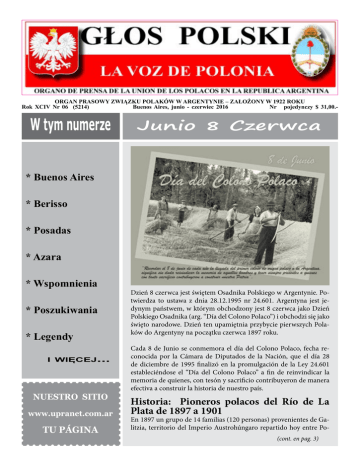 ORGAN PRASOWY ZWIĄZKU POLAKÓW W ARGENTYNIE – ZAŁOŻONY W 1922 ROKU Rok XCIV Nr 06 (5214) Buenos Aires, junio - czerwiec 2016 Nr pojedynczy $ 31,00.- W tym numerze Junio 8 Czerwca * Buenos Aires * Berisso * Posadas * Azara * Wspomnienia * Poszukiwania * Legendy i więcej... NUESTRO SITIO www.upranet.com.ar TU PÁGINA Dzień 8 czerwca jest świętem Osadnika Polskiego w Argentynie. Potwierdza to ustawa z dnia 28.12.1995 nr 24.601. Argentyna jest jedynym państwem, w którym obchodzony jest 8 czerwca jako Dzień Polskiego Osadnika (arg. “Día del Colono Polaco”) i obchodzi się jako święto narodowe. Dzień ten upamiętnia przybycie pierwszych Polaków do Argentyny na początku czerwca 1897 roku. Cada 8 de Junio se conmemora el día del Colono Polaco, fecha reconocida por la Cámara de Diputados de la Nación, que el día 28 de diciembre de 1995 finalizó en la promulgación de la Ley 24.601 estableciéndose el “Día del Colono Polaco” a fin de reinvindicar la memoria de quienes, con tesón y sacrificio contribuyeron de manera efectiva a construir la historia de nuestro país. Historia: Pioneros polacos del Río de La Plata de 1897 a 1901 En 1897 un grupo de 14 familias (120 personas) provenientes de Galitzia, territorio del Imperio Austrohúngaro repartido hoy entre Po(cont. en pag. 3) Str. 2 Głos Polski Buenos Aires, Nr 06 / 2016 Un lugar de encuentro para los polacos El domingo 5 de junio se realizó el Buenos Aires Celebra Polonia edición 2016, el evento que reúne a la comunidad polaca de la Ciudad, sus alrededores y algunas organizaciones del interior del país. Fot. H. Kozłowski El Gobierno de la Ciudad de Buenos Aires y la Unión de los Polacos de la República Argentina, volvieron a organizar la fiesta que permite a la colectividad mostrar su cultura y tradiciones. Desfile, bailes folclóricos, música, canciones, platos típicos y artesanías, son algunas de las atracciones que brinda este evento al público, que está integrado por descendientes de polacos y también por muchos familiares, amigos y personas interesadas en conocer las tradiciones. La colectividad polaca está compuesta por una gran cantidad de organizaciones, la gran mayoría nucleadas dentro de la Unión de los Polacos. Cada una realiza su esfuerzo para mantener vivas las tradiciones, difundir lo polaco y generar un espacio de participación y encuentro para sus miembros. El Buenos Aires Celebra permite juntar la participación de los clubes para crear un día dedicado íntegramente a Polonia. Con sus bailes, volvieron a hacerse presentes el conjunto Nasz Balet, el Nasz Balecik y el Starszy Nasz Balet; de La Plata el balet “Bracia Polskie”; de San Martín el “Balet Zaloty”; y de Rosario los conjuntos “Wesoly Balet” y “Ziemia Polska”. Además, la Asociación “Polska Concordia” acompañó el desfile de entrada por la Avenida de Mayo con una representación del Corpus Christi, y también formó parte de la apertura el Harcerstwo Polskie, los scouts polacos. La música contó con un papel importante en el evento. Julia Bielewicz se presentó junto con sus músicos, y cerca del final interpretó canciones tradicionales junto a miembros de la colectividad que se reunieron para cantar, acompañados por el acordeón. En esta edición del Buenos Aires Celebra, se aprovechó para festejar (5214) y conmemorar el 90º Aniversario de la Unión de los Polacos en la República Argentina, que desde 1926 reúne a los polacos y sus organizaciones. Los visitantes pudieron elegirvarios platos de la rica grastronomía para comer, llevarse recuerdos o recibir información entre una variada oferta de stands, armados y atendidos por el Nasz Balet, los Círculos de Amigos de los Scouts (KPH) de Maciaszkowo, del Circulo Juvenil Polaco (POM) y de Quilmes, la Asociación Ognisko Polskie, la Asociación de Estudiantes Polacos, la Biblioteca Domeyko, la Asociación Cultural Argentino-Polaca y el Círculo Cultural Polonés de La Plata, como también el stand de la Unión de los Polacos, en el que se brindaba información sobre nuestras actividades . Además de los bailarines y músicos, al escenario subieron las autoridades, que mostraron su alegría por la posibilidad de este encuentro. Estuvieron presentes el Embajador Polaco, Marek Pernal; la Sra. Cónsul Joanna Addeo Krajewska, el actual Director de Colectividades de la Ciudad, Adrián Varela; la Subsecretaria de Derechos Humanos y Pluralismo Cultural de la Ciudad, Pamela Malewicz; el Presidente de la Federación Argentina de Colectividades, Juan Sarrafián y el Vicepresidente de la UPRA, Zbystaw Konopka. Realizamos un especial agradecimiento a la Asociación Polska Concordia, que nos acompaña hace un par de años ya y vienen desde lejos. En el desfile representaron uno de los momentos significativos dentro de las tradiciones polacas, que es el Corpus Christi. En la columna de adelante, un niño portaba una reliquia de segundo grado, compuesta por un trozo de la túnica de Juan Pablo II, seguida de la imagen de La Virgen de Czestochowa, patrona de Polonia. Atrás llevaban la primera imagen de carácter público de San Juan Pablo II, la cual fue traída a Concordia desde Oberá, Misiones, e integrantes de la asociación acompañaron con palmas polacas. Agradecemos al Gobierno de la Ciudad de Buenos Aires, que año tras año nos permite manifestarnos y mostrar nuestra cultura, y a todos los que participaron en el evento: a los conjuntos de baile, en especial a los que vinieron de lejos, a los grupos de canto, a los que participaron con sus stands, al público en general, el aporte de cada uno permite realizar este festejo en el que nos volvemos a encontrar cada año en comunidad para mostrar con mucho orgullo que somos polacos. Equipo Organizador del Buenos Aires Celebra Polonia (5214) Głos Polski Buenos Aires, Nr 06 / 2016 BUENOS AIRES CELEBRA POLONIA 2016 Fe de erratas Str. 3 contratiempos, las ansiedades, los nervios de último momento hemos dejado u