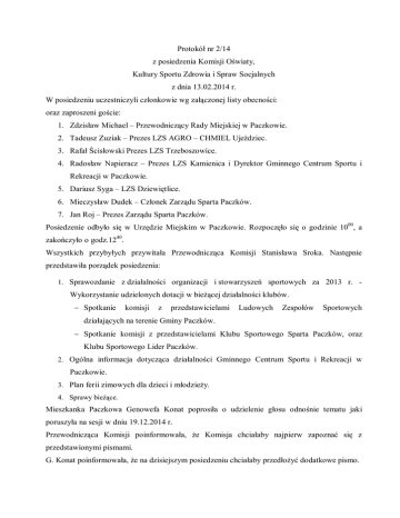 Protokół nr 2/14 z posiedzenia Komisji Oświaty, Kultury Sportu Zdrowia i Spraw Socjalnych z dnia 13.02.2014 r. W posiedzeniu uczestniczyli członkowie wg załączonej listy obecności: oraz zaproszeni goście: 1. Zdzisław Michael – Przewodniczący Rady Miejskiej w Paczkowie. 2. Tadeusz Zuziak – Prezes LZS AGRO – CHMIEL Ujeździec. 3. Rafał Ścisłowski Prezes LZS Trzeboszowice. 4. Radosław Napieracz – Prezes LZS Kamienica i Dyrektor Gminnego Centrum Sportu i Rekreacji w Paczkowie. 5. Dariusz Syga – LZS Dziewiętlice. 6. Mieczysław Dudek – Członek Zarządu Sparta Paczków. 7. Jan Roj – Prezes Zarządu Sparta Paczków. Posiedzenie odbyło się w Urzędzie Miejskim w Paczkowie. Rozpoczęło się o godzinie 1000, a zakończyło o godz.1240. Wszystkich przybyłych przywitała Przewodnicząca Komisji Stanisława Sroka. Następnie przedstawiła porządek posiedzenia: 1. Sprawozdanie z działalności organizacji i stowarzyszeń sportowych za 2013 r. - Wykorzystanie udzielonych dotacji w bieżącej działalności klubów. − Spotkanie komisji z przedstawicielami Ludowych Zespołów Sportowych działających na terenie Gminy Paczków. − Spotkanie komisji z przedstawicielami Klubu Sportowego Sparta Paczków, oraz Klubu Sportowego Lider Paczków. 2. Ogólna informacja dotycząca działalności Gminnego Centrum Sportu i Rekreacji w Paczkowie. 3. Plan ferii zimowych dla dzieci i młodzieży. 4. Sprawy bieżące. Mieszkanka Paczkowa Genowefa Konat poprosiła o udzielenie głosu odnośnie tematu jaki poruszyła na sesji w dniu 19.12.2014 r. Przewodnicząca Komisji poinformowała, że Komisja chciałaby najpierw zapoznać się z przedstawionymi pismami. G. Konat poinformowała, że na dzisiejszym posiedzeniu chciałaby przedłożyć dodatkowe pismo. Przewodnicząca Komisji poprosiła o przedłożenie pism, żeby Komisja mogła się z nimi zapoznać. Z. Michael poinformował, że każdy obywatel ma prawo uczestniczyć w posiedzeniach. Pisma natomiast należy kierować za pośrednictwem sekretariatu. Przewodnicząca Komisji dodała, że taki jest obieg dokumentów, że najpierw pisma wpływają na dziennik urzędowy i następnie są rozpisywane i kierowane do Wydziałów. G. Konat poinformowała, że pisma zostawi w biurze podawczym Urzędu. Przewodnicząca Komisji zadała pytanie czy Komisja zatwierdza Protokół nr 1/14 z dnia 16 stycznia 2014 r? Komisja w wyniku glosowania jednogłośnie zatwierdziła Protokół nr 1/14 z dnia z dnia 16.01.2014 r. Do pkt 1. Przewodnicząca Komisji poprosiła zaproszonych gości o przedstawienie sprawozdań z działalności organizacji i stowarzyszeń sportowych za 2013 r. Wykorzystanie udzielonych dotacji w bieżącej działalności klubów. Jan Roj przedstawił sprawozdanie z działalności Klubu Sportowego Sparta Paczków, które stanowi załącznik do niniejszego protokołu. Poinformował, że sprawozdanie zostało złożone w Urzędzie. Plan zadań prawie w 100% został wykonany. Są dwie sekcje: jedna piłki nożnej gdzie działa 5 grup młodzieżowych i grupa seniorska i sekcja siatkówki, gdzie działają trzy grupy. W Klubie ćwiczy z różnym natężeniem około 170 osób. Najmłodsza grupa to są przedszkolaki rocznik 2007 – 2008, jest tam około 20 dzieci. Grupę prowadzi trener Marcin Krótkiewicz. Ubyła natomiast grupa juniorów młodszych. Kolejna grupa to żacy rocznik 2005 – 2006, zapisanych jest 16 dzieci. Trzecia grupa to orliki rocznik 2004 – 2005, grupę prowadzi p. Gardanowicz zawodnik Klubu. Do tej grupy uczęszcza 26 zawodników. Kolejna grupa to młodzicy prowadzeni przez Z. Drobnego. Do grupy uczęszcza 20 zawodników rocznik 2001 – 2002. Kolejna grupa to trampkarze prowadzi ją Ł. Krótkiewicz. Jest to liczna grupa rocznik 99 i młodsi. Grupę tą utworzono wspólnie z LZS Trzeboszowice. Była grupa juniorów młodszych rocznik 1997 i młodsi, ale ze względu na mało stabilną grupę, część zawodników przeniosła się do Pruszkowa zrezygnowano z prowadzenia tej grupy i w zamian za to wprowadzono przedszkolaków. Ostatnia grupa to grupa seniorów, którą prowadzi p. M. Krótkiewicz zaangażowanych jest 22 zawodników. Zespół jest na I miejscu IV Ligii najwyższej na Opolszczyźnie. Są też 2 grupy piłki siatkowej, które prowadzi J. Soszek młodziczek i kadetek. Drogą grupę prowadzi R. Cygler trenuje u niego około 20 dziewcząt z rocznika 2001 i młodsze. W sumie ćwiczy około 50 dziewcząt. Jeśli chodzi o wykonanie zadań to plan budżetowy został wykonany. Wydatków było więcej niż planowano, ale mieli trochę większe dochody własne. Wydatki to przede wszystkim koszt trenerów, opłaty sędziowskie, zwrot kosztów zawodników, obsługa Klubu. Dotacja wyniosła 170 tyś zł. Miał nadzieję, że sposób rozliczania wydatków się zmieni. Zawsze trzeba było wydać pieniądze, bo niewykorzystane trzeba zwrócić, a w kolejnym roku tych pieniędzy się nie dostanie. W Klubie patrzą na każdy grosz. Skarbnik Klubu pilnuje wydatków i środki na pewno zostały wydane racjonalnie. Lekkim mankamentem jest sprawa stadionu. W pierwszym półroczu borykali się z problemami współpracy z ZUKiM-em, który zarządzał stadionem. Stadion został przekazany do GCSiR i teraz współpraca jest diametralnie inna. Utrzymanie stadionu kosztuje. Płyta stadionu musi być koszona co tydzień, musi być nawożona. Żeby Klub mógł funkcjonować z taką intensywnością jaka jest potrzebna, to musielibyśmy mieć do dyspozycji przynajmniej 3 płyty. Boisko boczne zostało zrujnowane przez występy w ciągu roku. Ogólnie w Polsce jest małe zrozumienie, trzeba zrobić imprezę i jest decyzja, że robi się ją na boisku. Jeżeli boisko jest źle przygotowane to są kontuzje, a nie o to chodzi. Dzięki temu, że Sparta jest na poziomie IV Ligowym jest jedną z lepszych promocji miasta. Organizacje meczów muszą spełniać określone wymogi. Żeby prowadzić spikerkę trzeba mieć licencję, trzeba ją opłac