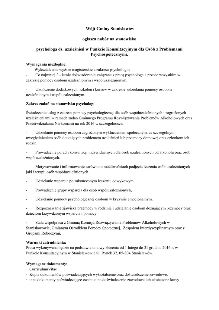Wójt Gminy Stanisławów ogłasza nabór na stanowisko psychologa ds. uzależnień w Punkcie Konsultacyjnym dla Osób z Problemami Psychospołecznymi. Wymagania niezbędne: Wykształcenie wyższe magisterskie z zakresu psychologii; Co najmniej 2 - letnie doświadczenie związane z pracą psychologa a przede wszystkim w zakresie pomocy osobom uzależnionym i współuzależnionym. Ukończenie dodatkowych szkoleń i kursów w zakresie udzielania pomocy osobom uzależnionym i współuzależnionym. Zakres zadań na stanowisku psycholog: Świadczenie usług z zakresu pomocy psychologicznej dla osób współuzależnionych i zagrożonych uzależnieniami w ramach zadań Gminnego Programu Rozwiązywania Problemów Alkoholowych oraz Przeciwdziałania Narkomanii na rok 2016 w szczególności: Udzielanie pomocy osobom zagrożonym wykluczeniem społecznym, ze szczególnym uwzględnieniem osób dotkniętych problemem uzależnień lub przemocy domowej oraz członkom ich rodzin. Prowadzenie porad i konsultacji indywidualnych dla osób uzależnionych od alkoholu oraz osób współuzależnionych. Motywowanie i informowanie zarówno o możliwościach podjęcia leczenia osób uzależnionych jaki i terapii osób współuzależnionych. - Udzielanie wsparcia po zakończonym leczeniu odwykowym. - Prowadzenie grupy wsparcia dla osób współuzależnionych, - Udzielanie pomocy psychologicznej osobom w kryzysie emocjonalnym. Rozpoznawanie zjawiska przemocy w rodzinie i udzielanie osobom doznającym przemocy oraz dzieciom krzywdzonym wsparcia i pomocy. Stała współpraca z Gminną Komisją Rozwiązywania Problemów Alkoholowych w Stanisławowie, Gminnym Ośrodkiem Pomocy Społecznej, Zespołem Interdyscyplinarnym oraz z Grupami Roboczymi. Warunki zatrudnienia: Praca wykonywana będzie na podstawie umowy zlecenia od 1 lutego do 31 grudnia 2016 r. w Punkcie Konsultacyjnym w Stanisławowie ul. Rynek 32, 05-304 Stanisławów. Wymagane dokumenty: · CurriculumVitae · Kopia dokumentów poświadczających wykształcenie oraz doświadczenie zawodowe. · inne dokumenty poświadczające ewentualne doświadczenie zawodowe lub ukończone kursy czy szkolenia, · Oświadczenie zawierające zgodę na przetwarzanie danych osobowych zgodnie z ustawą z dnia 29 sierpnia 1997 roku o ochronie danych osobowych (Dz.U. z 2015r. poz. 2135 z późn. zm.) na potrzeby związane z ogłoszonym naborem. Powyższe dokumenty należy złożyć w zamkniętej kopercie w sekretariacie Urzędu Gminy p. nr. 19 lub przesłać pocztą na adres: Urząd Gminy Stanisławów ul. Rynek 32, 05-304 Stanisławów w terminie do dnia 22 stycznia 2016 r. do godz. 14.00. Koperta zawierająca aplikację powinna być opatrzona adnotacją : Nabór-psycholog ds. uzależnień. Oferty, które wpłyną po wyżej określonym terminie nie będą rozpatrywane i odesłane zostaną adresatowi. Informujemy, że skontaktujemy się tylko z wybranymi kandydatami. Informacje szczegółowe odnośnie konkursu można uzyskać osobiście w pok. nr 7 Urzędu Gminy lub telefonicznie 25 757 58 74.