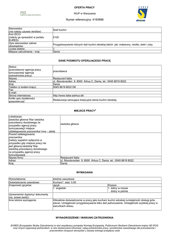 OFERTA PRACY WUP w Warszawie Numer referencyjny: 4193696 Stanowisko: (nie należy używać skrótów) Kod ISCO: (należy go sprawdzić w portalu EURES) Opis stanowiska/ zakres obowiązków: Liczba etatów: Miejsce zatrudnienia – kraj: Szef kuchni 5120 Przygotowywanie różnych dań kuchni włoskiej takich jak: makarony, risotto, steki i ryby. 1 Dania DANE PODMIOTU OFERUJĄCEGO PRACĘ Status: (pracodawca/ agencja pracy tymczasowej/ agencja pośrednictwa pracy) Nazwa: Adres: Kraj: Telefon (z kodem kraju): Fax: E-mail: Strona internetowa: Krótki opis działalności gospodarczeji: pracodawca Restaurant Italia ul. Åboulevarden 9, 8000 Århus C, Dania, tel.: 0045 8619 8022 Dania 0045 8619 8022 DK http://www.italia-aarhus.dk/ Restauracja serwująca tradycyjne dania kuchni włoskiej. MIEJSCE PRACYii Lokalizacja: [siedziba główna/ filia/ siedziba pracodawcy docelowego (w przypadku agencji pracy tymczasowej)/ miejsce oddelegowania pracownika/ inne – jakie] Powód oddelegowania pracownika: [należy wypełnić wyłącznie w przypadku gdy miejsce pracy nie jest główną siedzibą/ filią/ siedzibą pracodawcy docelowego (w przypadku agencji pracy tymczasowej)] Nazwa firmy: Adres: Kraj: siedziba główna Restaurant Italia ul. Åboulevarden 9, 8000 Århus C, Dania, tel.: 0045 8619 8022 Dania WYMAGANIA Wykształcenie: Doświadczenie zawodowe: Znajomość języków: Uprawnienia/ dyplomy/ dokumenty (np. prawo jazdy): Inne istotne wymagania: średnie zawodowe Kucharz*, staż: 5.00 Język 1. angielski Poziom 1. dobry w mowie dobry w piśmie Kilkuletnie doświadczenie w pracy jako kucharz kuchni włoskiej (umiejętność obsługi grila, pieca). Umiejętność przygotowywania kilku dań jednocześnie. Umiejętność szybkiej pracy w warunkach stresu. WYNAGRODZENIE I WARUNKI ZATRUDNIENIA EURES (Europejskie Służby Zatrudnienia) to sieć współpracy pomiędzy Komisją Europejską, Publicznymi Służbami Zatrudnienia krajów UE/ EOG oraz innych organizacji partnerskich, w celu dostarczania informacji, usług pośrednictwa pracy i poradnictwa zawodowego dla pracodawców i pracowników chcących skorzystać z zasady wolnego przepływu osób Wysokość pensji brutto: Wysokość pensji netto: Waluta, w jakiej wypłacana jest pensja: Rodzaj stawki wynagrodzenia: (godzinowa/ tygodniowa/ miesięczna/ roczna/ inna) Premie: Dodatkowe świadczenia (zakwaterowanie, wyżywienie, koszty związane ze zmianą miejsca zamieszkania, koszty podróży itp.): Nazwa firmy, z którą zostanie podpisana umowa: Rodzaj umowy: (umowa o pracę, umowa zlecenia, wolontariat, praktyka zawodowa/ staż, praca zdalna, agencja pracy tymczasowej, inne): Wymiar czasu pracy (praca na pełen etat/ część etatu): Czas trwania umowy: (nieokreślony/ określony) 2.882,00 Liczba godzin tygodniowo: Zmiany i praca w dni wolne: Data rozpoczęcia: Inne informacje: 37,00 - Euro Czasowy ze stawką miesięczną Restaurant Italia umowa o pracę Pełen nieokreślony Data wygaśnięcia umowy (w przypadku umowy na czas określony): Dodatkowo do wynagrodzenia przysługuje: 13,5% dodatku do urlopu wypoczynkowego 8% dodatku do emerytury SPOSÓB SKŁADANIA WNIOSKU Wymagane dokumenty (list motywacyjny, CV itp.): Język, w którym muszą być sporządzone przedkładane dokumenty: Do kogo należy wysłać dokumenty: (do pracodawcy/ doradcy EURES) Gdzie należy wysłać dokumenty: (adres, adres e-mail, nr faksu z kodem kraju itp.) Dane teleadresowe doradcy EURES lub przedstawiciela pracodawcy: (nazwisko, adres, telefon, fax, e-mail itp.) CV angielski do pracodawcy E-mail Cecilia Capuzzi [email protected] DODATKOWE INFORMACJE Praca długoterminowa od zaraz. WAŻNOŚĆ 2016-05-18 Data publikacji: Termin przedkładania podań o pracę / 2016-10-07 zakończenia ważności oferty: Uprzejmie informujemy, że skontaktujemy się wyłącznie z wybranymi kandydatami. UWAGA: 1. Umowa z zagranicznym pracodawcą jest zawierana, co do zasady, zgodnie z prawem kraju zatrudnienia. Oznacza to, że wszystkie roszczenia odnośnie warunków, które obejmuje umowa, można kierować wyłącznie do odpowiedniego sądu w kraju zatrudnienia. Publiczne służby zatrudnienia (EURES) nie mogą pośredniczyć ani reprezentować pracownika w sądzie kraju zatrudnienia w przypadku sporu z pracodawcą. 2. Publiczne służby zatrudnienia (EURES) dokładają wszelkich starań, aby zapewnić rzetelność i wiarygodność ofert pracy zgłoszonych w lokalnym urzędzie pracy. Należy wyjaśnić, że oferta pracy została zgłoszona przez stronę trzecią i EURES nie odpowiada za ewentualne rozbieżności między warunkami pracy określonymi w ofercie pracy i warunkami oferowanymi przez potencjalnego pracodawcę. 3. Publiczne służby zatrudnienia (EURES) informują, że będą zbierać, przetwarzać i przekazywać potencjalnym pracodawcom zgodnie z przepisami dotyczącymi ochrony danych osobowych wszystkie dane osobowe dostarczone przez osoby poszukujące pracy. EURES (Europejskie Służby Zatrudnienia) to sieć współpracy pomiędzy Komisją Europejską, Publicznymi Służbami Zatrudnienia krajów UE/ EOG oraz innych organizacji partnerskich, w celu dostarczania informacji, usług pośrednictwa pracy i poradnictwa zawodowego dla pracodawców i pracowników chcących skorzystać z zasady wolnego przepływu osób i Informacje o firmie, takie jak: status prawny, sektor, typ działalności, rodzaj produktów lub świadczonych usług, data rozpoczęcia działalności gospodarczej, liczba pracowników itp. ii Miejsce, w którym będzie wykonywana praca. Należy wypełnić w przypadku gdy: 1) miejsce wykonywania pracy jest inne niż siedziba podmiotu oferującego pracę, 2) pracę oferuje agencja pośrednictwa pracy/ agencja pracy tymczasowej. EURES (Europejskie Służby Zatrudnienia) to sieć współpracy pomiędzy Komisją Europejską, Publicznymi Służbami Zatrudnienia krajów UE/ EOG oraz innych organizacji partnerskich, w celu dostarczania informacji, usług pośrednictwa pracy i poradnictwa zaw