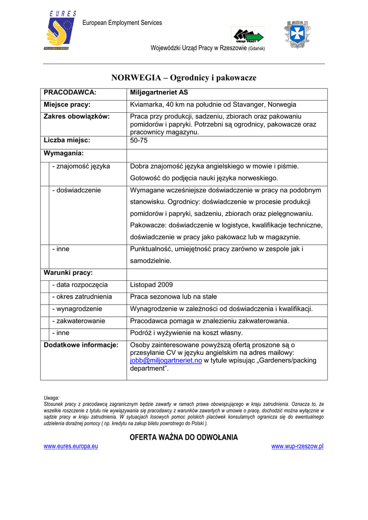 European Employment Services Wojewódzki Urząd Pracy w Rzeszowie (Gdańsk) NORWEGIA – Ogrodnicy i pakowacze PRACODAWCA: Miljøgartneriet AS Miejsce pracy: Kviamarka, 40 km na południe od Stavanger, Norwegia Zakres obowiązków: Praca przy produkcji, sadzeniu, zbiorach oraz pakowaniu pomidorów i papryki. Potrzebni są ogrodnicy, pakowacze oraz pracownicy magazynu. 50-75 Liczba miejsc: Wymagania: - znajomość języka Dobra znajomość języka angielskiego w mowie i piśmie. Gotowość do podjęcia nauki języka norweskiego. - doświadczenie Wymagane wcześniejsze doświadczenie w pracy na podobnym stanowisku. Ogrodnicy: doświadczenie w procesie produkcji pomidorów i papryki, sadzeniu, zbiorach oraz pielęgnowaniu. Pakowacze: doświadczenie w logistyce, kwalifikacje techniczne, doświadczenie w pracy jako pakowacz lub w magazynie. - inne Punktualność, umiejętność pracy zarówno w zespole jak i samodzielnie. Warunki pracy: - data rozpoczęcia Listopad 2009 - okres zatrudnienia Praca sezonowa lub na stałe - wynagrodzenie Wynagrodzenie w zależności od doświadczenia i kwalifikacji. - zakwaterowanie Pracodawca pomaga w znalezieniu zakwaterowania. - inne Podróż i wyżywienie na koszt własny. Dodatkowe informacje: Osoby zainteresowane powyższą ofertą proszone są o przesyłanie CV w języku angielskim na adres mailowy: [email protected] w tytule wpisując „Gardeners/packing department”. Uwaga: Stosunek pracy z pracodawcą zagranicznym będzie zawarty w ramach prawa obowiązującego w kraju zatrudnienia. Oznacza to, że wszelkie roszczenie z tytułu nie wywiązywania się pracodawcy z warunków zawartych w umowie o pracę, dochodzić można wyłącznie w sądzie pracy w kraju zatrudnienia. W sytuacjach losowych pomoc polskich placówek konsularnych ogranicza się do ewentualnego udzielenia doraźnej pomocy ( np. kredytu na zakup biletu powrotnego do Polski ). OFERTA WAŻNA DO ODWOŁANIA www.eures.europa.eu www.wup-rzeszow.pl