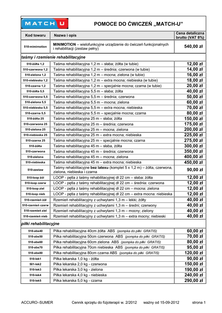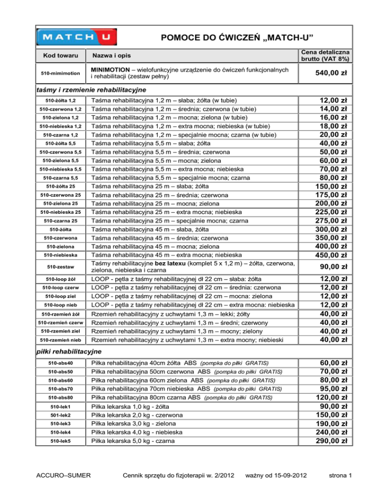POMOCE DO Kod towaru 510-mimimotion WICZE „MATCH-U” Cena detaliczna brutto (VAT 8%) Nazwa i opis MINIMOTION – wielofunkcyjne urz dzenie do wicze funkcjonalnych i rehabilitacji (zestaw pe ny) 540,00 z ta my i rzemienie rehabilitacyjne 510- ta 1,2 510-czerwona 1,2 510-zielona 1,2 510-niebieska 1,2 510-czarna 1,2 510- ta 5,5 510-czerwona 5,5 510-zielona 5,5 510-niebieska 5,5 510-czarna 5,5 510- ta 25 510-czerwona 25 510-zielona 25 510-niebieska 25 510-czarna 25 510- ta 510-czerwona 510-zielona 510-niebieska 510-zestaw 510-loop 510-loop czerw 510-loop ziel 510-loop nieb 510-rzemie 510-rzemie czerw 510-rzemie ziel 510-rzemie nieb Ta ma rehabilitacyjna 1,2 m – s aba; ta (w tubie) Ta ma rehabilitacyjna 1,2 m – rednia; czerwona (w tubie) Ta ma rehabilitacyjna 1,2 m – mocna; zielona (w tubie) Ta ma rehabilitacyjna 1,2 m – extra mocna; niebieska (w tubie) Ta ma rehabilitacyjna 1,2 m – specjalnie mocna; czarna (w tubie) Ta ma rehabilitacyjna 5,5 m – s aba; ta Ta ma rehabilitacyjna 5,5 m – rednia; czerwona Ta ma rehabilitacyjna 5,5 m – mocna; zielona Ta ma rehabilitacyjna 5,5 m – extra mocna; niebieska Ta ma rehabilitacyjna 5,5 m – specjalnie mocna; czarna Ta ma rehabilitacyjna 25 m – s aba; ta Ta ma rehabilitacyjna 25 m – rednia; czerwona Ta ma rehabilitacyjna 25 m – mocna; zielona Ta ma rehabilitacyjna 25 m – extra mocna; niebieska Ta ma rehabilitacyjna 25 m – specjalnie mocna; czarna Ta ma rehabilitacyjna 45 m – s aba, ta Ta ma rehabilitacyjna 45 m – rednia; czerwona Ta ma rehabilitacyjna 45 m – mocna; zielona Ta ma rehabilitacyjna 45 m – extra mocna; niebieska Ta my rehabilitacyjne bez latexu (komplet 5 x 1,2 m) – ta, czerwona, zielona, niebieska i czarna LOOP - p LOOP - p LOOP - p LOOP - p Rzemie Rzemie Rzemie Rzemie tla z ta tla z ta tla z ta tla z ta my rehabilitacyjnej my rehabilitacyjnej my rehabilitacyjnej my rehabilitacyjnej d d d d 22 cm – s aba: ta 22 cm – rednia: czerwona 22 cm – mocna: zielona 22 cm – extra mocna: niebieska rehabilitacyjny z uchwytami 1,3 m – lekki; ty rehabilitacyjny z uchwytami 1,3 m – redni; czerwony rehabilitacyjny z uchwytami 1,3 m – mocny; zielony rehabilitacyjny z uchwytami 1,3 m – extra mocny; niebieski 12,00 z 14,00 z 16,00 z 18,00 z 20,00 z 40,00 z 50,00 z 60,00 z 70,00 z 80,00 z 150,00 z 175,00 z 200,00 z 225,00 z 275,00 z 300,00 z 350,00 z 400,00 z 450,00 z 90,00 z 12,00 z 12,00 z 12,00 z 12,00 z 40,00 z 40,00 z 40,00 z 40,00 z pi ki rehabilitacyjne 510-abs40 510-abs50 510-abs60 510-abs70 510-abs80 510-lek1 501-lek2 510-lek3 510-lek4 510-lek5 ACCURO–SUMER Pi ka rehabilitacyjna 40cm ta ABS (pompka do pi ki GRATIS) Pi ka rehabilitacyjna 50cm czerwona ABS (pompka do pi ki GRATIS) Pi ka rehabilitacyjna 60cm zielona ABS (pompka do pi ki GRATIS) Pi ka rehabilitacyjna 70cm niebieska ABS (pompka do pi ki GRATIS) Pi ka rehabilitacyjna 80cm czarna ABS (pompka do pi ki GRATIS) Pi ka lekarska 1,0 kg ta Pi ka lekarska 2,0 kg - czerwona Pi ka lekarska 3,0 kg - zielona Pi ka lekarska 4,0 kg - niebieska Pi ka lekarska 5,0 kg - czarna Cennik sprz tu do fizjoterapii w. 2/2012 wa ny od 15-09-2012 60,00 z 70,00 z 80,00 z 95,00 z 120,00 z 90,00 z 150,00 z 190,00 z 240,00 z 290,00 z strona 1 przybory do wicze 510-trener 510-podest 510-pó je 510-senso 510-fit33 510-fit36 510-dysk 510-airstep równowagi 100,00 z 100,00 z 40,00 z 110,00 z Trener równowagi 37 x 22 x 6 cm (niebieski) Podest równowa ny – podstawa sferyczna fi 42 x 5/9 cm Podk adka balansowa „pó je ” fi 16 cm Dysk sensoryczny fi 35 cm (niebieski) Dysk korekcyjny fi 33 cm (dost pny w 3 kolorach – do wyboru: niebieski, czerwony, grafitowy) Dysk korekcyjny fi 36 cm (dost pny w 3 kolorach – do wyboru: niebieski, czerwony, grafitowy) Dysk korekcyjny fi 36 cm (niebieski) bez PVC 100,00 z 110,00 z 120,00 z AIRSTEP – wielofunkcyjna urz dzenie treningowe typu BOSU z rzemieniami rehabilitacyjnymi (wym. 61 x 38 x 17 cm) 400,00 z (pompka do pi ki GRATIS) akcesoria dodatkowe 510-obci nik 0,5 510-obci nik 1,0 510-podstawa 510-uchwyty 510-stojak 55,00 z 65,00 z 40,00 z 25,00 z 250,00 z Obci niki na ko czyny (2 x 0,5 kg) Obci niki na ko czyny (2 x 1,0 kg) Podstawka pod pi Uchwyty do ta my rehabilitacyjnej (2 szt.) Stojak na pi ki lekarskie POMOCE ORTOPEDYCZNE I REHABILITACYJNE Kod towaru Cena detaliczna brutto (VAT 8%) Nazwa i opis ta my Kinesiotaping’u 510-tape Oryginalne japo skie ta my (plastry) Kinesiology Tape – dost pne w kolorach: be owy, czerwony, niebieski i czarny. Wymiary: szer.- 5 cm, d .- 5 m 38,00 z pomoce ortopedyczne 510-op_nad 510-ort_nad 510-ort_nad_ex 510-ort_nad_kciuk 510- okie 510-tembuni 510-tembex 510-pasbiod 510-spodenki 510-udo 510-rzepka 510-kolano 510-kolano_ort 510-kolano_ort_zaw 510- ydka 510-kostka 510-kostka_ort 70,00 z 105,00 z 120,00 z 120,00 z 60,00 z 30,00 z 100,00 z 120,00 z 150,00 z 85,00 z 50,00 z 105,00 z 190,00 z 280,00 z 75,00 z 55,00 z 150,00 z Opaska nadgarstkowa Orteza nadgarstkowa Orteza nadgarstkowa EXTRA Orteza nadgarstkowa z uj ciem kciuka Pas okciowy Temblak uniwersalny Temblak Extra Pas krzy owo – biodrowy Spodenki uciskowe Opaska na udo Orteza rzepki Stabilizator stawu kolanowego Orteza stawu kolanowego Orteza zawiasowa stawu kolanowego Opaska na ydk Stabilizator stawu skokowego Orteza stawu skokowego Ceny zosta y obliczone w oparciu o aktualny kurs EURO i mog przypadku nieprzewidzianych, znacznych waha kursowych. ACCURO–SUMER Cennik sprz tu do fizjoterapii w. 2/2012 ulec zmianie w wa ny od 15-09-2012 strona 2
