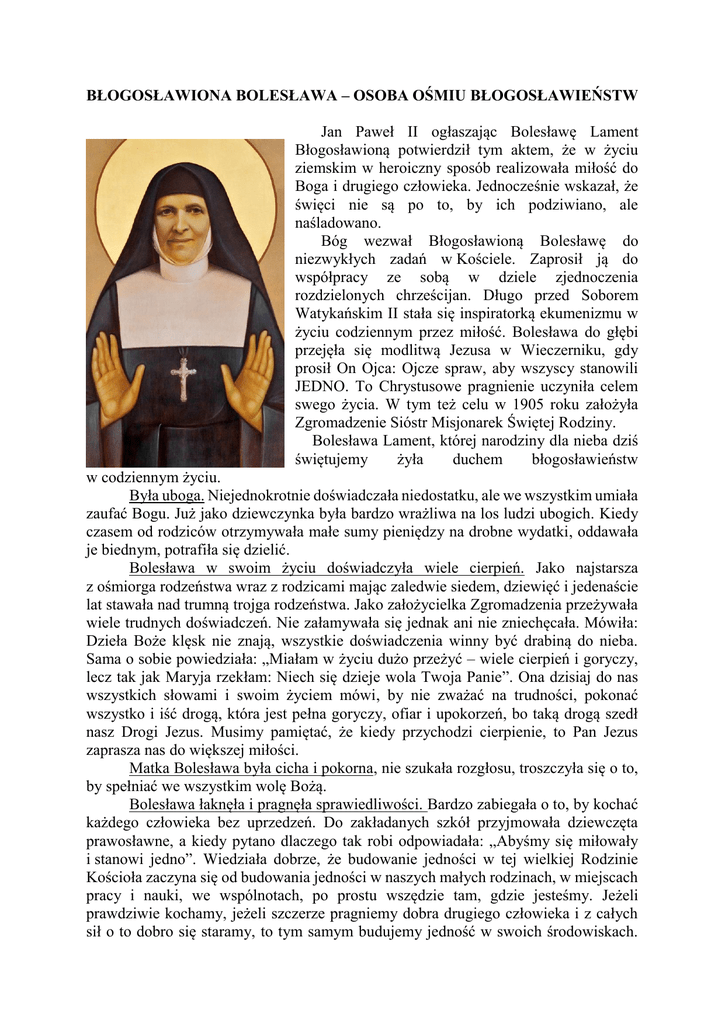 BŁOGOSŁAWIONA BOLESŁAWA – OSOBA OŚMIU BŁOGOSŁAWIEŃSTW Jan Paweł II ogłaszając Bolesławę Lament Błogosławioną potwierdził tym aktem, że w życiu ziemskim w heroiczny sposób realizowała miłość do Boga i drugiego człowieka. Jednocześnie wskazał, że święci nie są po to, by ich podziwiano, ale naśladowano. Bóg wezwał Błogosławioną Bolesławę do niezwykłych zadań w Kościele. Zaprosił ją do współpracy ze sobą w dziele zjednoczenia rozdzielonych chrześcijan. Długo przed Soborem Watykańskim II stała się inspiratorką ekumenizmu w życiu codziennym przez miłość. Bolesława do głębi przejęła się modlitwą Jezusa w Wieczerniku, gdy prosił On Ojca: Ojcze spraw, aby wszyscy stanowili JEDNO. To Chrystusowe pragnienie uczyniła celem swego życia. W tym też celu w 1905 roku założyła Zgromadzenie Sióstr Misjonarek Świętej Rodziny. Bolesława Lament, której narodziny dla nieba dziś świętujemy żyła duchem błogosławieństw w codziennym życiu. Była uboga. Niejednokrotnie doświadczała niedostatku, ale we wszystkim umiała zaufać Bogu. Już jako dziewczynka była bardzo wrażliwa na los ludzi ubogich. Kiedy czasem od rodziców otrzymywała małe sumy pieniędzy na drobne wydatki, oddawała je biednym, potrafiła się dzielić. Bolesława w swoim życiu doświadczyła wiele cierpień. Jako najstarsza z ośmiorga rodzeństwa wraz z rodzicami mając zaledwie siedem, dziewięć i jedenaście lat stawała nad trumną trojga rodzeństwa. Jako założycielka Zgromadzenia przeżywała wiele trudnych doświadczeń. Nie załamywała się jednak ani nie zniechęcała. Mówiła: Dzieła Boże klęsk nie znają, wszystkie doświadczenia winny być drabiną do nieba. Sama o sobie powiedziała: „Miałam w życiu dużo przeżyć – wiele cierpień i goryczy, lecz tak jak Maryja rzekłam: Niech się dzieje wola Twoja Panie”. Ona dzisiaj do nas wszystkich słowami i swoim życiem mówi, by nie zważać na trudności, pokonać wszystko i iść drogą, która jest pełna goryczy, ofiar i upokorzeń, bo taką drogą szedł nasz Drogi Jezus. Musimy pamiętać, że kiedy przychodzi cierpienie, to Pan Jezus zaprasza nas do większej miłości. Matka Bolesława była cicha i pokorna, nie szukała rozgłosu, troszczyła się o to, by spełniać we wszystkim wolę Bożą. Bolesława łaknęła i pragnęła sprawiedliwości. Bardzo zabiegała o to, by kochać każdego człowieka bez uprzedzeń. Do zakładanych szkół przyjmowała dziewczęta prawosławne, a kiedy pytano dlaczego tak robi odpowiadała: „Abyśmy się miłowały i stanowi jedno”. Wiedziała dobrze, że budowanie jedności w tej wielkiej Rodzinie Kościoła zaczyna się od budowania jedności w naszych małych rodzinach, w miejscach pracy i nauki, we wspólnotach, po prostu wszędzie tam, gdzie jesteśmy. Jeżeli prawdziwie kochamy, jeżeli szczerze pragniemy dobra drugiego człowieka i z całych sił o to dobro się staramy, to tym samym budujemy jedność w swoich środowiskach. Aby jednak móc skutecznie budować jedność tam, gdzie jesteśmy, musimy być głęboko zjednoczeni z Panem Bogiem. Sami z siebie nie jesteśmy w stanie kochać i nie jesteśmy zdolni jednoczyć. Tę moc czerpiemy z Boga. Bóg chce kochać moim sercem tych, którzy są obok mnie. I On mnie obdarza swoją miłością. Czy otwieram serce na tę Bożą miłość, by dawać ją innym – dzieciom, rodzicom, wychowankom, sąsiadom, każdemu spotkanemu człowiekowi? Bolesława mówiła: „Starajmy się we wszystko włożyć miłość, niech miłość będzie duszą naszego życia, zasadą i pobudką wszystkiego”, bo jak napisał św. Piotr: wytrwała miłość ku drugiemu zakrywa wiele grzechów. Starajmy się, aby we wszystko włożyć miłość – w przygotowanie obiadu, w pracę w biurze, w nauczanie i zdobywanie wiedzy, w przytulenie i w karcenie, w uśmiech, w modlitwę – we wszystko. Głęboko wniknęła w tajemnicę Bożej miłości i umiała kochać. Dobrze rozumiała, że nie można oddzielić miłości Boga od miłości bliźniego. Przez 10 lat swojego dorosłego życia prowadziła dom noclegowy w Warszawie na Pradze, służyła z miłością tym najmniejszym. I właściwie do końca swego życia, jak Jezus, zawsze wybierała najuboższych i najsłabszych i razem z Nim im usługiwała. Wpatrzona w Jezusa pełniła wiele dzieł miłosierdzia. W Petersburgu chodziła z siostrami po najbiedniejszych dzielnicach, suterenach, by przygarnąć dzieci, zorganizować im dożywianie, naukę, kolonie. Śpieszyła z pomocą sierotom, więźniom, bezdomnym, szukającym pracy, ubogim rodzinom. Siostrom przypominała: „Niech nigdy z naszego domu ubogi nie odejdzie głodny”. Przede wszystkim zaś starała się o dobro wieczne drugiego człowieka. Pragnęła więc ratować ginące dusze odkupione Przenajdroższą Krwią Chrystusa. Wielką miłość swego serca skierowała ku braciom żyjącym na Wschodzie. Czuła się odpowiedzialna za wiarę w Rosji. I tę odpowiedzialność przekazała siostrom założonego przez siebie Zgromadzenia. Troszczyła się o czystość swego serca i do tego gorąco zachęcała swe duchowe córki. Swą postawą wprowadzała pokój i dobro. Świadkowie życia mówią, że miała dar zjednywania ludzi o różnych wyznaniach i światopoglądach. Doświadczyła wielokrotnie prześladowań. Gdy siostry w Petersburgu prowadziły szkołę narażone były na represje, ale Matka Założycielka potrafiła w siostrach i wychowankach budzić nadzieję i poczucie szczęścia, które pozwalały trwać mimo prześladowań. Kiedy dzisiaj patrzymy na Relikwie Błogosławionej Bolesławy, uświadamiamy sobie, że my, zwykli ludzie, także możemy zostać świętymi, że świętość jest naprawdę możliwa dla każdego z nas. Według Bł. Bolesławy: Świętość nie jest niczym innym, jak życiem wewnętrznym doprowadzonym do najściślejszego połączenia woli człowieka z wolą Bożą. Już w 20 r