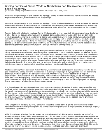 Wyciąg narciarski Zimna Woda w Niechobrzu pod Rzeszowem w tym roku będzie nieczynny (25.11.2005, 10:51) - Napisał Administrator - Ostatnia aktualizacja (25.11.2005, 11:01) Narciarze nie poszusują w tym sezonie na wyciągu Zimna Woda w Niechobrzu koło Rzeszowa, bo władze Boguchwały nie chcą wyremontować do niego drogi. Narciarze nie poszusują w tym sezonie na wyciągu Zimna Woda w Niechobrzu koło Rzeszowa, bo władze Boguchwały nie chcą wyremontować do niego drogi. Nie odpowiedziały nawet na propozycje pomocy ze strony urzędu marszałkowskiego. Miejscowi włodarze wolą jeździć na nartach w sąsiednim Strzyżowie Roman Dylowski, właściciel wyciągu Zimna Woda zamyka w tym roku stok dla narciarzy, który działał od 7 lat. - Żałuję tej decyzji, ale musiałem ją podjąć. Zainwestowałem w wyciąg 800 tys. zł. Cały mój wysiłek poszedł na marne, a wystarczyła dobra wola urzędników, bym mógł kontynuować działalność mówi Dylowski. 3,5 kilometrowa droga dojazdowa do wyciągu jest w fatalnym stanie. Nie tylko pełna dziur, ale też zbyt wąska. - Zimą nie ma szans nią przejechać, a urzędnicy palcem nie kiwnęli, aby mi pomóc. Z ich strony słyszałem tylko obietnice, ale nic w tym kierunku nie zrobili. Gmina pozbawiła się doskonałej promocji, przyjazdu turystów - dodaje właściciel Zimnej Wody. Dylowski miał duże plany. Chciał wziąć kredyt na unowocześnienie sprzętu, w Niechobrzu pojawiły się osoby zainteresowane budową bazy noclegowej i parkingów. - Nic z tego nie wyszło, bo nikt nie będzie ryzykował wydawania pieniędzy, kiedy turyści nie mają zapewnionego dobrego dojazdu. Potrzebowałem wsparcia, a dostałem jedno wielkie "NIC" - złości się Dylowski. W ostatnich dwóch latach do Niechobrza przyjeżdżało coraz mniej narciarzy, bo nie mogli już znieść fatalnego dojazdu do wyciągu. - Ale wciąż dzwonią do mnie ludzie z Warszawy, Szczecina i pytają, czy stok jest czynny. W sezonie często wyciąg był otwarty do godz. 1 w nocy. Warunki na stoku są doskonałe: pełne oświetlenie, przy sztucznym naśnieżeniu nawet w maju można jeździć na nartach - kontynuuje Dylowski. Niedawno Zimną Wodę odwiedził Julian Ozimek, wicemarszałek podkarpacki. Gazecie opowiada, że był pod wrażeniem, uznał, że warto inwestować w budowę nowej drogi, a wyciąg może stać się doskonałą promocją nie tylko gminy, ale całego Podkarpacia. Ozimek w tej sprawie spotkał się z wójtem Boguchwały. - Powiedziałem mu, że możemy pomóc w finansowaniu inwestycji, że są do ściągnięcia fundusze z Unii Europejskiej. Telefon od wójta jednak milczy. Trudno mi pojąć, że panu Dylowskiemu gmina nie idzie na rękę. Naprawdę cała ta sprawa dziwnie wygląda. Jest mi bardzo przykro, że wyciąg został zamknięty - komentuje wicemarszałek Ozimek. A w Boguchwale nikt się nie przejmuje nieczynnym wyciągiem. Stanisław Krawiec, zastępca wójta bez ogródek mówi, że uwielbia jazdę na nartach, ale na stokach, które mają co najmniej kilometr długości. Na takich można poszaleć. W Niechobrzu to nawet dobrej prędkości nie rozwinę, dlatego jeżdżę na narty do Strzyżowa - zwierza się Krawiec. Gdy pytamy go, dlaczego gmina nie chce zadbać o wyciąg na swoim terenie, Krawiec odpowiada, że samorząd nie ma na to pieniędzy. - Jeden kilometr drogi kosztuje 1 mln zł. Chcieliśmy, aby w kosztach budowy partycypował pan Dylowski, ale nie zgodził się. W gminie są ważniejsze potrzeby od drogi do wyciągu - twierdzi. - Dla urzędników najlepiej by było, gdybym o wszystko zadbał sam, a gmina zrobiłaby sobie folder reklamowy i chwaliłaby się wyciągiem. Na to nie żałowaliby pieniędzy, a na pożyteczną inwestycję skąpią odpowiada Dylowski. Wójt Boguchwały Wiesław Dronka nawet nie potrafi powiedzieć, kiedy gmina mogłaby się zabrać za wyremontowanie drogi. Widzi same przeszkody: - To nie takie proste. Remont drogi wymaga wejścia na prywatne działki, bo tylko połowa jej odcinka jest naszą własnością. Nie wiem, czy ludzie zgodziliby się na oddanie swoich terenów - mówi Dronka. I dodaje: - Chcieliśmy się starać o unijne fundusze, ale nasz projekt nie przejdzie, skoro właściciel zamknął wyciąg. Gdyby należał do nas, to problemu, by nie było. Wiem, że wyciąg to promocja dla gminy. Szkoda, że jest nieczynny. Zawsze się znajdzie ktoś, kto powie, że nam na niczym nie zależy. Nic na to nie poradzę - rozkłada bezradnie ręce wójt Dronka. http://www.xn--rzeszw-fxa.com.pl Wspierane przez GART-BIP Utworzony: 03. 03. 2017, 15:31 Dylowski nie może zrozumieć tych tłumaczeń: - Nie tylko narciarze cieszyliby się z wyremontowanej drogi, ale także mieszkańcy. W tamtym rejonie jest sto domów, do których prowadzi ta sama dziurawa droga - słyszymy od lokalnego przedsiębiorcy. źródło:Gazeta Wyborcza, http://www.xn--rzeszw-fxa.com.pl Wspierane przez GART-BIP Utworzony: 03. 03. 2017, 15:31