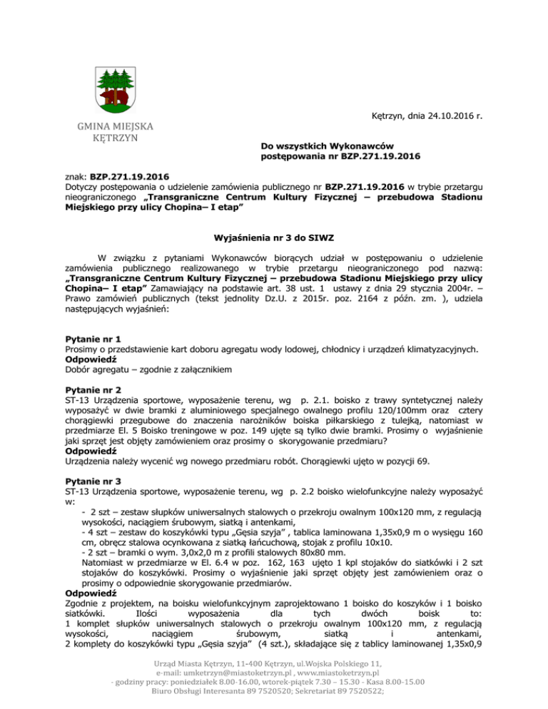 Kętrzyn, dnia 24.10.2016 r. Do wszystkich Wykonawców postępowania nr BZP.271.19.2016 znak: BZP.271.19.2016 Dotyczy postępowania o udzielenie zamówienia publicznego nr BZP.271.19.2016 w trybie przetargu nieograniczonego „Transgraniczne Centrum Kultury Fizycznej – przebudowa Stadionu Miejskiego przy ulicy Chopina– I etap” Wyjaśnienia nr 3 do SIWZ W związku z pytaniami Wykonawców biorących udział w postępowaniu o udzielenie zamówienia publicznego realizowanego w trybie przetargu nieograniczonego pod nazwą: „Transgraniczne Centrum Kultury Fizycznej – przebudowa Stadionu Miejskiego przy ulicy Chopina– I etap” Zamawiający na podstawie art. 38 ust. 1 ustawy z dnia 29 stycznia 2004r. – Prawo zamówień publicznych (tekst jednolity Dz.U. z 2015r. poz. 2164 z późn. zm. ), udziela następujących wyjaśnień: Pytanie nr 1 Prosimy o przedstawienie kart doboru agregatu wody lodowej, chłodnicy i urządzeń klimatyzacyjnych. Odpowiedź Dobór agregatu – zgodnie z załącznikiem Pytanie nr 2 ST-13 Urządzenia sportowe, wyposażenie terenu, wg p. 2.1. boisko z trawy syntetycznej należy wyposażyć w dwie bramki z aluminiowego specjalnego owalnego profilu 120/100mm oraz cztery chorągiewki przegubowe do znaczenia narożników boiska piłkarskiego z tulejką, natomiast w przedmiarze El. 5 Boisko treningowe w poz. 149 ujęte są tylko dwie bramki. Prosimy o wyjaśnienie jaki sprzęt jest objęty zamówieniem oraz prosimy o skorygowanie przedmiaru? Odpowiedź Urządzenia należy wycenić wg nowego przedmiaru robót. Chorągiewki ujęto w pozycji 69. Pytanie nr 3 ST-13 Urządzenia sportowe, wyposażenie terenu, wg p. 2.2 boisko wielofunkcyjne należy wyposażyć w: - 2 szt – zestaw słupków uniwersalnych stalowych o przekroju owalnym 100x120 mm, z regulacją wysokości, naciągiem śrubowym, siatką i antenkami, - 4 szt – zestaw do koszykówki typu „Gęsia szyja” , tablica laminowana 1,35x0,9 m o wysięgu 160 cm, obręcz stalowa ocynkowana z siatką łańcuchową, stojak z profilu 10x10. - 2 szt – bramki o wym. 3,0x2,0 m z profili stalowych 80x80 mm. Natomiast w przedmiarze w El. 6.4 w poz. 162, 163 ujęto 1 kpl stojaków do siatkówki i 2 szt stojaków do koszykówki. Prosimy o wyjaśnienie jaki sprzęt objęty jest zamówieniem oraz o prosimy o odpowiednie skorygowanie przedmiarów. Odpowiedź Zgodnie z projektem, na boisku wielofunkcyjnym zaprojektowano 1 boisko do koszyków i 1 boisko siatkówki. Ilości wyposażenia dla tych dwóch boisk to: 1 komplet słupków uniwersalnych stalowych o przekroju owalnym 100x120 mm, z regulacją wysokości, naciągiem śrubowym, siatką i antenkami, 2 komplety do koszykówki typu „Gęsia szyja” (4 szt.), składające się z tablicy laminowanej 1,35x0,9 m o wysięgu 160 cm, obręczy stalowej ocynkowanej z siatką łańcuchową, stojaka z profilu 10x10. Tak tez zawarto w nowym przedmiarze. Pytanie nr 4 ST-13 Urządzenia sportowe, wyposażenie terenu, p. 2.4 Kasa kontenerowa. Prosimy o wyjaśnienie czy opisana w w/w punkcie kasa kontenerowa wchodzi w zakres zamówienia? Jeśli tak to prosimy o uzupełnienie przedmiaru. Odpowiedź Nie wchodzi w zakres zamówienia. Pytanie nr 5 ST-13 Urządzenia sportowe, wyposażenie terenu, p. 2.5 szafki szatniowe oraz Opis – elementy aranżacji poz. A52 i A53. Czy podane ilości 24 szt i 20 szt dotyczą wyliczeń wg jednego schowka czy tą są ilości segmentów 4 schowki w bloku/6 schowków w bloku? Czy wartość tych szafek należy zawrzeć w pozycji przedmiarowej nr 154? Odpowiedź Wyposażenie szafkami uwzględniono w poz. 141. Ilości: A53 - 20 szt modułu (1 moduł=2 schowki), A52 - 24 szt. modułu (1 moduł=4 schowki). Pytanie nr 6 ST-13 Urządzenia sportowe, wyposażenie terenu, wg p. 2.6 Trybuny zewnętrzne – „W ramach zagospodarowania terenu przewidziano miejsca przeznaczone pod rozstawiane, prefabrykowane trybuny stalowe (T2 i T3) – jako gotowe wyroby.” Prosimy o wyjaśnienie czy prefabrykowane, stalowe trybuny T2, T3 wyposażone w krzesełka PROSTAR NO-04 objęte są zakresem zamówienia, jeśli tak to prosimy o wskazanie pozycji przedmiarowej w której są one ujęte lub korektę przedmiaru. Odpowiedź Urządzenia nie wchodzą w zakres zadania. Pytanie nr 7 ST-13 Urządzenia sportowe, wyposażenie terenu, p. 2.7 Zadaszenie sceny. Czy opisany w w/w puncie obiekt namiotowy z dachem półkolistym jest objęty zamówieniem? Jeśli tak to prosimy odpowiednia korektę przedmiaru. Odpowiedź Urządzenia nie wchodzą w zakres zadania. Pytanie nr 8 ST-13 Urządzenia sportowe, wyposażenie terenu: 2.8. Wyposażenie skateplazy, 2.9. Lodowisko. Prosimy o określenie czy elementy opisane w STWiOR w w/w punktach wchodzą w zakres zamówienia. Jeśli tak to prosimy o korektę przedmiaru. Odpowiedź Urządzenia nie wchodzą w zakres zadania. Pytanie nr 9 ST-13 Urządzenia sportowe, wyposażenie terenu 2.10.Siedziska na trybunie VIP i dziennikarskiej. „Siedziska na pozostałej części trybuny zadaszonej – Zaprojektowano 480 siedzisk”, natomiast w w opisie architektury budynku głównego w poz. 8.23 podano – 30 szt siedzisk Vip i dziennikarskich oraz w poz. 8.24 – pozostała część trybun – 442 szt. Prosimy o jednoznaczne określenie ile siedzisk należy ująć w ofercie w Sali w budynku i na trybunie T1, T2, T3? Odpowiedź Zgodnie z wcześniejszymi wyjaśnieniami oraz przedmiarem robót i dokumentacją projektową. Pytanie nr 10 St-00 Wymagania ogólne. 8. OPIS SPOSOBU ROZLICZENIA ROBOT, 8.1. Ustalenia ogólne „Podstawą płatności jest cena ryczałtowa obejmująca wykonanie wszystkich robót wykazanych w Specyfikacjach Technicznych wykonania i odbioru robót budowlanych i w dokumentacji projektowej.” Natomiast Rozdział XIII SIWZ Opis sposobu obliczenia ceny – wynagrodzenie będzie wynagrodzeniem kosztorysowym. Prosimy o korektę zapisów ST. Odpowiedź Rozliczenie będzie zgodne z zapisami SIWZ. Pytanie nr 11 Prosimy o określenie z jakiej blachy (stal, alum
