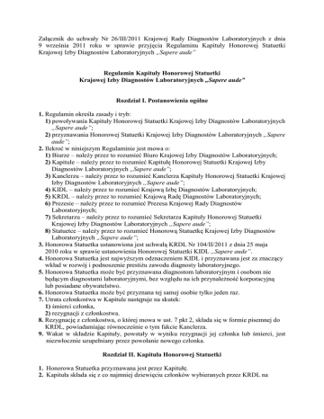Załącznik do uchwały Nr 26/III/2011 Krajowej Rady Diagnostów Laboratoryjnych z dnia 9 września 2011 roku w sprawie przyjęcia Regulaminu Kapituły Honorowej Statuetki Krajowej Izby Diagnostów Laboratoryjnych „Sapere aude” Regulamin Kapituły Honorowej Statuetki Krajowej Izby Diagnostów Laboratoryjnych „Sapere aude” Rozdział I. Postanowienia ogólne 1. Regulamin określa zasady i tryb: 1) powoływania Kapituły Honorowej Statuetki Krajowej Izby Diagnostów Laboratoryjnych „Sapere aude”; 2) przyznawania Honorowej Statuetki Krajowej Izby Diagnostów Laboratoryjnych „Sapere aude”; 2. Ilekroć w niniejszym Regulaminie jest mowa o: 1) Biurze – należy przez to rozumieć Biuro Krajowej Izby Diagnostów Laboratoryjnych; 2) Kapitule – należy przez to rozumieć Kapitułę Honorowej Statuetki Krajowej Izby Diagnostów Laboratoryjnych „Sapere aude”; 3) Kanclerzu – należy przez to rozumieć Kanclerza Kapituły Honorowej Statuetki Krajowej Izby Diagnostów Laboratoryjnych „Sapere aude”; 4) KIDL – należy przez to rozumieć Krajową Izbę Diagnostów Laboratoryjnych; 5) KRDL – należy przez to rozumieć Krajową Radę Diagnostów Laboratoryjnych; 6) Prezesie – należy przez to rozumieć Prezesa Krajowej Rady Diagnostów Laboratoryjnych; 7) Sekretarzu – należy przez to rozumieć Sekretarza Kapituły Honorowej Statuetki Krajowej Izby Diagnostów Laboratoryjnych „Sapere aude”; 8) Statuetce – należy przez to rozumieć Honorową Statuetkę Krajowej Izby Diagnostów Laboratoryjnych „Sapere aude”; 3. Honorowa Statuetka ustanowiona jest uchwałą KRDL Nr 104/II/2011 z dnia 25 maja 2010 roku w sprawie ustanowienia Honorowej Statuetki KIDL „Sapere aude”. 4. Honorowa Statuetka jest najwyższym odznaczeniem KIDL i przyznawana jest za znaczący wkład w rozwój i podnoszenie prestiżu zawodu diagnosty laboratoryjnego. 5. Honorowa Statuetka może być przyznawana diagnostom laboratoryjnym i osobom nie będącym diagnostami laboratoryjnymi, bez względu na ich przynależność korporacyjną lub posiadane obywatelstwo. 6. Honorowa Statuetka może być przyznana tej samej osobie tylko jeden raz. 7. Utrata członkostwa w Kapitule następuje na skutek: 1) śmierci członka, 2) rezygnacji z członkostwa. 8. Rezygnację z członkostwa, o której mowa w ust. 7 pkt 2, składa się w formie pisemnej do KRDL, powiadamiając równocześnie o tym fakcie Kanclerza. 9. Wakat w składzie Kapituły, powstały w wyniku rezygnacji jej członka lub śmierci, jest niezwłocznie uzupełniany przez powołanie nowego członka. Rozdział II. Kapituła Honorowej Statuetki 1. Honorowa Statuetka przyznawana jest przez Kapitułę. 2. Kapituła składa się z co najmniej dziewięciu członków wybieranych przez KRDL na czas nieokreślony. 3. Na czele Kapituły stoi Kanclerz wybierany przez jej członków w głosowaniu tajnym. 4. Kanclerz kieruje działalnością Kapituły, w tym zwołuje jej posiedzenia. 5. Dokumentację związaną z działalnością Kapituły prowadzi Sekretarz wybierany przez jej członków w głosowaniu tajnym. 6. W posiedzeniach Kapituły mogą uczestniczyć, bez prawa głosu stanowiącego, osoby nie będące jej członkami, zaproszone przez Kanclerza. 7. Członkowie Kapituły pełnią swoje funkcje honorowo, bez pobierania wynagrodzenia. Rozdział III. Wniosek o nadanie Honorowej Statuetki 1. Honorowa Statuetka przyznawana jest na wniosek. 2. Prawo do występowania z wnioskiem, o którym mowa w ust. 1, przysługuje: 1) Prezesowi; 2) KRDL; 3) grupie co najmniej pięćdziesięciu członków KIDL reprezentowanej przez inicjatora; do wniosku dołącza się imienną listę członków KIDL popierających wniosek wraz z podaniem ich numerów wpisu na listę diagnostów laboratoryjnych oraz ich podpisami; 3. Wniosek, o którym mowa w ust. 1, powinien zawierać: 1) imię i nazwisko kandydata do Honorowej Statuetki; 2) jego życiorys zawodowy, w tym wyraźne wskazanie dokonań i zasług uzasadniających przyznanie Honorowej Statuetki; 4. Wniosek, o którym mowa w ust. 1, kierowany jest do Kanclerza za pośrednictwem Biura. 5. Przed skierowaniem do Kapituły wniosek, o którym mowa w ust. 1, jest rozpatrywany wstępnie pod względem formalnym przez Komisję Nagród i Odznaczeń. 6. W przypadku stwierdzenia, że wniosek nie spełnia wymogów określonych w ust. 4, Komisja zwraca go wnioskodawcy do uzupełnienia. Rozdział IV. Tryb rozpatrywania wniosków oraz przyznawania i wręczania Honorowej Statuetki 1. Kanclerz w terminie nie dłuższym niż: 1) trzy miesiące od daty otrzymania wniosku zwołuje posiedzenie Kapituły w celu rozpatrzenia wniosku; 2) trzydzieści dni od daty otrzymania wniosku wyznacza sprawozdawcę wniosku spośród członków Kapituły; 2. Sprawozdawca wniosku: 1) ma prawo wystąpić do wnioskodawcy o uzupełnienie wniosku w razie powzięcia wątpliwości co do jego kompletności; 2) jest zobowiązany do przedstawienia wniosku na posiedzeniu Kapituły; 3. Kapituła rozpatruje wnioski na posiedzeniu w obecności co najmniej pięciu swoich członków. 4. Kapituła podejmuje decyzję o przyjęciu lub odrzuceniu wniosku w głosowaniu tajnym większością głosów członków obecnych na posiedzeniu. Przy głosowaniu nie bierze się pod uwagę głosów wstrzymujących. 5. Kanclerz powiadamia niezwłocznie Prezesa o decyzji Kapituły dotyczącej wniosku. 6. Decyzję Kapituły o przyznani Honorowej Statuetki zatwierdza w drodze uchwały KRDL w głosowaniu tajnym zwykłą większością głosów. 7. O decyzji Kapituły i KRDL wnioskodawcę powiadamia Biuro. 8. Honorową Statuetkę wraz z legitymacją uroczyście wręczają Prezes i Kanclerz , którzy wspólnie podejmują decyzję o okolicznościach ich wręczenia. 9. Kapituła dokonuje wpisów do Księgi Odznaczonych Honorową Statuetką. 10. Z posiedzenia Kapituły Sekretarz sporządza krótkie sprawozdanie, które wraz z wnioskami jest przechowywane w Biurze. Rozdział V. Obsługa administracja i finansowan