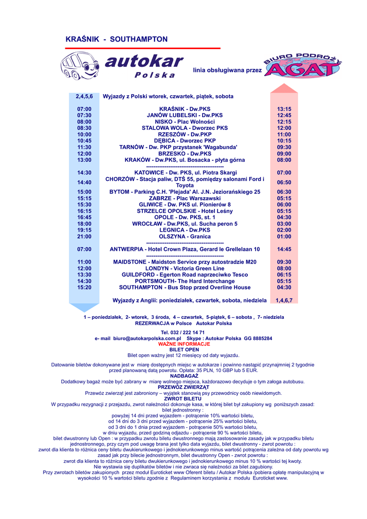 KRAŚNIK - SOUTHAMPTON linia obsługiwana przez 2,4,5,6 07:00 07:30 08:00 08:30 10:00 10:45 11:30 12:00 13:00 14:30 14:40 15:00 15:15 15:30 16:15 16:45 18:00 19:15 21:00 07:00 11:00 12:00 13:30 14:30 15:20 Wyjazdy z Polski wtorek, czwartek, piątek, sobota KRAŚNIK - Dw.PKS JANÓW LUBELSKI - Dw.PKS NISKO - Plac Wolności STALOWA WOLA - Dworzec PKS RZESZÓW - Dw.PKP DĘBICA - Dworzec PKP TARNÓW - Dw. PKP przystanek 'Wagabunda' BRZESKO - Dw.PKS KRAKÓW - Dw.PKS, ul. Bosacka - płyta górna -----------------------------------------KATOWICE - Dw. PKS, ul. Piotra Skargi CHORZÓW - Stacja paliw, DTŚ 55, pomiędzy salonami Ford i Toyota BYTOM - Parking C.H. 'Plejada' Al. J.N. Jeziorańskiego 25 ZABRZE - Plac Warszawski GLIWICE - Dw. PKS ul. Pionierów 8 STRZELCE OPOLSKIE - Hotel Leśny OPOLE - Dw. PKS, st. 1 WROCŁAW - Dw.PKS, ul. Sucha peron 5 LEGNICA - Dw.PKS OLSZYNA - Granica -----------------------------------------ANTWERPIA - Hotel Crown Plaza, Gerard le Grellelaan 10 -----------------------------------------MAIDSTONE - Maidston Service przy autostradzie M20 LONDYN - Victoria Green Line GUILDFORD - Egerton Road naprzeciwko Tesco PORTSMOUTH- The Hard Interchange SOUTHAMPTON - Bus Stop przed Overline House Wyjazdy z Anglii: poniedziałek, czwartek, sobota, niedziela 13:15 12:45 12:15 12:00 11:00 10:15 09:30 09:00 08:00 07:00 06:50 06:30 05:15 06:00 05:15 04:30 03:00 02:00 01:00 14:45 09:30 08:00 06:15 05:15 04:30 1,4,6,7 1 – poniedziałek, 2- wtorek, 3 środa, 4 – czwartek, 5-piątek, 6 – sobota , 7- niedziela REZERWACJA w Polsce Autokar Polska Tel. 032 / 222 14 71 e- mail [email protected] Skype : Autokar Polska GG 8885284 WAŻNE INFORMACJE BILET OPEN Bilet open ważny jest 12 miesięcy od daty wyjazdu. Datowanie biletów dokonywane jest w miarę dostępnych miejsc w autokarze i powinno nastąpić przynajmniej 2 tygodnie przed planowaną datą powrotu. Opłata: 35 PLN, 10 GBP lub 5 EUR. NADBAGAŻ Dodatkowy bagaż może być zabrany w miarę wolnego miejsca, każdorazowo decyduje o tym załoga autobusu. PRZEWÓZ ZWIERZĄT Przewóz zwierząt jest zabroniony – wyjątek stanowią psy przewodnicy osób niewidomych. ZWROT BILETU W przypadku rezygnacji z przejazdu, zwrot należności dokonuje kasa, w której bilet był zakupiony wg poniższych zasad: bilet jednostronny : powyżej 14 dni przed wyjazdem - potrącenie 10% wartości biletu, od 14 dni do 3 dni przed wyjazdem - potrącenie 25% wartości biletu, od 3 dni do 1 dnia przed wyjazdem - potrącenie 50% wartości biletu, w dniu wyjazdu, przed godziną odjazdu - potrącenie 90 % wartości biletu, bilet dwustronny lub Open : w przypadku zwrotu biletu dwustronnego mają zastosowanie zasady jak w przypadku biletu jednostronnego, przy czym pod uwagę brana jest tylko data wyjazdu, bilet dwustronny - zwrot powrotu : zwrot dla klienta to różnica ceny biletu dwukierunkowego i jednokierunkowego minus wartość potrącenia zależna od daty powrotu wg zasad jak przy bilecie jednostronnym, bilet dwustronny Open - zwrot powrotu : zwrot dla klienta to różnica ceny biletu dwukierunkowego i jednokierunkowego minus 10 % wartości tej kwoty. Nie wystawia się duplikatów biletów i nie zwraca się należności za bilet zagubiony. Przy zwrotach biletów zakupionych przez moduł Euroticket www Oferent biletu / Autokar Polska /pobiera opłatę manipulacyjną w wysokości 10 % wartości biletu zgodnie z Regulaminem korzystania z modułu Euroticket www. Osoby nieletnie winny posiadać upoważnienie do przewozu osoby nieletniej /druk na stronie www.autokarpolska .com.pl w dziale dla agentów / Uwaga: Pasażer proszony jest o stawienie się 15 min przed planowanym odjazdem autokaru.