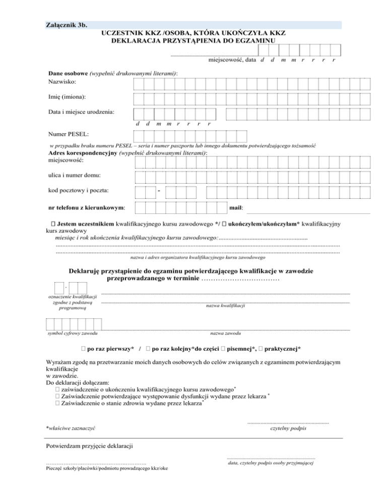 Załącznik 3b. UCZESTNIK KKZ /OSOBA, KTÓRA UKOŃCZYŁA KKZ DEKLARACJA PRZYSTĄPIENIA DO EGZAMINU miejscowość, data d d m m r r r r Dane osobowe (wypełnić drukowanymi literami): Nazwisko: Imię (imiona): Data i miejsce urodzenia: d d m m r r r r Numer PESEL: w przypadku braku numeru PESEL – seria i numer paszportu lub innego dokumentu potwierdzającego tożsamość Adres korespondencyjny (wypełnić drukowanymi literami): miejscowość: ulica i numer domu: kod pocztowy i poczta: - nr telefonu z kierunkowym: mail: Jestem uczestnikiem kwalifikacyjnego kursu zawodowego */ ukończyłem/ukończyłam* kwalifikacyjny kurs zawodowy miesiąc i rok ukończenia kwalifikacyjnego kursu zawodowego:....................................................... ............................................................................................................................................................................... ............................................................................................................................................................................... nazwa i adres organizatora kwalifikacyjnego kursu zawodowego Deklaruję przystąpienie do egzaminu potwierdzającego kwalifikacje w zawodzie przeprowadzanego w terminie …………………………… . oznaczenie kwalifikacji zgodne z podstawą programową nazwa kwalifikacji symbol cyfrowy zawodu nazwa zawodu po raz pierwszy* / po raz kolejny*do części pisemnej*, praktycznej* Wyrażam zgodę na przetwarzanie moich danych osobowych do celów związanych z egzaminem potwierdzającym kwalifikacje w zawodzie. Do deklaracji dołączam: zaświadczenie o ukończeniu kwalifikacyjnego kursu zawodowego * Zaświadczenie potwierdzające występowanie dysfunkcji wydane przez lekarza * Zaświadczenie o stanie zdrowia wydane przez lekarza* *właściwe zaznaczyć ........................................................ czytelny podpis Potwierdzam przyjęcie deklaracji …………………………………………………. Pieczęć szkoły/placówki/podmiotu prowadzącego kkz/oke .................................................................... data, czytelny podpis osoby przyjmującej