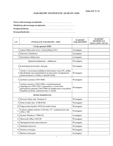 Załącznik Nr 4a PARAMETRY TECHNICZNE APARATU EMG Nazwa oferowanego urządzenia …………………………………… Model/typ oferowanego urządzenia: …………………..…….………… Producent/firma: ……………….…………………………………...… Kraj pochodzenia ……………………………………………….……….. L.P. WYMAGANE PARAMETRY - OPIS WARTOŚĆ PARAMETRÓW Cechy aparatu EMG 1 Aparat fabrycznie nowy, rok produkcji 2012 wymagane 2 Głowica 2-kanałowa wymagane 3 Stymulator elektryczny wymagane Kryteria mechaniczno – elektryczne Wymagane 4 konstrukcja przewoźna, stacyjna Wymagane wózek z wysuwaną szufladą na klawiaturę i mysz PC, półką 5 dla drukarki oraz pojemnikiem na akcesoria i komputerem zamocowanym w wózku w sposób trwały Wymagane 6 zasilanie systemu 230V/50Hz Wymagane zasilacz sieciowy 230V/50Hz z transformatorem separującym 230V/230V wyposażony w izolowane 7 Wymagane galwaniczne gniazda 230V/50Hz do podłączenia wszystkich urządzeń systemu, zamontowany w wózku System komputerowy 8 Procesor klasy min. Pentium i5 Wymagane 9 Dysk twardy min. 4 GB RAM Wymagane 10 Nagrywarka dysków DVD do archiwizacji 11 Wymagane Cyfrowy płaski monitor LCD min. 27”, rozdzielczość min. 1024 x 768 Wymagane 12 System Windows 7 PRO PL wymagane 13 Microsoft Office 2010 PL Wymagane 14 Oprogramowanie antywirusowe Wymagane 15 Drukarka laserowa Wymagane 16 Zasilacz awaryjny Wymagane 17 Bariera izolacyjna wymagane 1 WARTOŚĆ OFEROWANA (opisać, podać zakresy) L.P. WYMAGANE PARAMETRY - OPIS WARTOŚĆ PARAMETRÓW Oprogramowanie specjalistyczne Oprogramowanie specjalistyczne w języku polskim Elektromiografia (EMG) - MUAP, - spontaniczne EMG, - próba wysiłkowa - próba miasteniczna - współczulne odruchy skórne 18 - EMG igłowe Badanie szybkości przewodzenia nerwów (NCV) - ruchowych - czuciowych - Fala F - Odruch mrugania - Odruch H Oprogramowanie do potencjałów somatosensorycznych Wymagane Akcesoria 19 Elektroda stymulacyjna – min. 1 szt. Wymagane 20 Elektroda odbiorcza mała – min. 1 szt, duża – min. 1 szt. Wymagane 21 Elektroda odbiorcza tarkowa – min. 1 szt. Wymagane 22 Elektroda obrączkowa – min. 1 szt. Wymagane 23 Elektroda uziemiająca płytkowa – min. 1 szt. Wymagane 24 Elektroda uziemiająca rzepowa – min. 1 szt. Wymagane 25 Jednorazowe elektrody igłowe ( min.100 szt.) Wymagane 26 Uchwyt elektrod igłowych (jedno i wielorazowych) – min. 1 szt. Wymagane Inne wymagania 27 Możliwość tworzenia szczegółowych raportów w formatach Wymagane txt i doc oraz dowolne ich konfigurowanie 28 Intuicyjny interfejs Wymagane 29 Możliwość rozbudowy o moduł do potencjałów wywołanych SEP, VEP, AEP, potencjałów poznawczych Wymagane 30 Możliwość rozbudowy aparatu o stymulację magnetyczną (Neuro MS) Wymagane 31 32 Montaż i uruchomienie sprzętu przez dostawcę Przeszkolenie personelu medycznego w zakresie eksploatacji i obsługi sprzętu. 2 wymagane Wymagane WARTOŚĆ OFEROWANA (opisać, podać zakresy) L.P. WARTOŚĆ PARAMETRÓW WYMAGANE PARAMETRY - OPIS Gwarancja na zaoferowany aparat min. 36 miesięcy (gwarancja liczona od daty uruchomienia potwierdzonego 33 podpisaniem protokołu odbioru po przeprowadzonym szkoleniu). 34 Przeglądy gwarancyjne zgodnie z dokumentacją producenta dokonywane na koszt wykonawcy w okresie gwarancji wymagane Wymagane Czas reakcji na zgłoszenie awarii – maksymalny czas na 35 podjęcie działań zmierzających do usunięcia awarii do 48 godzin (w dni robocze) Wymagane 36 Okres dostępności części zamiennych min. 10 lat. Wymagane 37 Certyfikat CE, Deklaracja zgodności producenta na oferowany sprzęt WARTOŚĆ OFEROWANA (opisać, podać zakresy) Wymagane Wpis (ewentualnie zgłoszenie) do rejestru wyrobów 38 medycznych i podmiotów odpowiedzialnych za jego wprowadzenie do obrotu i do używania wymagane 39 Instrukcja obsługi w języku polskim Wymagane Potwierdzenie wykonawcy, ze jest autoryzowanym dystrybutorem oferowanego sprzętu oraz, że posiada 40 autoryzację producenta do świadczenia usług serwisowych, w tym do dostawy i instalacji oryginalnych części zamiennych na terenie Polski. Wymagane UWAGA: Zamawiający wymaga, aby Wykonawcy wpisywali w rubrykę „wartość oferowana” w niniejszym załączniku właściwości techniczne oferowanych urządzeń. Zamawiający nie ocenia parametrów technicznych punktami, traktuje je jako bezwzględnie wymagane. Zakreślenie w niniejszym załączniku chociażby jednej pozycji „nie” spowoduje odrzucenie oferty, jako niezgodnej ze Specyfikacją Istotnych Warunków Zamówienia. Brak opisu będzie traktowany jako brak danego parametru w oferowanej konfiguracji urządzenia. Oświadczamy, że oferowane, powyżej wyspecyfikowane urządzenie jest kompletne, nowe i będzie gotowe do użytkowania bez żadnych dodatkowych zakupów i inwestycji. …………………………………………… (podpisy osób upoważnionych do składania oświadczeń woli w imieniu wykonawcy) 3