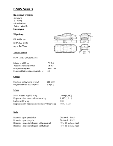 BMW Serii 3 Dostępne wersje: -Limuzyna -3 Touring - Gran Turismo -Active Hybrid 3. Limuzyna Wymiary: Dł. 4624 cm szer.2031 cm wys. 1429cm Zużycie paliwa BMW Seria 3 Limuzyna 316i: Miasto w l/100 km Poza miastem w l/100km Emisja CO2 w g/km Pojemność zbiornika paliwa (ok.) w l 7,7-7,6 4,8-4,7 137 - 134 60 Osiągi Prędkość maksymalna w km/h Przyspieszenie 0-100 km/h w s 210 [210] 8.9 [9.2] Masa Masa własna wg UE w kg Dopuszczalna masa całkowita w kg Ładowność w kg Dopuszczalny nacisk osi przedniej/tylnej w kg 1,460 [1,480] 1,935 [1,955] 550 885 / 1,125 Koła Rozmiar opon przednich Rozmiar opon tylnych Rozmiar i materiał obręczy kół przednich Rozmiar i materiał obręczy kół tylnych 205/60 R16 92H 205/60 R16 92H 7J x 16 inches, steel 7J x 16 inches, steel