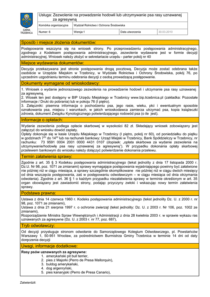 Usługa: Zezwolenie na prowadzenie hodowli lub utrzymywanie psa rasy uznawanej za agresywną Komórka organizacyjna Wydział Rolnictwo i Ochrona Środowiska Numer: 6 Wersja:1 Data utworzenia 30.03.2010 Sposób i miejsce złożenia dokumentów: Postępowanie wszczyna się na wniosek strony. Po przeprowadzeniu postępowania administracyjnego, zgodnego z Kodeksem postępowania administracyjnego, zezwolenie wydawane jest w formie decyzji administracyjnej. Wniosek należy złożyć w sekretariacie urzędu - parter pokój nr 40 Miejsce wydawania dokumentów: Decyzja przekazywana jest stronie postępowania drogą pocztową. Decyzja może zostać odebrana także osobiście w Urzędzie Miejskim w Trzebnicy, w Wydziale Rolnictwa i Ochrony Środowiska, pokój 76, po uprzednim uzgodnieniu terminu odebrania decyzji z osobą prowadzącą postępowanie. Dokumenty wymagane od wnioskodawcy: 1. Wniosek o wydanie jednorazowego zezwolenia na prowadzenie hodowli i utrzymanie psa rasy uznawanej za agresywną. 2. Wiosek ten jest dostępny w BIP Urzędu Miejskiego w Trzebnicy www.bip.trzebnica.pl (zakładka: Pozostałe informacje / Druki do pobrania) lub w pokoju 76 (I piętro). 3. Załączniki: pisemna informacja o pochodzeniu psa, jego rasie, wieku, płci i ewentualnym sposobie oznakowania psa, miejscu i warunkach, w jakich wnioskodawca zamierza utrzymać psa, kopia książeczki zdrowia, dokument Związku Kynologicznego potwierdzającego rodowód psa (o ile jest). Informacje o opłatach: Wydanie zezwolenia podlega opłacie skarbowej w wysokości 82 zł. Składający wniosek zobowiązany jest załączyć do wniosku dowód zapłaty. Opłaty dokonuje się w kasie Urzędu Miejskiego w Trzebnicy (I piętro, pokój nr 60), od poniedziałku do piątku w godzinach 730 do 1400 lub na rachunek bankowy: Urząd Miejski w Trzebnicy, Bank Spółdzielczy w Trzebnicy, nr rachunku: 73 9591 0004 2001 0000 4431 0107 (dopisek: „opłata skarbowa za wydanie zezwolenia na utrzymywanie/hodowlę psa rasy uznawanej za agresywną”). W przypadku dokonania opłaty skarbowej przelewem bankowym do wniosku należy dołączyć potwierdzenie dokonania przelewu. Termin załatwienia sprawy: Zgodnie z art. 35 § 3 Kodeksu postępowania administracyjnego (tekst jednolity z dnia 17 listopada 2000 r. Dz.U. Nr 98, poz. 1071 ze zmianami) sprawy wymagające postępowania wyjaśniającego powinny być załatwione nie później niż w ciągu miesiąca, a sprawy szczególnie skomplikowane nie później niż w ciągu dwóch miesięcy od dnia wszczęcia postępowania, zaś w postępowaniu odwoławczym – w ciągu miesiąca od dnia otrzymania odwołania). Zgodnie z art. 36 § 1 o każdym przypadku niezałatwienia sprawy w terminie określonym w art. 35 organ obowiązany jest zawiadomić strony, podając przyczyny zwłoki i wskazując nowy termin załatwienia sprawy. Podstawa prawna: Ustawa z dnia 14 czerwca 1960 r. Kodeks postępowania administracyjnego (tekst jednolity Dz. U. z 2000 r. nr 98, poz. 1071 ze zmianami), Ustawa z dnia 21 sierpnia 1997 r. o ochronie zwierząt (tekst jednolity: Dz. U. z 2003 r. Nr 106, poz. 1002 ze zmianami), Rozporządzenie Ministra Spraw Wewnętrznych i Administracji z dnia 28 kwietnia 2003 r. w sprawie wykazu ras uznawanych za agresywne (Dz. U. z 2003 r. nr 77, poz. 687), Tryb odwoławczy: Od decyzji przysługuje stronom odwołanie do Samorządowego Kolegium Odwoławczego, pl. Powstańców Warszawy 1, 50-951 Wrocław, za pośrednictwem Burmistrza Gminy Trzebnica w terminie 14 dni od daty doręczenia decyzji Uwagi, informacje dodatkowe: Rasy psów uznawanych za agresywne: 1. amerykański pit bull terrier, 2. pies z Majorki (Perro de Presa Mallorquin), 3. buldog amerykański, 4. dog argenryński, 5. pies kanaryjski (Perro de Presa Canario), Zatwierdził: Usługa: Zezwolenie na prowadzenie hodowli lub utrzymywanie psa rasy uznawanej za agresywną Komórka organizacyjna Wydział Rolnictwo i Ochrona Środowiska Numer: 6 Wersja:1 Data utworzenia 6. tosa inu, 7. rottweiler, 8. akbash dog, 9. anatolian karabash, 10.moskiewski stróżujący, 11.owczarek kaukaski. Miejsce na notatki: Jednostka odpowiedzialna: Wydział Rolnictwa i Ochrony Środowiska,1 piętro, pokój nr 76, Szczepan Gurboda tel. +48 71 388 81 76, e-mail: [email protected] Zatwierdził: 30.03.2010