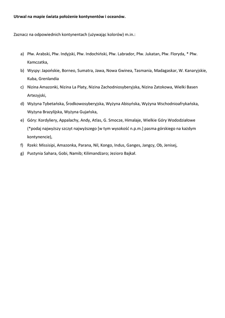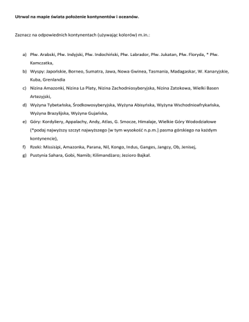 Utrwal na mapie świata położenie kontynentów i oceanów. Zaznacz na odpowiednich kontynentach (używając kolorów) m.in.: a) Płw. Arabski, Płw. Indyjski, Płw. Indochiński, Płw. Labrador, Płw. Jukatan, Płw. Floryda, * Płw. Kamczatka, b) Wyspy: Japońskie, Borneo, Sumatra, Jawa, Nowa Gwinea, Tasmania, Madagaskar, W. Kanaryjskie, Kuba, Grenlandia c) Nizina Amazonki, Nizina La Platy, Nizina Zachodniosyberyjska, Nizina Zatokowa, Wielki Basen Artezyjski, d) Wyżyna Tybetańska, Środkowosyberyjska, Wyżyna Abisyńska, Wyżyna Wschodnioafrykańska, Wyżyna Brazylijska, Wyżyna Gujańska, e) Góry: Kordyliery, Appalachy, Andy, Atlas, G. Smocze, Himalaje, Wielkie Góry Wododziałowe (*podaj najwyższy szczyt najwyższego [w tym wysokość n.p.m.] pasma górskiego na każdym kontynencie), f) Rzeki: Missisipi, Amazonka, Parana, Nil, Kongo, Indus, Ganges, Jangcy, Ob, Jenisej, g) Pustynia Sahara, Gobi, Namib; Kilimandżaro; Jezioro Bajkał.