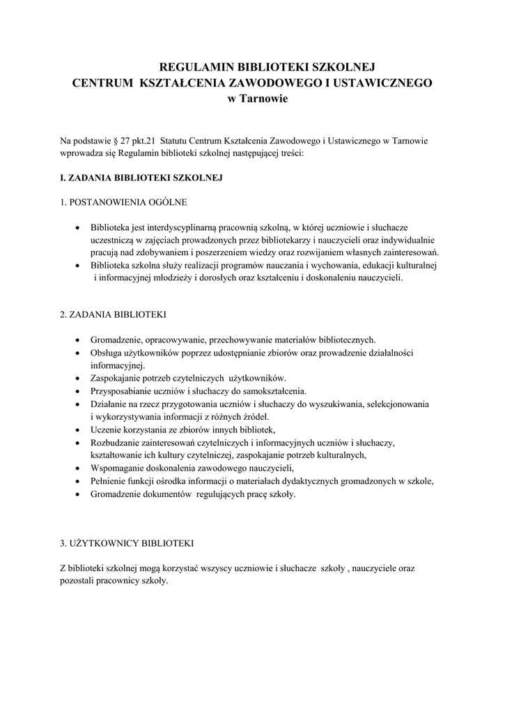 REGULAMIN BIBLIOTEKI SZKOLNEJ CENTRUM KSZTAŁCENIA ZAWODOWEGO I USTAWICZNEGO w Tarnowie Na podstawie § 27 pkt.21 Statutu Centrum Kształcenia Zawodowego i Ustawicznego w Tarnowie wprowadza się Regulamin biblioteki szkolnej następującej treści: I. ZADANIA BIBLIOTEKI SZKOLNEJ 1. POSTANOWIENIA OGÓLNE Biblioteka jest interdyscyplinarną pracownią szkolną, w której uczniowie i słuchacze uczestniczą w zajęciach prowadzonych przez bibliotekarzy i nauczycieli oraz indywidualnie pracują nad zdobywaniem i poszerzeniem wiedzy oraz rozwijaniem własnych zainteresowań. Biblioteka szkolna służy realizacji programów nauczania i wychowania, edukacji kulturalnej i informacyjnej młodzieży i dorosłych oraz kształceniu i doskonaleniu nauczycieli. 2. ZADANIA BIBLIOTEKI Gromadzenie, opracowywanie, przechowywanie materiałów bibliotecznych. Obsługa użytkowników poprzez udostępnianie zbiorów oraz prowadzenie działalności informacyjnej. Zaspokajanie potrzeb czytelniczych użytkowników. Przysposabianie uczniów i słuchaczy do samokształcenia. Działanie na rzecz przygotowania uczniów i słuchaczy do wyszukiwania, selekcjonowania i wykorzystywania informacji z różnych źródeł. Uczenie korzystania ze zbiorów innych bibliotek, Rozbudzanie zainteresowań czytelniczych i informacyjnych uczniów i słuchaczy, kształtowanie ich kultury czytelniczej, zaspokajanie potrzeb kulturalnych, Wspomaganie doskonalenia zawodowego nauczycieli, Pełnienie funkcji ośrodka informacji o materiałach dydaktycznych gromadzonych w szkole, Gromadzenie dokumentów regulujących pracę szkoły. 3. UŻYTKOWNICY BIBLIOTEKI Z biblioteki szkolnej mogą korzystać wszyscy uczniowie i słuchacze szkoły , nauczyciele oraz pozostali pracownicy szkoły. II. ORGANIZACJA BIBLIOTEKI 1. Lokal biblioteki składa się z wypożyczalni , czytelni z MCI oraz magazynów zbiorów . 2. Biblioteka czynna jest od poniedziałku do piątku w godzinach pracy dostosowanych do potrzeb uczniów i słuchaczy szkół wchodzących w skład Centrum. 3. Biblioteka gromadzi następujące dokumenty : wydawnictwa informacyjne, podręczniki szkolne i programy nauczania dla nauczycieli, lektury podstawowe i uzupełniające z języka polskiego i innych przedmiotów nauczania, wydawnictwa naukowe i popularnonaukowe, literaturę piękną, prasę i czasopisma dla uczniów, słuchaczy i nauczycieli, dokumenty o regionie, dokumenty audiowizualne i multimedialne, informatory o szkolnictwie wyższym, zawodach i rynku pracy. 4. W bibliotece zatrudnieni są nauczyciele bibliotekarze posiadający kwalifikacje do pracy w bibliotece szkolnej . 5. Nauczyciele bibliotekarze gromadzą zbiory zgodnie z organizacją i potrzebami szkoły. 6. Gromadzenie odbywa się planowo, systematyczne, w porozumieniu z dyrektorem szkoły, nauczycielami i zainteresowaniami użytkowników biblioteki. 7. Biblioteka jest finansowana z budżetu szkoły. Dotacje mogą też pochodzić od Rady Rodziców, sponsorów, darczyńców. 8. Biblioteka wyposażona jest w meble i sprzęt, w tym sprzęt komputerowy, pozwalający na realizację zadań statutowych szkoły. 9. W czytelni biblioteki funkcjonuje Multimedialne Centrum Informacyjne ( MCI) z ośmioma stanowiskami komputerowymi podłączonymi do sieci Internetu. III. ZADANIA I OBOWIĄZKI NAUCZYCIELA BIBLIOTEKARZA 1. PRACA PEDAGOGICZNA NAUCZYCIELA - BIBLIOTEKARZA: prowadzenie działalności informacyjnej, propagandowej, wizualnej, słownej dotyczącej zbiorów i pracy biblioteki, udział nauczycieli bibliotekarzy w realizacji programu dydaktycznego i wychowawczego szkoły, współrealizacja wybranych elementów edukacji czytelniczej i medialnej, rozwijanie kultury czytelniczej i przygotowanie uczniów do samokształcenia, wprowadzanie uczniów do życia w społeczeństwie informacyjnym, systematyczna analiza ofert księgarń internetowych i wydawnictw, udostępnianie zbiorów na miejscu w czytelni oraz wypożyczenia indywidualne i na lekcje przedmiotowe, udzielanie informacji bibliotecznych, bibliograficznych, rzeczowych, tekstowych, źródłowych, poradnictwo w doborze literatury, prowadzenie różnych form upowszechniania czytelnictwa i kultury, 2 2. PRACE ORGANIZACYJNO - TECHNICZNE NAUCZYCIELA -BIBLIOTEKARZA Nauczyciel - bibliotekarz jest zobowiązany: troszczyć się o właściwą organizację, wyposażenie i estetykę lokalu biblioteki, gromadzić i opracowywać zbiory zgodnie z profilami programowymi szkoły i jej potrzebami oraz przeprowadzać ich selekcję, prowadzić ewidencję zbiorów, organizować warsztat działalności informacyjnej, obliczać statystykę wypożyczeń i odwiedzin w czytelni, prowadzić dokumentację pracy biblioteki, doskonalić warsztat pracy bibliotekarza, również poprzez komputeryzację zbiorów, uczestniczyć w skontrum i selekcji księgozbioru. 3. ZASADY WSPÓŁPRACY Z UCZNIAMI 1. 2. 3. 4. 5. 6. Z biblioteki szkolnej mogą korzystać: uczniowie i słuchacze szkół dla młodzieży i dorosłych na podstawie zapisów w dziennikach lekcyjnych oraz kart/kont czytelnika biblioteki, nauczyciele (karta/konto czytelnika) , pozostali pracownicy szkoły (karta/konto czytelnika). Użytkownicy biblioteki, którzy przestają być uczniami, słuchaczami, nauczycielami, pracownikami szkoły, zobowiązani są do rozliczenia się z biblioteką szkolną. Nauczyciel bibliotekarz podpisuje kartę obiegową potwierdzającą zwrot dokumentów wypożyczonych w bibliotece lub do pracowni przedmiotowej. Użytkownicy biblioteki mają prawo do informacji i korzystania nieodpłatnie ze wszystkich zasobów biblioteki. Biblioteka pracuje nad kształtowaniem u uczniów i słuchaczy postaw sprzyjających ich dalszemu rozwojowi indywidualnemu i społecznemu. Nauczyciele bibliotekarze starają się przeciwdziałać wszelkim formom dyskryminacji i upowszechniać wiedzę o prawach człowieka i ucznia. W bibliotece przestrzega się przepisów i zasad BHP. 4. ZASADY WSPÓŁPRACY Z NAUCZYCIELAMI wspieranie nauczyciela w procesie dydak