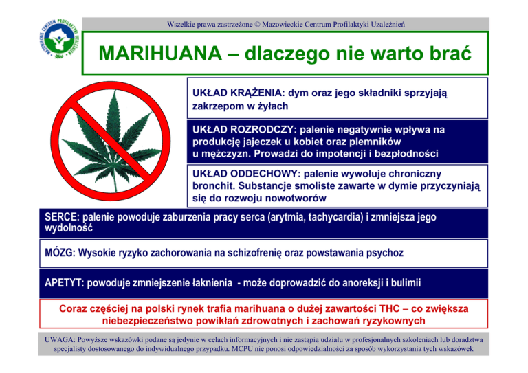 Wszelkie prawa zastrzeŜone © Mazowieckie Centrum Profilaktyki UzaleŜnień MARIHUANA – dlaczego nie warto brać UKŁAD KRĄśENIA: dym oraz jego składniki sprzyjają zakrzepom w Ŝyłach UKŁAD ROZRODCZY: palenie negatywnie wpływa na produkcję jajeczek u kobiet oraz plemników u męŜczyzn. Prowadzi do impotencji i bezpłodności UKŁAD ODDECHOWY: palenie wywołuje chroniczny bronchit. Substancje smoliste zawarte w dymie przyczyniają się do rozwoju nowotworów SERCE: palenie powoduje zaburzenia pracy serca (arytmia, tachycardia) i zmniejsza jego wydolność MÓZG: Wysokie ryzyko zachorowania na schizofrenię oraz powstawania psychoz APETYT: powoduje zmniejszenie łaknienia - moŜe doprowadzić do anoreksji i bulimii Coraz częściej na polski rynek trafia marihuana o duŜej zawartości THC – co zwiększa niebezpieczeństwo powikłań zdrowotnych i zachowań ryzykownych UWAGA: PowyŜsze wskazówki podane są jedynie w celach informacyjnych i nie zastąpią udziału w profesjonalnych szkoleniach lub doradztwa specjalisty dostosowanego do indywidualnego przypadku. MCPU nie ponosi odpowiedzialności za sposób wykorzystania tych wskazówek