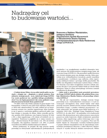 Zdaniem Ministerstwa... Przemysł Naftowy w Polsce 2011 Nadrzędny cel to budowanie wartości... Rozmowa z Rafałem Wardzińskim, zastępcą dyrektora Departamentu Spółek Kluczowych w Ministerstwie Skarbu Państwa i wiceprzewodniczącym Rady Nadzorczej Grupy LOTOS S.A. standardów i na uwzględnienie wszelkich elementów istotnych zarówno dla bezpieczeństwa energetycznego kraju, jak i rozwoju Grupy LOTOS S.A. Dla przyszłości spółki kluczowa jest również przyjęta przez nią strategia rozwoju, która przewiduje m.in. wielomiliardowe inwestycje, przede wszystkim w poszukiwanie i wydobycie ropy naftowej, celem zapewnienia stabilnych dostaw i pewnego źródła przychodów dla Spółki oraz długofalowe budowanie wartości firmy w Polsce. I te elementy musi także uwzględniać inwestor. Jednak ostateczna decyzja w tym procesie będzie leżała po stronie Rady Ministrów, której to oferta potencjalnego inwestora zostanie przedłożona do akceptacji. – Jakie zyski w przyszłości może przynieść prywatyzacja Grupy LOTOS? Jakich efektów dla polskiej firmy oczekuje Ministerstwo Skarbu Państwa od przyszłego właściciela LOTOS-u? – Tak jak już wspomniałem, strategia rozwoju Grupy przewiduje m.in. wielomiliardowe inwestycje i w tych inwestycjach niewątpliwie duży udział będzie miał także przyszły inwestor. Jednak równie ważnym dokumentem dla przyszłości Grupy, z punktu widzenia prywatyzacji i nowego właściciela, jest przyjęta przez Radę Nadzorczą w listopadzie 2010 roku „Strategia Grupy Kapitałowej Grupy LOTOS S.A. do roku 2015”. Jej nadrzędny cel to budowanie wartości dla akcjonariuszy przy jednoczesnym umocnieniu pozycji na rynku krajowym, dzięki zwiększeniu sprzedaży benzyny, oleju napędowego, paliwa lotniczego oraz w segmencie wydobywczym w kraju i za granicą. Poza tym GL będzie dążyła do utrzymania wysokiej konkurencyjności w grupie rafinerii europejskich oraz do optymalnego wykorzystania posiadanych aktywów, a także aktywów obejmowanych w wyniku dalszych działań rozwojowych. Wobec – Z jednej strony Polacy życzą sobie tanich paliw na stacjach, z drugiej zaś – skupienia w rękach państwa firm sektorów strategicznych – m.in. takich jak Grupa LOTOS. Czy warto pozbywać się z portfela takiego przedsiębiorstwa? Czy nie lepiej pozostawić tak cenny podmiot w jego dotychczasowej formule firmy państwowej? – W 2009 i 2010 roku Polska należała do grona krajów Unii Europejskiej, w których ceny paliw były najniższe. Faktycznie w 2010 roku odnotowaliśmy ich skok, jednak był on konsekwencją wzrostu tzw. parytetu importowego, który kształtuje się w oparciu o notowania giełdowe gotowych paliw oraz kurs złotego w stosunku do dolara. Mimo wszystko pod koniec grudnia 2010 detaliczne ceny krajowe benzyny 95 były o 8%, a oleju napędowego o 4% niższe od średnich cen europejskich. Tendencja ta pogłębiła się w miarę wzrostu cen ropy – obecnie benzyna 95 jest tańsza o ok. 15% niż średnia europejska, olej napędowy natomiast o ok. 20%, co przede wszystkim jest efektem działań krajowych rafinerii. Jestem przekonany, że przyjęte dla tego procesu zasady pozwalają na dotrzymanie najważniejszych profesjonalnych 10 P R Z E M Y S Ł N A F T O W Y W P O L S C E 2 0 1 1