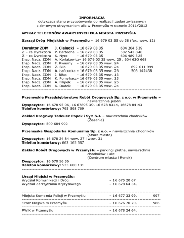 INFORMACJA dotycząca stanu przygotowania do realizacji zadań związanych z zimowym utrzymaniem ulic w Przemyślu w sezonie 2011/2012 WYKAZ TELEFONÓW AWARYJNYCH DLA MIASTA PRZEMYŚLA Zarząd Dróg Miejskich w Przemyślu - 16 679 03 35 do 38 (fax. wew. 12) Dyrektor ZDM J. Cielecki – 16 679 03 35 604 204 539 Z – ca Dyrektora P. Bartocha – 16 679 03 35 502 542 848 Z – ca Dyrektora K. Nycz – 16 679 03 35 606 489 325 Insp. Nadz. ZDM A. Korlatowicz– 16 679 03 35 wew. 25 , 604 620 668 Insp. Nadz. ZDM F. Kwaśny – 16 679 03 35 wew. 24 Insp. Nadz. ZDM Z. Bilo – 16 679 03 35 wew. 24 692 011 999 Insp. Nadz. ZDM A. Łańcucka – 16 679 03 35 wew. 26 506 142438 Insp. Nadz. ZDM J. Biłas – 16 679 03 35 wew. 13 Insp. Nadz. ZDM K. Pomykacz– 16 679 03 35 wew. 13 Insp. Nadz. ZDM A. Filipek – 16 679 03 35 wew. 25 Insp. Nadz. ZDM K. Dudek – 16 679 03 35 wew. 24 -----------------------------------------------------------------------------------------Przemyskie Przedsiębiorstwo Robót Drogowych Sp. z o.o. w Przemyślu – nawierzchnia jezdni Dyspozytor: 16 678 95 06, 16 67895 39, 16 678 8314, 16678 84 43 Telefon komórkowy: 795 598 769 Zakład Drogowy Tadeusz Popek i Syn S.J. – nawierzchnia chodników (Zasanie) Dyspozytor: 509 684 992 Przemyska Gospodarka Komunalna Sp. z o.o. – nawierzchnia chodników (Stare Miasto) Dyspozytor: 16 678 24 84 wew. 27 i wew. 31 Telefon komórkowy: 662 165 587 Zakład Robót Drogowych w Przemyślu – parkingi płatne, nawierzchnia chodników i ulic (Centrum miasta i Rynek) Dyspozytor: 16 670 56 56 Telefon komórkowy: 533 600 131 -----------------------------------------------------------------------------------------Urząd Miejski w Przemyślu: Wydział Komunikacji i Dróg Wydział Zarządzania Kryzysowego – 16 675 20 67 – 16 678 64 34, -----------------------------------------------------------------------------------------Miejska Komenda Policji w Przemyślu – 16 677 33 99, 997 -----------------------------------------------------------------------------------------Straż Miejska w Przemyślu – 16 676 70 70, 986 -----------------------------------------------------------------------------------------PWiK w Przemyślu – 16 678 24 64, ------------------------------------------------------------------------------------------ 2 PGM w Przemyślu – 16 678 66 37, -----------------------------------------------------------------------------------------Pogotowie Energetyczne – 16 676 30 00, 991 -----------------------------------------------------------------------------------------Dyspozytor MZK – 16 678 60 69, -----------------------------------------------------------------------------------------Dyspozytor PKS – 16 678 91 84, ----------------------------------------------------------------------------------------------------------------- W wyniku rozstrzygniętego postępowania przetargowego na utrzymanie jezdni i ciągów pieszych wybrano wykonawców jak niżej: zimowe 1. Zimowe utrzymanie jezdni – ok. 141,1 km Przemyślu Wykonawca - Przemyskie Przedsiębiorstwo Robót Drogowych w spółka z ograniczoną odpowiedzialnością, 37-700 Przemyśl, ul. Sielecka 2 Wartość umowy brutto – 1.933.345,55 zł Osoby odpowiedzialne za realizację umowy ze strony wykonawcy: - Janusz Sobol tel. 662 145 841 Osoby odpowiedzialne za nadzór ze strony ZDM: - Andrzej Korlatowicz – tel. 16 679 03 35 wew. 25 0604 620 668 - Florian Kwaśny – tel. 16 679 03 35 wew. 24 Zabezpieczenie materiałów na bazie wykonawcy : Ilość sprzętu niezbędnego w posiadaniu wykonawcy : − − − − − − 200 m3 300 ton 5 ton 2 ton piasek chlorek sodu – Na Cl chlorek wapnia – CaCl2 mocznik do zimowego utrzymania pługopiaskarka pługosolarka ciągnik z pługiem (napęd na 4 koła) ciągnik z pługiem + rozsiewacz samochód dostawczy lub osobowy ładowarka 2. Zimowe utrzymanie ciągów Przemyśla – 30.476 m2 jezdni będącego – 3szt. – 3szt. – 2szt. – 3szt. – 1szt. – 2szt. pieszych – strona prawa Wykonawca - Przemyska Gospodarka Komunalna Spółka z odpowiedzialnością, 37-700 Przemyśl, ul. Słowackiego 104 Wartość umowy brutto – 200.000,00 zł Osoby odpowiedzialne za realizację umowy ze strony wykonawcy: - Piotr Przybylski - Małgorzata Skórka Całodobowa łączność – 662 165 587 Osoby odpowiedzialne za nadzór ze strony ZDM: - Krystyna Dudek tel. 16 679 03 35 w. 24 - Anna Filipek tel. 16 679 03 35 w. 25 miasta ograniczoną 3 Zabezpieczenie materiałów na bazie wykonawcy : piasek – 30 t sól drogowa – 9t mieszanka piaskowo-solna - 55 t Ilość sprzętu niezbędnego do zimowego utrzymania ciągów pieszych – strona prawa miasta Przemyśla, będącego w posiadaniu wykonawcy : • pług lekki samojezdny (o masie do 1 Mg) • lekki ciągnik z pługiem • pług wirnikowy ręczny – 2 szt. – 1 szt. – 1 szt. 3. Zimowe utrzymanie ciągów pieszych – strona lewa miasta Przemyśla – 48.819 m2 Wykonawca - Zakład Drogowy Tadeusz Popek i syn spółka jawna, Rozbórz Długi 57A, 37-560 Pruchnik. Wartość umowy brutto – 300.000,00 zł Osoby odpowiedzialne za realizację umowy ze strony wykonawcy: - Henryk Osypanka tel. 509 684 992 Osoby odpowiedzialne za nadzór ze strony ZDM: - Krystyna Pomykacz tel. 16 679 03 35 w. 13 - Zbigniew Bilo tel. 16 679 03 35 w. 24 692 011 999 Zabezpieczenie materiałów na bazie wykonawcy : piasek – 100 m3 mieszanka piaskowo - solna – 40 m3 ponadto na bazie w Rozbórzu Długim zabezpieczono sól drogową Ilość sprzętu niezbędnego w posiadaniu wykonawcy : do zimowego utrzymania jezdni będącego • pług do zamontowania na samobieżnych nośnikach (miniciągnik) – 3 szt • szczotka mechaniczna – 1 szt. • Samochód dostawczy - 4 szt Z wyżej wymienionymi wykonawcami zostały zawarte umowy oraz dokonano przeglądów gotowości do Akcji Zimowej w sezonie 2011/2012. W wyniku przeglądów stwierdzono, że zarówno sprzęt jak i zapas materiałów do AZ został przygotowany zgodnie z