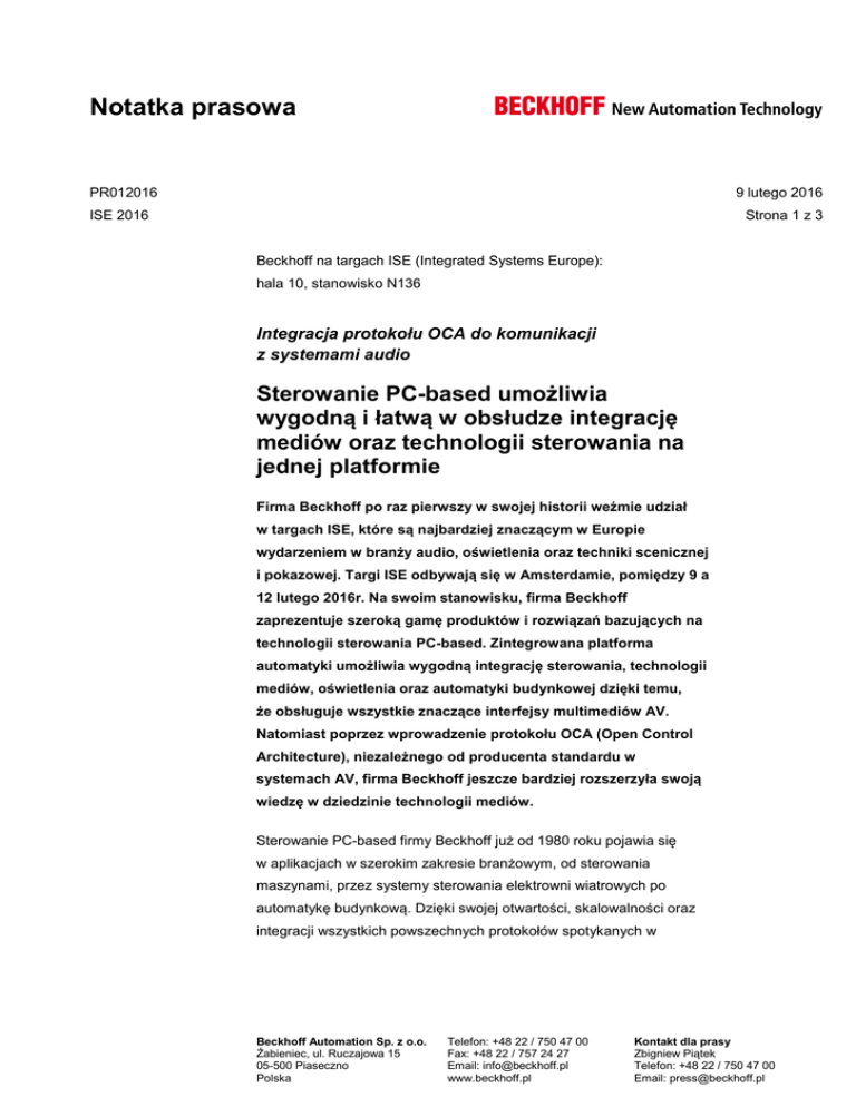 Notatka prasowa PR012016 9 lutego 2016 ISE 2016 Strona 1 z 3 Beckhoff na targach ISE (Integrated Systems Europe): hala 10, stanowisko N136 Integracja protokołu OCA do komunikacji z systemami audio Sterowanie PC-based umożliwia wygodną i łatwą w obsłudze integrację mediów oraz technologii sterowania na jednej platformie Firma Beckhoff po raz pierwszy w swojej historii weźmie udział w targach ISE, które są najbardziej znaczącym w Europie wydarzeniem w branży audio, oświetlenia oraz techniki scenicznej i pokazowej. Targi ISE odbywają się w Amsterdamie, pomiędzy 9 a 12 lutego 2016r. Na swoim stanowisku, firma Beckhoff zaprezentuje szeroką gamę produktów i rozwiązań bazujących na technologii sterowania PC-based. Zintegrowana platforma automatyki umożliwia wygodną integrację sterowania, technologii mediów, oświetlenia oraz automatyki budynkowej dzięki temu, że obsługuje wszystkie znaczące interfejsy multimediów AV. Natomiast poprzez wprowadzenie protokołu OCA (Open Control Architecture), niezależnego od producenta standardu w systemach AV, firma Beckhoff jeszcze bardziej rozszerzyła swoją wiedzę w dziedzinie technologii mediów. Sterowanie PC-based firmy Beckhoff już od 1980 roku pojawia się w aplikacjach w szerokim zakresie branżowym, od sterowania maszynami, przez systemy sterowania elektrowni wiatrowych po automatykę budynkową. Dzięki swojej otwartości, skalowalności oraz integracji wszystkich powszechnych protokołów spotykanych w Beckhoff Automation Sp. z o.o. Żabieniec, ul. Ruczajowa 15 05-500 Piaseczno Polska Telefon: +48 22 / 750 47 00 Fax: +48 22 / 757 24 27 Email: [email protected] www.beckhoff.pl Kontakt dla prasy Zbigniew Piątek Telefon: +48 22 / 750 47 00 Email: [email protected] Notatka prasowa PR012016 9 lutego 2016 ISE 2016 Strona 2 z 3 mediach i technice scenicznej, firma Beckhoff zaczyna być niezastąpiona także w świecie technologii medialnej i pokazowej. Sercem systemu sterowania jest przemysłowy komputer PC z platformą programistyczną TwinCAT. Komputer ten, w połączeniu z EtherCAT’em - ethernetowym protokołem czasu rzeczywistego, składa się na kompletną, bardzo wydajną platformę automatyki umożliwiającą integrację sterowania PLC, wizualizacji, techniki napędowej, technologii bezpieczeństwa oraz wysokiej jakości pomiarów. Modułowy system I/O firmy Beckhoff stosuje się następnie do podłączenia czujników oraz urządzeń wykonawczych. Ponad 400 modułów do podłączenia szerokiej gamy sygnałów cyfrowych i analogowych, oświetlenia, techniki napędowej i funkcji bezpieczeństwa aż do kategorii SIL 3. Skalowalne komponenty silników obrotowych i liniowych, spełniają wszystkie wyśrubowane wymagania bardzo precyzyjnego sterowania obiektami ruchomymi. DALI /LON – szeroki wachlarz interfejsów do podłączenia innych systemów i urządzeń Platforma automatyki firmy Beckhoff umożliwia integrację takich standardów jak OCA, DMX, SMPTE Timecode, Crestron, Bang & Olufsen, Art-NetTM oraz Streaming ACN (sACN), czyli wszystkich tych, które są znaczące w technologii medialnej i scenicznej. W automatyce budynkowej, system ten może dodatkowo obsługiwać protokół KNX/EIB, DALI, BACnet, M-Bus, MP-Bus oraz SMI. „Dzięki implementacji standardu OCA nasz modułowy system stał się jeszcze bardziej elastyczny, umożliwiając zdalne sterowanie profesjonalnymi systemami audio”, podsumowuje Michel Matuschke, Vertical Market Manager odpowiedzialny w firmie Beckhoff za technikę sceniczną i pokazową. Beckhoff Automation Sp. z o.o. Żabieniec, ul. Ruczajowa 15 05-500 Piaseczno Polska Telefon: +48 22 / 750 47 00 Fax: +48 22 / 757 24 27 Email: [email protected] www.beckhoff.pl Kontakt dla prasy Zbigniew Piątek Telefon: +48 22 / 750 47 00 Email: [email protected] Notatka prasowa PR012016 9 lutego 2016 ISE 2016 Strona 3 z 3 Wszystkie systemy wraz z ich funkcjonalnością można zaprogramować i skonfigurować za pomocą narzędzia programistycznego TwinCAT. Dostępne jest dla niego również wiele rozszerzeń - komponentów programowych dedykowanych do diagnostyki i konfiguracji, które znacznie upraszczają proces uruchomienia systemu. Zdjęcia dla prasy: Zdjęcie do notatki: Poprzez wprowadzenie protokołu OCA (Open Control Architecture), niezależnego od producenta standardu w systemach AV, firma Beckhoff jeszcze bardziej rozszerzyła swoją wiedzę w dziedzinie technologii mediów. Tekst i zdjęcie: download.beckhoff.com/download/press/2016/pictures/ pr012016_Beckhoff.zip Zapytania dotyczące „Open Control Architecture” prosimy kierować do: Beckhoff Automation Sp. z o.o. Żabieniec, ul. Ruczajowa 15, 05-500 Piaseczno, Polska Telefon: +48 22 / 750 47 00, Fax: +48 22 / 757 24 27 Email: [email protected], www.beckhoff.pl Beckhoff Automation Sp. z o.o. Żabieniec, ul. Ruczajowa 15 05-500 Piaseczno Polska Telefon: +48 22 / 750 47 00 Fax: +48 22 / 757 24 27 Email: [email protected] www.beckhoff.pl Kontakt dla prasy Zbigniew Piątek Telefon: +48 22 / 750 47 00 Email: [email protected]