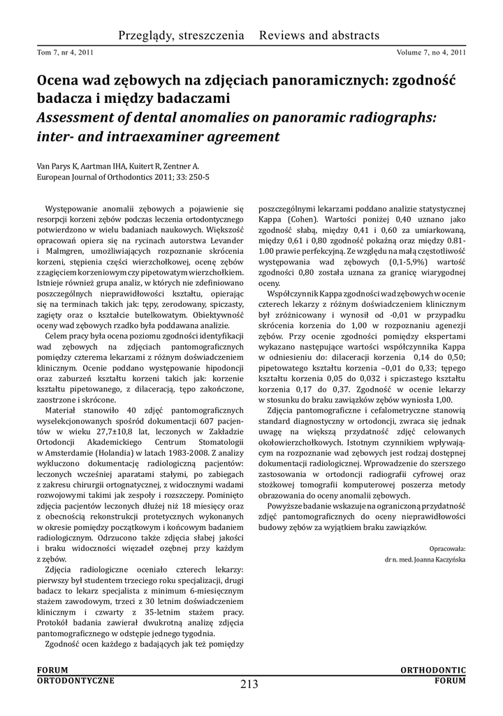 Przeglądy, streszczenia Reviews and abstracts Tom 7, nr 4, 2011 Volume 7, no 4, 2011 Ocena wad zębowych na zdjęciach panoramicznych: zgodność badacza i między badaczami Assessment of dental anomalies on panoramic radiographs: inter- and intraexaminer agreement Van Parys K, Aartman IHA, Kuitert R, Zentner A. European Journal of Orthodontics 2011; 33: 250-5 Występowanie anomalii zębowych a pojawienie się resorpcji korzeni zębów podczas leczenia ortodontycznego potwierdzono w wielu badaniach naukowych. Większość opracowań opiera się na rycinach autorstwa Levander i Malmgren, umożliwiających rozpoznanie skrócenia korzeni, stępienia części wierzchołkowej, ocenę zębów z zagięciem korzeniowym czy pipetowatym wierzchołkiem. Istnieje również grupa analiz, w których nie zdefiniowano poszczególnych nieprawidłowości kształtu, opierając się na terminach takich jak: tępy, zerodowany, spiczasty, zagięty oraz o kształcie butelkowatym. Obiektywność oceny wad zębowych rzadko była poddawana analizie. Celem pracy była ocena poziomu zgodności identyfikacji wad zębowych na zdjęciach pantomograficznych pomiędzy czterema lekarzami z różnym doświadczeniem klinicznym. Ocenie poddano występowanie hipodoncji oraz zaburzeń kształtu korzeni takich jak: korzenie kształtu pipetowanego, z dilaceracją, tępo zakończone, zaostrzone i skrócone. Materiał stanowiło 40 zdjęć pantomograficznych wyselekcjonowanych spośród dokumentacji 607 pacjentów w wieku 27,7±10,8 lat, leczonych w Zakładzie Ortodoncji Akademickiego Centrum Stomatologii w Amsterdamie (Holandia) w latach 1983-2008. Z analizy wykluczono dokumentację radiologiczną pacjentów: leczonych wcześniej aparatami stałymi, po zabiegach z zakresu chirurgii ortognatycznej, z widocznymi wadami rozwojowymi takimi jak zespoły i rozszczepy. Pominięto zdjęcia pacjentów leczonych dłużej niż 18 miesięcy oraz z obecnością rekonstrukcji protetycznych wykonanych w okresie pomiędzy początkowym i końcowym badaniem radiologicznym. Odrzucono także zdjęcia słabej jakości i braku widoczności więzadeł ozębnej przy każdym z zębów. Zdjęcia radiologiczne oceniało czterech lekarzy: pierwszy był studentem trzeciego roku specjalizacji, drugi badacz to lekarz specjalista z minimum 6-miesięcznym stażem zawodowym, trzeci z 30 letnim doświadczeniem klinicznym i czwarty z 35-letnim stażem pracy. Protokół badania zawierał dwukrotną analizę zdjęcia pantomograficznego w odstępie jednego tygodnia. Zgodność ocen każdego z badających jak też pomiędzy poszczególnymi lekarzami poddano analizie statystycznej Kappa (Cohen). Wartości poniżej 0,40 uznano jako zgodność słabą, między 0,41 i 0,60 za umiarkowaną, między 0,61 i 0,80 zgodność pokaźną oraz między 0.811.00 prawie perfekcyjną. Ze względu na małą częstotliwość występowania wad zębowych (0,1-5,9%) wartość zgodności 0,80 została uznana za granicę wiarygodnej oceny. Współczynnik Kappa zgodności wad zębowych w ocenie czterech lekarzy z różnym doświadczeniem klinicznym był zróżnicowany i wynosił od -0,01 w przypadku skrócenia korzenia do 1,00 w rozpoznaniu agenezji zębów. Przy ocenie zgodności pomiędzy ekspertami wykazano następujące wartości współczynnika Kappa w odniesieniu do: dilaceracji korzenia 0,14 do 0,50; pipetowatego kształtu korzenia –0,01 do 0,33; tępego kształtu korzenia 0,05 do 0,032 i spiczastego kształtu korzenia 0,17 do 0,37. Zgodność w ocenie lekarzy w stosunku do braku zawiązków zębów wyniosła 1,00. Zdjęcia pantomograficzne i cefalometryczne stanowią standard diagnostyczny w ortodoncji, zwraca się jednak uwagę na większą przydatność zdjęć celowanych okołowierzchołkowych. Istotnym czynnikiem wpływającym na rozpoznanie wad zębowych jest rodzaj dostępnej dokumentacji radiologicznej. Wprowadzenie do szerszego zastosowania w ortodoncji radiografii cyfrowej oraz stożkowej tomografii komputerowej poszerza metody obrazowania do oceny anomalii zębowych. Powyższe badanie wskazuje na ograniczoną przydatność zdjęć pantomograficznych do oceny nieprawidłowości budowy zębów za wyjątkiem braku zawiązków. Opracowała: dr n. med. Joanna Kaczyńska ForumOrthodontic Ortodontyczneforum 213