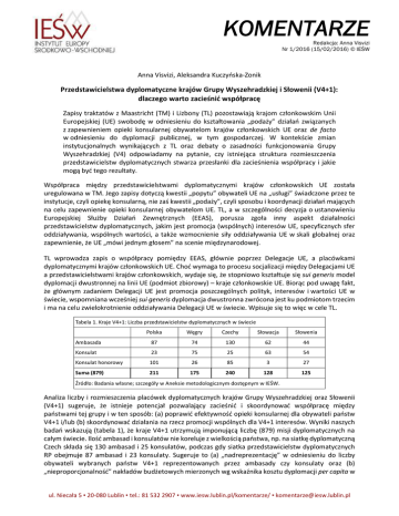 KOMENTARZE Redakcja: Anna Visvizi Nr 1/2016 (15/02/2016) © IEŚW Anna Visvizi, Aleksandra Kuczyńska-Zonik Przedstawicielstwa dyplomatyczne krajów Grupy Wyszehradzkiej i Słowenii (V4+1): dlaczego warto zacieśnić współpracę Zapisy traktatów z Maastricht (TM) i Lizbony (TL) pozostawiają krajom członkowskim Unii Europejskiej (UE) swobodę w odniesieniu do kształtowania „podaży” działań związanych z zapewnieniem opieki konsularnej obywatelom krajów członkowskich UE oraz de facto w odniesieniu do dyplomacji publicznej, w tym gospodarczej. W kontekście zmian instytucjonalnych wynikających z TL oraz debaty o zasadności funkcjonowania Grupy Wyszehradzkiej (V4) odpowiadamy na pytanie, czy istniejąca struktura rozmieszczenia przedstawicielstw dyplomatycznych stwarza przesłanki dla zacieśnienia współpracy i jakie mogą być tego rezultaty. Współpraca między przedstawicielstwami dyplomatycznymi krajów członkowskich UE została uregulowana w TM. Jego zapisy dotyczą kwestii „popytu” obywateli UE na „usługi” świadczone przez te instytucje, czyli opiekę konsularną, nie zaś kwestii „podaży”, czyli sposobu i koordynacji działań mających na celu zapewnienie opieki konsularnej obywatelom UE. TL, a w szczególności decyzja o ustanowieniu Europejskiej Służby Działań Zewnętrznych (EEAS), porusza zgoła inny aspekt działalności przedstawicielstw dyplomatycznych, jakim jest promocja (wspólnych) interesów UE, specyficznych sfer oddziaływania, wspólnych wartości, a także wzmocnienie siły oddziaływania UE w skali globalnej oraz zapewnienie, że UE „mówi jednym głosem” na scenie międzynarodowej. TL wprowadza zapis o współpracy pomiędzy EEAS, głównie poprzez Delegacje UE, a placówkami dyplomatycznymi krajów członkowskich UE. Choć wymaga to procesu socjalizacji między Delegacjami UE a przedstawicielstwami krajów członkowskich, wydaje się, że stopniowo kształtuje się sui generis model dyplomacji dwustronnej na linii UE (podmiot zbiorowy) – kraje członkowskie UE. Biorąc pod uwagę fakt, że głównym zadaniem Delegacji UE jest promocja poszczególnych polityk, interesów i wartości UE w świecie, wspomniana wcześniej sui generis dyplomacja dwustronna zwrócona jest ku podmiotom trzecim i ma na celu zwielokrotnienie oddziaływania Delegacji UE w świecie. Wpisuje się to więc w cele TL. Tabela 1. Kraje V4+1: Liczba przedstawicielstw dyplomatycznych w świecie Polska Węgry Czechy Słowacja Słowenia Ambasada 87 74 130 62 44 Konsulat 23 75 25 63 54 Konsulat honorowy 101 26 85 3 27 Suma (879) 211 175 240 128 125 Źródło: Badania własne; szczegóły w Aneksie metodologicznym dostępnym w IEŚW. Analiza liczby i rozmieszczenia placówek dyplomatycznych krajów Grupy Wyszehradzkiej oraz Słowenii (V4+1) sugeruje, że istnieje potencjał pozwalający zacieśnić i skoordynować współpracę między państwami tej grupy i w ten sposób: (a) poprawić efektywność opieki konsularnej dla obywateli państw V4+1 i/lub (b) skoordynować działania na rzecz promocji wspólnych dla V4+1 interesów. Wyniki naszych badań wskazują (tabela 1), że kraje V4+1 utrzymują imponującą liczbę (879) misji dyplomatycznych na całym świecie. Ilość ambasad i konsulatów nie koreluje z wielkością państwa, np. na siatkę dyplomatyczną Czech składa się 130 ambasad i 25 konsulatów, podczas gdy siatka przedstawicielstw dyplomatycznych RP obejmuje 87 ambasad i 23 konsulaty. Sugeruje to (a) „nadreprezentację” w odniesieniu do liczby obywateli wybranych państw V4+1 reprezentowanych przez ambasady czy konsulaty oraz (b) „nieproporcjonalność” nakładów budżetowych mierzonych wg wskaźnika kosztu dyplomacji per capita w ul. Niecała 5 ▪ 20-080 Lublin ▪ tel.: 81 532 2907 ▪ www.iesw.lublin.pl/komentarze/ ▪ [email protected] odniesieniu do wielkości populacji. Rzeczywiście, wyniki wcześniejszych badań wskazują, że ambasady słoweńskie reprezentują średnio 50 069 obywateli, podczas gdy ambasady RP średnio 424 305 obywateli. W odniesieniu do opieki konsularnej relacja liczby konsulatów do liczebności populacji Słowenii wynosi 256 603; ten sam współczynnik dla Polski wynosi 1 032 094. Choć dokładne dane dotyczące wielkości nakładów budżetowych związanych z utrzymaniem siatki przedstawicielstw dyplomatycznych w świecie pozostają kwestią przyszłych analiz, widoczna jest tendencja redukowania wydatków na ten cel w krajach V4+1. Np. na przestrzeni lat 2014-2015 Słowacja zmniejszyła wydatki budżetowe na ww. cel o 11%, tj. z 70 mln EUR do 62,5 mln EUR. Podobnie czeskie MSZ rozważa zamknięcie 45 (20%) misji dyplomatycznych i szacuje wynikające z tego oszczędności budżetowe. W celu zapobieżenia możliwości spadku efektywności opieki konsularnej oferowanej obywatelom V4+1, warto rozważyć następujące działania: (a) koordynację współpracy w dziedzinie opieki konsularnej krajów V4+1 oraz wybranych aspektów dyplomacji publicznej przez alianse strategiczne oraz (b) poprawę produktywności dzięki wykorzystaniu efektów skali (scale effect), zasięgu (scope effect) oraz mnożnika (multiplier). W krajach UE i – szerzej – OECD widoczny jest proces harmonizacji regulacji w zakresie opieki konsularnej i definicji tejże koncepcji. Logiczne wydaje się, że w odniesieniu do koncepcji „opieki konsularnej” w niedalekiej przyszłości wszystkie kraje V4+1 wdrożą model bazujący na definicji zawartej w konwencji wiedeńskiej. Stwarza to pozytywne przesłanki prawne dla skoordynowania działań i wypracowania modelu (aliansu strategicznego) współpracy między krajami V4+1 w wybranych lokalizacjach. W odniesieniu do opieki konsularnej ma to szczególne znaczenie w lokalizacjach, gdzie tylko jedno/dwa państwa grupy utrzymują przedstawicielstwo, jak Czechy (Oman, Czad, Kongo, Mauretania, Kamerun, Wybrzeże Kości Słoniowej) czy Polska i Czechy (Malezja), oraz w specyficznych lokalizacj