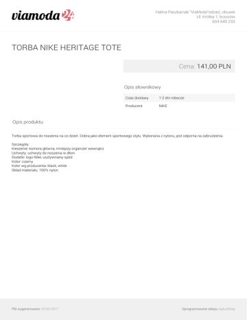 Halina Paszkaniak "ViaModa"odzież, obuwie Ul. Krótka 1, brzozów 604 645 233 TORBA NIKE HERITAGE TOTE Cena: 141,00 PLN Opis słownikowy Czas dostawy 1-2 dni robocze Producent NIKE Opis produktu Torba sportowa do noszenia na co dzień. Dobra jako element sportowego stylu. Wykonana z nylonu, jest odporna na zabrudzenia. Szczegóły: Kieszenie: komora główna, mniejszy organizer wewnątrz Uchwyty: uchwyty do noszenia w dłoni Dodatki: logo Nike, usztywniany spód Kolor: czarny Kolor wg producenta: black, white Skład materiału: 100% nylon Plik wygenerowano: 03-03-2017 Powered by TCPDF (www.tcpdf.org) Oprogramowanie sklepu: AptusShop