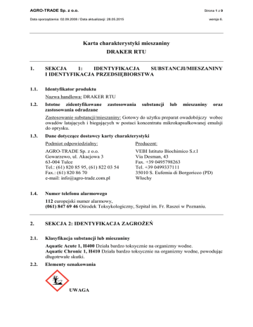 AGRO-TRADE Sp. z o.o. Strona 1 z 9 Data sporządzenia: 02.09.2008 / Data aktualizacji: 28.05.2015 wersja 6. Karta charakterystyki mieszaniny DRAKER RTU 1. SEKCJA 1: IDENTYFIKACJA SUBSTANCJI/MIESZANINY I IDENTYFIKACJA PRZEDSIĘBIORSTWA 1.1. Identyfikator produktu Nazwa handlowa: DRAKER RTU 1.2. Istotne zidentyfikowane zastosowania odradzane zastosowania substancji lub mieszaniny oraz Zastosowanie substancji/mieszaniny: Gotowy do użytku preparat owadobójczy wobec owadów latających i biegających w postaci koncentratu mikrokapsułkowanej emulsji do oprysku. 1.3. 1.4. Dane dotyczące dostawcy karty charakterystyki Podmiot odpowiedzialny: Producent: AGRO-TRADE Sp. z o.o. Gowarzewo, ul. Akacjowa 3 63-004 Tulce Tel.: (61) 820 85 95, (61) 822 03 54 Fax.: (61) 820 86 70 e-mail: [email protected] VEBI Istituto Biochimico S.r.l Via Desman, 43 Fax. +39 0495798263 Tel. +39 0499337111 35010 S. Eufemia di Borgoricco (PD) Włochy Numer telefonu alarmowego 112 europejski numer alarmowy, (061) 847 69 46 Ośrodek Toksykologiczny, Szpital im. Fr. Raszei w Poznaniu. 2. SEKCJA 2: IDENTYFIKACJA ZAGROŻEŃ 2.1. Klasyfikacja substancji lub mieszaniny Aquatic Acute 1, H400 Działa bardzo toksycznie na organizmy wodne. Aquatic Chronic 1, H410 Działa bardzo toksycznie na organizmy wodne, powodując długotrwałe skutki. 2.2. Elementy oznakowania UWAGA AGRO-TRADE Sp. z o.o. Strona 2 z 9 Data sporządzenia: 02.09.2008 / Data aktualizacji: 28.05.2015 wersja 6. H410 Działa bardzo toksycznie na organizmy wodne, powodując długotrwałe skutki. P101 W razie konieczności zasięgnięcia porady lekarza należy pokazać pojemnik lub etykietę. P102 Chronić przed dziećmi. P103 Przed użyciem przeczytać etykietę. P273 Unikać uwolnienia do środowiska. P391 Zebrać wyciek. P501 Usuwać produkt/opakowanie zgodnie z przepisami. 2.3. Inne zagrożenia Brak danych. 3. SEKCJA 3: SKŁAD / INFORMACJA O SKŁADNIKACH 3.1. Substancje Nie dotyczy. 3.2. Mieszaniny Nr CAS Nr WE Stęż % 51-03-6 200-076-7 0,3 Tetrametryna 7696-12-0 231-711-6 0,06 Cypermetryna/ 3(2,2-dichlorowinylo)2,2dimetylocyklopropanokarboksylan.alfa.cyjano-3-fenoksybenzylu 52315-07-8 257-842-9 0,3 Nazwa substancji Butotlenek piperonylu/ eter 2-(2butoksyetoksy)etylo-6propylopiperonylowy Klasyfikacja zgodnie z: Dyrektywą Rozporządzeniem 67/548/EWG (WE) 1272/2008 Aquatic Acute 1, N, R50/53 Aquatic Chronic 1, H400, H410 Aquatic Acute 1, N, R50/53 Aquatic Chronic 1, H400, H410 Acute Tox. 3, Aquatic Acute 1, Aquatic Chronic 1, N, Xn, R20/22, STOT RE 2, R37, R50/53 STOT SE 3, H301, H335, H373, H400, H410 Dodatkowe informacje: Pełne brzmienie klasyfikacji zagrożenia, zwrotów R i zwrotów H podano w sekcji 16. 4. SEKCJA 4: ŚRODKI PIERWSZEJ POMOCY 4.1. Opis środków pierwszej pomocy Wskazówki ogólne: Natychmiast usunąć odzież zanieczyszczoną preparatem. W przypadku złego samopoczucia wezwać pomoc lekarską. Osobom nieprzytomnym nie podawać nic doustnie. Wdychanie: Osoby mające kontakt z preparatem wyprowadzić na świeże powietrze. Wezwać lekarza. AGRO-TRADE Sp. z o.o. Strona 3 z 9 Data sporządzenia: 02.09.2008 / Data aktualizacji: 28.05.2015 wersja 6. Kontakt ze skórą: Natychmiast usunąć odzież zanieczyszczoną preparatem. Natychmiast dokładnie myć dużą ilością wody z mydłem. Skontaktować się z lekarzem. Kontakt z oczami: Nie stosować żadnych kosmetyków ani maści do oczu przed konsultacją z okulistą. Oczy natychmiast płukać dużą ilością wody przez przynajmniej 10 minut, trzymając odchylone powieki. Połknięcie: Natychmiast wezwać lekarza. Pokazać kartę charakterystyki, a usta przepłukać dużą ilością wody. 4.2. Najważniejsze ostre i opóźnione objawy oraz skutki narażenia Brak danych. 4.3. Wskazania dotyczące wszelkiej natychmiastowej i szczególnego postępowania z poszkodowanym pomocy lekarskiej Leczenie objawowe. 5. SEKCJA 5: POSTĘPOWANIE W PRZYPADKU POŻARU 5.1. Środki gaśnicze Optymalne środki gaśnicze: w zależności od otoczenia: piana, suche środki gaśnicze, dwutlenek węgla, strumień rozpylonej wody. Środki gaśnicze niewłaściwe ze względów bezpieczeństwa: brak 5.2. Szczególne zagrożenia związane z substancją chemiczną Brak danych. 5.3. Informacje dla straży pożarnej Stosować ochronę dróg oddechowych. Nie wdychać dymu. 6. SEKCJA 6: POSTĘPOWANIE W PRZYPADKU NIEZAMIERZONEGO UWOLNIENIA DO ŚRODOWISKA 6.1. Indywidualne środki ostrożności, w sytuacjach awaryjnych wyposażenie ochronne i procedury Stosować ochronę dróg oddechowych. 6.2. Środki ostrożności w zakresie ochrony środowiska Nie dopuścić, aby substancja przedostała się do kanalizacji lub powierzchniowych i gruntowych. Nie dopuścić do przedostania się do gleby. 6.3. wód Metody i materiały zapobiegające rozprzestrzenianiu się skażenia i służące do usuwania skażenia AGRO-TRADE Sp. z o.o. Strona 4 z 9 Data sporządzenia: 02.09.2008 / Data aktualizacji: 28.05.2015 wersja 6. Zbierać szybko będąc ubranym w ubranie ochronne i ochronę dróg oddechowych. Zapobiegać przedostaniu się produktu do kanalizacji. Zbierać za pomocą obojętnych środków wiążących. Powierzchnie zanieczyszczone dokładnie oczyścić. 6.4. Odniesienia do innych sekcji Sekcje: 7, 8, 13. 7. SEKCJA 7: POSTĘPOWANIE Z SUBSTANCJAMI I MIESZANINAMI ORAZ ICH MAGAZYNOWANIE 7.1. Środki ostrożności dotyczące bezpiecznego postępowania Pojemniki przechowywać szczelnie zamknięte. Unikać kontaktu preparatu ze skórą, oczami. Nie wdychać powstałej mgły lub oparów. Nie jeść, nie pić i nie palić tytoniu podczas stosowania produktu. 7.2. Warunki bezpiecznego magazynowania, łącznie z informacjami dotyczącymi wszelkich wzajemnych niezgodności Pojemniki przechowywać szczelnie zamknięte w suchym, chłodnym i dobrze wentylowanym miejscu. Przestrzegać zasad chroniących przed eksplozją. Nie składować razem ze środkami utleniającymi. Trzymać z dala od środków spożywczych, napojów i pasz. 7.3. Szczególne zastosowan