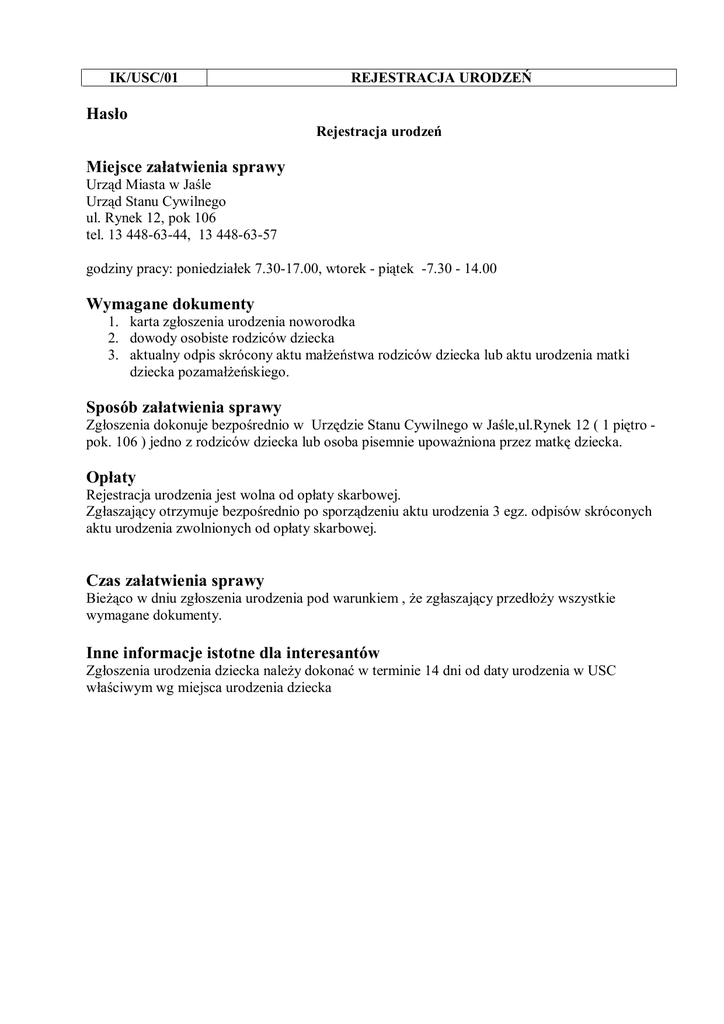 IK/USC/01 REJESTRACJA URODZEŃ Hasło Rejestracja urodzeń Miejsce załatwienia sprawy Urząd Miasta w Jaśle Urząd Stanu Cywilnego ul. Rynek 12, pok 106 tel. 13 448-63-44, 13 448-63-57 godziny pracy: poniedziałek 7.30-17.00, wtorek - piątek -7.30 - 14.00 Wymagane dokumenty 1. karta zgłoszenia urodzenia noworodka 2. dowody osobiste rodziców dziecka 3. aktualny odpis skrócony aktu małżeństwa rodziców dziecka lub aktu urodzenia matki dziecka pozamałżeńskiego. Sposób załatwienia sprawy Zgłoszenia dokonuje bezpośrednio w Urzędzie Stanu Cywilnego w Jaśle,ul.Rynek 12 ( 1 piętro pok. 106 ) jedno z rodziców dziecka lub osoba pisemnie upoważniona przez matkę dziecka. Opłaty Rejestracja urodzenia jest wolna od opłaty skarbowej. Zgłaszający otrzymuje bezpośrednio po sporządzeniu aktu urodzenia 3 egz. odpisów skróconych aktu urodzenia zwolnionych od opłaty skarbowej. Czas załatwienia sprawy Bieżąco w dniu zgłoszenia urodzenia pod warunkiem , że zgłaszający przedłoży wszystkie wymagane dokumenty. Inne informacje istotne dla interesantów Zgłoszenia urodzenia dziecka należy dokonać w terminie 14 dni od daty urodzenia w USC właściwym wg miejsca urodzenia dziecka