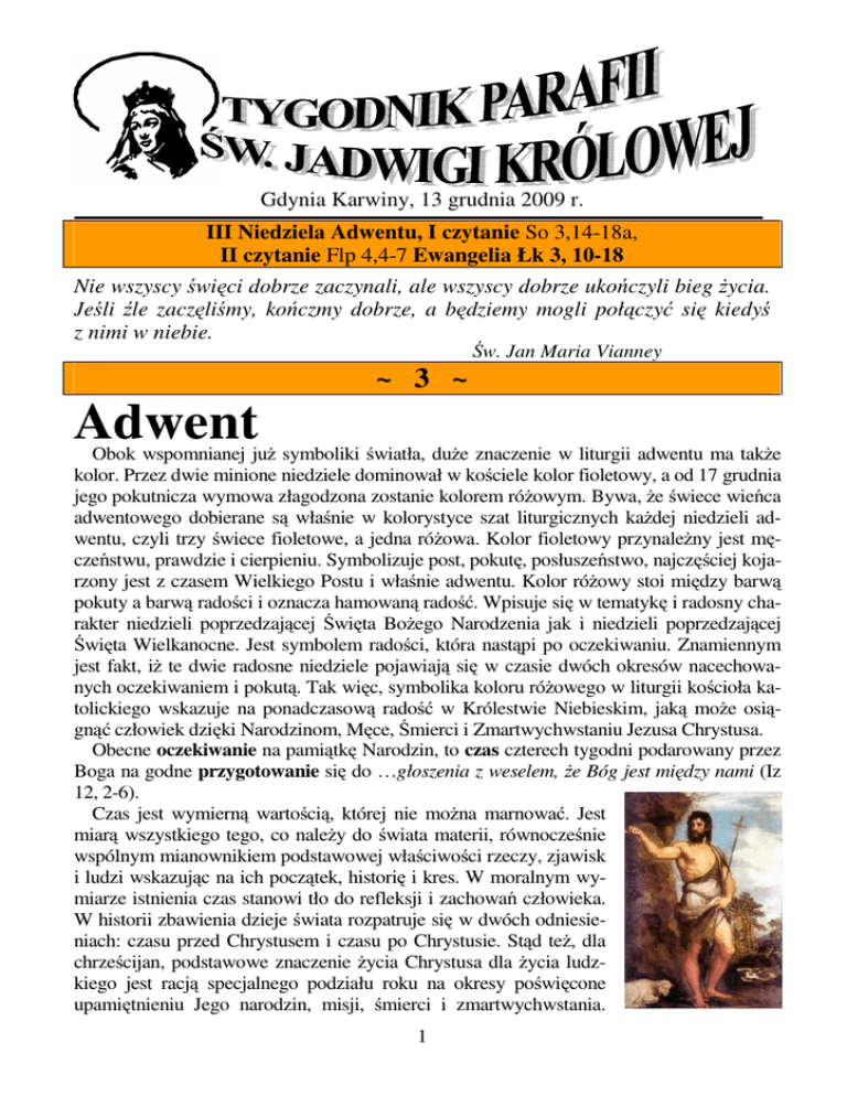 Gdynia Karwiny, 13 grudnia 2009 r. III Niedziela Adwentu, I czytanie So 3,14-18a, II czytanie Flp 4,4-7 Ewangelia Łk 3, 10-18 Nie wszyscy święci dobrze zaczynali, ale wszyscy dobrze ukończyli bieg życia. Jeśli źle zaczęliśmy, kończmy dobrze, a będziemy mogli połączyć się kiedyś z nimi w niebie. Św. Jan Maria Vianney ~ 3 ~ Adwent Obok wspomnianej już symboliki światła, duże znaczenie w liturgii adwentu ma także kolor. Przez dwie minione niedziele dominował w kościele kolor fioletowy, a od 17 grudnia jego pokutnicza wymowa złagodzona zostanie kolorem różowym. Bywa, że świece wieńca adwentowego dobierane są właśnie w kolorystyce szat liturgicznych każdej niedzieli adwentu, czyli trzy świece fioletowe, a jedna różowa. Kolor fioletowy przynależny jest męczeństwu, prawdzie i cierpieniu. Symbolizuje post, pokutę, posłuszeństwo, najczęściej kojarzony jest z czasem Wielkiego Postu i właśnie adwentu. Kolor różowy stoi między barwą pokuty a barwą radości i oznacza hamowaną radość. Wpisuje się w tematykę i radosny charakter niedzieli poprzedzającej Święta Bożego Narodzenia jak i niedzieli poprzedzającej Święta Wielkanocne. Jest symbolem radości, która nastąpi po oczekiwaniu. Znamiennym jest fakt, iż te dwie radosne niedziele pojawiają się w czasie dwóch okresów nacechowanych oczekiwaniem i pokutą. Tak więc, symbolika koloru różowego w liturgii kościoła katolickiego wskazuje na ponadczasową radość w Królestwie Niebieskim, jaką może osiągnąć człowiek dzięki Narodzinom, Męce, Śmierci i Zmartwychwstaniu Jezusa Chrystusa. Obecne oczekiwanie na pamiątkę Narodzin, to czas czterech tygodni podarowany przez Boga na godne przygotowanie się do …głoszenia z weselem, że Bóg jest między nami (Iz 12, 2-6). Czas jest wymierną wartością, której nie można marnować. Jest miarą wszystkiego tego, co należy do świata materii, równocześnie wspólnym mianownikiem podstawowej właściwości rzeczy, zjawisk i ludzi wskazując na ich początek, historię i kres. W moralnym wymiarze istnienia czas stanowi tło do refleksji i zachowań człowieka. W historii zbawienia dzieje świata rozpatruje się w dwóch odniesieniach: czasu przed Chrystusem i czasu po Chrystusie. Stąd też, dla chrześcijan, podstawowe znaczenie życia Chrystusa dla życia ludzkiego jest racją specjalnego podziału roku na okresy poświęcone upamiętnieniu Jego narodzin, misji, śmierci i zmartwychwstania. 1 W tym odniesieniu mówi się o roku liturgicznym, o czasie paschalnym lub wielkanocnym, o czasie wielkiego postu, czy jak obecnie - adwentu, czasie rozpoczynającym nowy rok liturgiczny. Na koniec warto wskazać na jeszcze jedną, ważną postać adwentu, którą obok Maryi jest Jan Chrzciciel. Jego osoba upamiętniana jest też m.in. poprzez popularny zwyczaj religijny, praktykowany w kościołach zwany „wędrowaniem” figurki Matki Boskiej po domach. Figurka trafia do tych rodzin, z których dzieci obecne na roratach, miały szczęście ją wylosować. Tradycja ta przypomina trud wędrówki Maryi do domu swej krewnej Elżbiety, także oczekującej na rozwiązanie. Podkreśla przy tym ogromne znaczenie postaci …tego, który prostował ścieżki Pana. Mija trzecia niedziela adwentu i czas już najwyższy na wybranie i wysłanie pocztą świątecznych kartek z własnoręcznie wypisanymi życzeniami. Chociaż, rzeczywiście trudno znaleźć coś z bożonarodzeniowym sensem pośród oferowanych w handlu rozmaitości, na których wyszczerzają się rozbawione renifery w czerwonych czapkach. Ten „reniferowy” trend usiłuje skutecznie zamazać zasadniczą przyczynę zbliżającej się Radości. Bo miejsce Nowonarodzonego, Jego Matki i św. Józefa zajmuje zstępujący z nieba Mikołaj na saniach, w asyście wspomnianych zwierząt z bogatym porożem i pozdrawiające ich z ziemi …bałwanki. Aleksandra Oksiuta-Borowska PARAFIALNY OBSERWATOR DUCHOWY Pani Jolanta podeszła do półki z odżywkami do włosów. Rozpakowała jedną, odkręciła i powąchała. Pokręciła nosem, wzięła inne opakowanie. Wózek był już pełen czas do kasy - pomyślała, lawirując między regałami i rozglądając się jednocześnie. Dostrzegła córkę. Ta była tak zajęta przeglądaniem kolekcji płyt, że nie dostrzegła matki. - Oliwia - zaparkowała wózek obok wózka córki - znajdź tatę, spotkamy się przy kasie. Obładowani pakunkami usiedli w ciastkarni. Hipermarket oferował firmowe lody, bardzo tanio. Zamówili podwójne porcje. Oblizując zabarwione, mrożone stożki, błądzili oczami po rzędach półek wypełnionych towarami. - Może wstąpimy do kościoła - ojciec, pan Olek spojrzał leniwie na zegarek - za chwilę zaczyna się Msza – chwycił za wypasione reklamówki. - No tak, przecież dziś niedziela - pani Jolanta obgryzła kawałek wafelka - niespiesznie podniosła swoją porcję zakupów. Wszystkie ławki były już zajęte. Stanęli na końcu nawy, otoczeni wielokolorowymi pakunkami. Przy ambonce dostrzegli księdza. Kończył właśnie czytać list biskupów. - Mieliśmy szczęście - szepnęła Oliwia akurat skończyły się te nudy - uśmiechnęła się do matki. Mężczyzna, stojący obok, spojrzał na nią oburzony. Wzgardliwie wydęła wargi. - Nie gadaj tyle, ludzie patrzą - matka uciszyła córkę. Organista rozpoczął pieśń na wyjście. Służba liturgiczna i ksiądz zaczęli wychodzić do zakrystii. - Wychodzimy - pani Jolanta kiwnęła na męża. W kruchcie ministranci rozdawali jakieś ulotki. Pan Olek odruchowo wziął jedną: Wielka wyprzedaż! Wino, mleko i chleb za darmo! W następną niedzielę, o godz.9.30, w naszym kościele. Każdy, kto przyjdzie na czas otrzyma również bonus: Wodę prosto ze Źródła! Zapraszamy! 2 - No widzisz, Oluś - pani Jolancie aż zalśniły oczy. - Tak, tak, nasz proboszcz pokręcił głową - na potwierdzenie swoich słów, pokręcił z uznaniem głową - zawsze wiedziałem, 