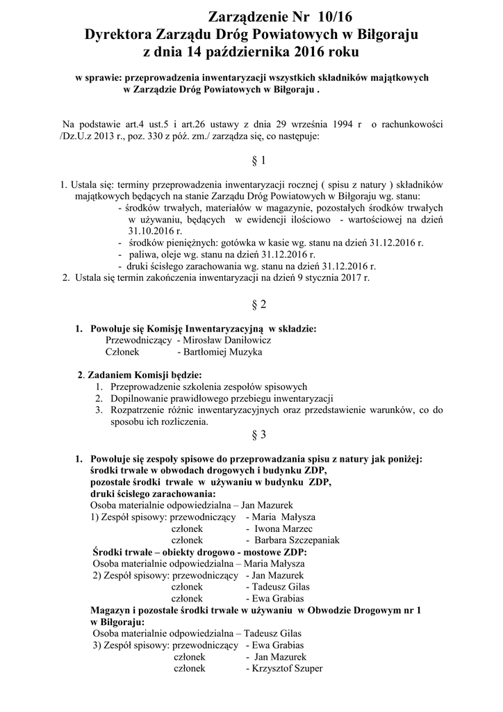 Zarządzenie Nr 10/16 Dyrektora Zarządu Dróg Powiatowych w Biłgoraju z dnia 14 października 2016 roku w sprawie: przeprowadzenia inwentaryzacji wszystkich składników majątkowych w Zarządzie Dróg Powiatowych w Biłgoraju . Na podstawie art.4 ust.5 i art.26 ustawy z dnia 29 września 1994 r /Dz.U.z 2013 r., poz. 330 z póź. zm./ zarządza się, co następuje: o rachunkowości §1 1. Ustala się: terminy przeprowadzenia inwentaryzacji rocznej ( spisu z natury ) składników majątkowych będących na stanie Zarządu Dróg Powiatowych w Biłgoraju wg. stanu: - środków trwałych, materiałów w magazynie, pozostałych środków trwałych w używaniu, będących w ewidencji ilościowo - wartościowej na dzień 31.10.2016 r. - środków pieniężnych: gotówka w kasie wg. stanu na dzień 31.12.2016 r. - paliwa, oleje wg. stanu na dzień 31.12.2016 r. - druki ścisłego zarachowania wg. stanu na dzień 31.12.2016 r. 2. Ustala się termin zakończenia inwentaryzacji na dzień 9 stycznia 2017 r. §2 1. Powołuje się Komisję Inwentaryzacyjną w składzie: Przewodniczący - Mirosław Daniłowicz Członek - Bartłomiej Muzyka 2. Zadaniem Komisji będzie: 1. Przeprowadzenie szkolenia zespołów spisowych 2. Dopilnowanie prawidłowego przebiegu inwentaryzacji 3. Rozpatrzenie różnic inwentaryzacyjnych oraz przedstawienie warunków, co do sposobu ich rozliczenia. §3 1. Powołuje się zespoły spisowe do przeprowadzania spisu z natury jak poniżej: środki trwałe w obwodach drogowych i budynku ZDP, pozostałe środki trwałe w używaniu w budynku ZDP, druki ścisłego zarachowania: Osoba materialnie odpowiedzialna – Jan Mazurek 1) Zespół spisowy: przewodniczący - Maria Małysza członek - Iwona Marzec członek - Barbara Szczepaniak Środki trwałe – obiekty drogowo - mostowe ZDP: Osoba materialnie odpowiedzialna – Maria Małysza 2) Zespół spisowy: przewodniczący - Jan Mazurek członek - Tadeusz Gilas członek - Ewa Grabias Magazyn i pozostałe środki trwałe w używaniu w Obwodzie Drogowym nr 1 w Biłgoraju: Osoba materialnie odpowiedzialna – Tadeusz Gilas 3) Zespół spisowy: przewodniczący - Ewa Grabias członek - Jan Mazurek członek - Krzysztof Szuper 2 Magazyn i pozostałe środki trwałe w używaniu w Obwodzie Drogowym nr 2 w Tarnogrodzie: Osoba materialnie odpowiedzialna – Zbigniew Grasza 4) Zespół spisowy: przewodniczący - Barbara Szczepaniak członek - Tadeusz Bryła członek - Artur Krzyszycha Magazyn i pozostałe środki trwałe w używaniu w Obwodzie Drogowym nr 3 w Teodorówce: Osoba materialnie odpowiedzialna – Leszek Biziorek 5) Zespół spisowy: przewodniczący - Joanna Łęcka członek - Zygmunt Szewczak członek - Józef Krawczyk 2. Zadaniem zespołów spisowych jw. jest przeprowadzenie spisu z natury wg. stanu na dzień 31 października 2016 r. Spisu należy dokonać na arkuszach spisowych, które należy zdać do Działu Finansowego w terminie do dnia 10 listopada 2016 r, a arkusze spisu paliwa do dnia 4 stycznia 2017 r. 3.Weryfikacji wartości niematerialnych i prawnych oraz gruntów będących w trwałym zarządzie Zarządu Dróg Powiatowych dokonuje Agnieszka Kostrubiec. 4.Weryfikacji pozostałych aktywów i pasywów Zarządu Dróg Powiatowych dokonuje Maria Sobań. 5.Drogą pisemnego potwierdzenia i uzgodnienia sald inwentaryzuje się: - krajowe i zagraniczne środki pieniężne zgromadzone na rachunkach bankowych na ostatni dzień roku obrotowego - należności z tytułu rozliczeń z kontrahentami na ostatni dzień roku obrotowego §4 Przed rozpoczęciem spisu z natury osoby materialnie odpowiedzialne za stan majątkowy złożą pisemne oświadczenie potwierdzające, że wszystkie zrealizowane dowody przychodu i rozchodu inwentaryzacyjnych składników zostały przekazane do Działu finansowego ZDP. §5 W okresie spisu z natury magazyn nie wydaje i nie przyjmuje żadnych składników majątkowych. §6 Zasady przeprowadzania inwentaryzacji określa Instrukcja służbowa przeprowadzenia inwentaryzacji w Zarządzie Dróg Powiatowych w Biłgoraju. dotycząca §7 Wykonanie zarządzenia powierza się Przewodniczącemu komisji inwentaryzacyjnej. §8 Zarządzenie wchodzi w życie z dniem podpisania. Otrzymują: 1) Przewodniczący i członek Komisji Inwentaryzacyjnej 2) Przewodniczący Zespołów Spisowych 3) Kierownicy obwodów drogowych