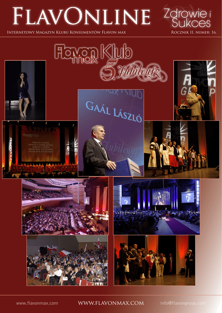 FlavOnline Internetowy Magazyn Klubu Konsumentów Flavon max www.flavonmax.com www.flavonmax.com Rocznik II. numer: 16. [email protected] FlavOnline 5 lat u boku Flavonu Już od pięciu lat każdego września członkowie Klubu Konsumentów Flavon max zbierają się, żeby razem świętować Jubileusz Klubu. W tym roku firma 5-lecie swojego powstania obchodziła 12 września w budapeszteńskim Centrum Kongresowym. W trakcie ośmiogodzinnej akademii organizatorzy wraz z uczestnikami ożywili wydarzenia minionego okresu. 16 sierpnia 2004 roku Klub Konsumentów Flavon max powstał w tym celu, aby udostępnić milionom ludzi szansę na zdrowsze i lepsze życie, za pomocą węgierskiego patentu – rodziny produktów Flavon max. Od tego czasu do Klubu przyłączyło się mnóstwo ludzi w całej Europie. Ponad połowa obrotów firmy generowana jest poza granicami kraju. O zagranicznym powodzeniu tej koncepcji świadczy także inauguracja biura w Rumunii, która nastąpi we wrześniu. Gościnnym wykładowcą był Prof. Dr. Zoltán Dinya, członek Węgierskiej Akademii Nauk. Tematem jego wykładu było przeniesienie dekalogu na grunt społeczności Klubu Flavon max. Pod koniec dnia 2500 uczestników opuszczało salę podbudowane w swoich przekonaniach i z silnym zamiarem jeszcze lepszej, skuteczniejszej pracy. W ciągu ostatnich pięciu lat Flavon max oraz pojęcia zdrowia i sukcesu zlały się w jedno. Istota uroczystości urodzinowej tkwi w przekonaniu, w wierze, która pozwala uwierzyć w nieprawdopodobne, dostrzec niedostrzegalne i dosięgnąć nieosiągalne. 5 lat temu założyciele firmy podążając za swymi marzeniami wzięli się za temat, który w oczach wielu ludzi z góry skazany był na niepowodzenie, a jednak dziś nadaje sens życia prawie siedemdziesięciu tysięcom osób. Członkowie Klubu Konsumentów Flavon max zamierzają nadal wskazywać innym cele i słuszną drogę, pozostając jednocześnie wiernymi swojej dewizie, która nakazuje udostępnić każdemu człowiekowi szansę na zdrowsze i lepsze życie. Wiara i wspólnota były też głównym wątkiem przemówienia, które wygłosił László Gaál, założyciel firmy. Podziękował on również dystrybutorom za dotychczasową współpracę. Na uroczystości - oprócz zaproszonych Top-liderów i menedżmentu Klubu - wystąpiła gościnnie Adrienn Zsédenyi “Zséda”, która swoim wspaniałym wykonaniem przecudnych piosenek zrobiła na nas niezapomniane wrażenie. Ponieważ ponad jedną trzecią publiczności stanowili obcokrajowcy, organizatorzy Jubileuszu chcieli zaprezentować im elementy węgierskiego folkloru, i tak przed widownią wystąpił Zespół Tańca Ludowego im. Bema. www.flavonmax.com www.flavonmax.com [email protected] FlavOnline Jungné Kovács Krisztina Fragment wiersza Mary Oliver “Marzycielka z gór”: Nie obchodzi mnie, jak zarabiasz na życie. Chcę wiedzieć, za czym tęsknisz i czy wychodzisz na spotkanie tęsknocie swego serca. Nie obchodzi mnie, ile masz lat. Chcę wiedzieć, czy dla marzeń masz odwagę uchodzić za szaloną. Nie obchodzi mnie, jakie planety masz w kwadraturze swojego księżyca. Chcę wiedzieć, czy potrafisz żyć w radości, mojej albo swojej, Czy potrafisz znieść oskarżenie o zdradę i nie zdradzić własnej duszy; Czy potrafisz się sprzeniewierzyć, żeby być przez to godną zaufania. Chcę wiedzieć, czy potrafisz dostrzec piękno, nawet jeśli nie jest ono ładne. Chcę wiedzieć, czy potrafisz znieść porażkę, moją albo swoją i nadal, Stojąc u brzegów jeziora w srebrnej pełni, wołać do księżyca: TAK! Nie obchodzi mnie, gdzie mieszkasz, ani ile masz pieniędzy. Chcę wiedzieć, czy potrafisz wstać po nocy pełnej grozy i rozpaczy, Słaba, i poraniona aż do kości i zrobić to, co należy zrobić, by nakarmić dzieci. Nie obchodzi mnie, kto cię nauczał, ale chcę wiedzieć, co daje ci wewnętrzną siłę, kiedy wszystko inne zawodzi. Chcę wiedzieć, czy potrafisz być sama ze sobą i czy w chwilach samotności takie towarzystwo naprawdę sprawia ci przyjemność. 12 września, w sobotę tłumnie wypełniliśmy salę w budapesztańskim Centrum Kongresowym. MY, którzy świętowaliśmy V. Jubileusz! 2500 Członków Klubu klaskało, świętowało i zaklinało się, że zwiększy obroty dziesięciokrotnie! Widzieliśmy oszałamiające sumy i wysłuchaliśmy niezapomnianych prelekcji! To był cudowny dzień! Bilans udanych 5 lat oraz inauguracja fantastycznych perspektyw! Siedziałam wzruszona, ze łzami w oczach i próbowałam sobie przypomnieć, jakie uczucia panowały we mnie w momencie przystąpienia do Klubu. Co wtedy myślałam, co czułam, czego oczekiwałam... Potem zaczęłam rozpamiętywać sukcesy i porażki minionych pięciu lat, szkolenia i spotkania, radości i smutki... Twarze, głosy, gesty, smaki, barwy, melodie, ulotne chwile... i wiedziałam, że niegdyś podjęłam dobrą decyzję! Znajduję się w odpowiednim miejscu, wśród dobrych ludzi, z którymi współpracuję w szlachetnym celu! No i nabierałam coraz większej pewności, że będę to kontynuować! Czułam, że na tej wielkiej sali każdy myśli o tym samym! 2500 serc biło w jeden rytm i wszyscy odczuwali to samo: są zwarci i gotowi do CZYNU!!! Wszyscy uznaliśmy jednogłośnie, że taki świetny początek, takie udane 5 lat musi mieć godną kontynuację. Zrealizujemy marzenia Laciego Gaala o światowej sieci Klubu i przekażemy przesłanie „zdrowia i sukcesu” każdemu domostwu! Przyłącz się do nas, weź udział w tej histori sukcesu, ba, przyczyń się do niej! W przyszłym roku zapraszam Cię na scenę: www.flavonmax.com www.flavonmax.com Kriszta Jung [email protected] FlavOnline „Przyszła więc jesień, jesień znów, piękna dla mnie, aż brak słów” Sándor Petőfi Koniec lata, minęły beztroskie letnie wieczory... Mamy nadzieję, że udało się Wam wypocząć i że wracacie do dnia powszedniego naładowani nową energią i entuzjazmem, która pozwoli 