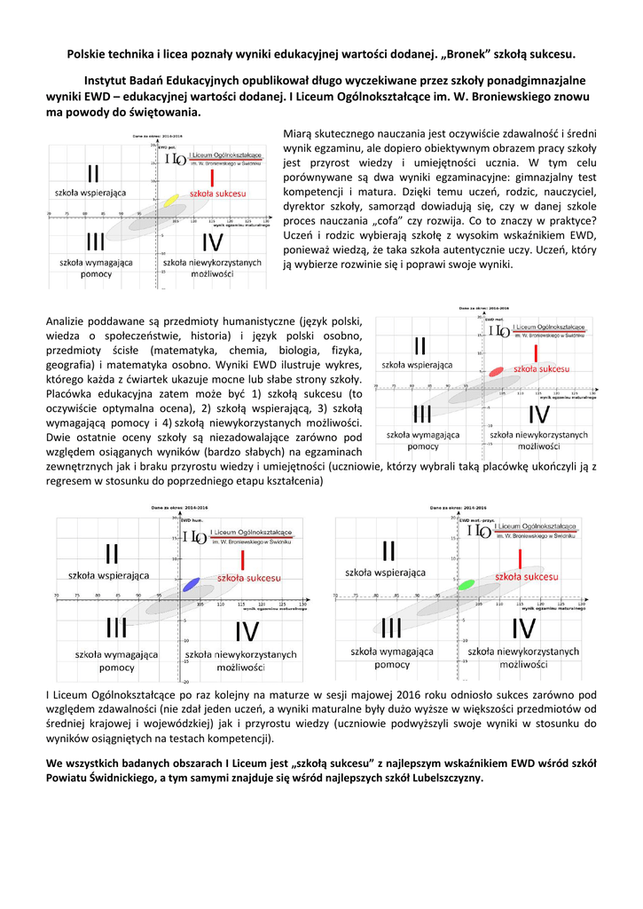 Polskie technika i licea poznały wyniki edukacyjnej wartości dodanej. „Bronek” szkołą sukcesu. Instytut Badań Edukacyjnych opublikował długo wyczekiwane przez szkoły ponadgimnazjalne wyniki EWD – edukacyjnej wartości dodanej. I Liceum Ogólnokształcące im. W. Broniewskiego znowu ma powody do świętowania. Miarą skutecznego nauczania jest oczywiście zdawalność i średni wynik egzaminu, ale dopiero obiektywnym obrazem pracy szkoły jest przyrost wiedzy i umiejętności ucznia. W tym celu porównywane są dwa wyniki egzaminacyjne: gimnazjalny test kompetencji i matura. Dzięki temu uczeń, rodzic, nauczyciel, dyrektor szkoły, samorząd dowiadują się, czy w danej szkole proces nauczania „cofa” czy rozwija. Co to znaczy w praktyce? Uczeń i rodzic wybierają szkołę z wysokim wskaźnikiem EWD, ponieważ wiedzą, że taka szkoła autentycznie uczy. Uczeń, który ją wybierze rozwinie się i poprawi swoje wyniki. Analizie poddawane są przedmioty humanistyczne (język polski, wiedza o społeczeństwie, historia) i język polski osobno, przedmioty ścisłe (matematyka, chemia, biologia, fizyka, geografia) i matematyka osobno. Wyniki EWD ilustruje wykres, którego każda z ćwiartek ukazuje mocne lub słabe strony szkoły. Placówka edukacyjna zatem może być 1) szkołą sukcesu (to oczywiście optymalna ocena), 2) szkołą wspierającą, 3) szkołą wymagającą pomocy i 4) szkołą niewykorzystanych możliwości. Dwie ostatnie oceny szkoły są niezadowalające zarówno pod względem osiąganych wyników (bardzo słabych) na egzaminach zewnętrznych jak i braku przyrostu wiedzy i umiejętności (uczniowie, którzy wybrali taką placówkę ukończyli ją z regresem w stosunku do poprzedniego etapu kształcenia) I Liceum Ogólnokształcące po raz kolejny na maturze w sesji majowej 2016 roku odniosło sukces zarówno pod względem zdawalności (nie zdał jeden uczeń, a wyniki maturalne były dużo wyższe w większości przedmiotów od średniej krajowej i wojewódzkiej) jak i przyrostu wiedzy (uczniowie podwyższyli swoje wyniki w stosunku do wyników osiągniętych na testach kompetencji). We wszystkich badanych obszarach I Liceum jest „szkołą sukcesu” z najlepszym wskaźnikiem EWD wśród szkół Powiatu Świdnickiego, a tym samymi znajduje się wśród najlepszych szkół Lubelszczyzny.