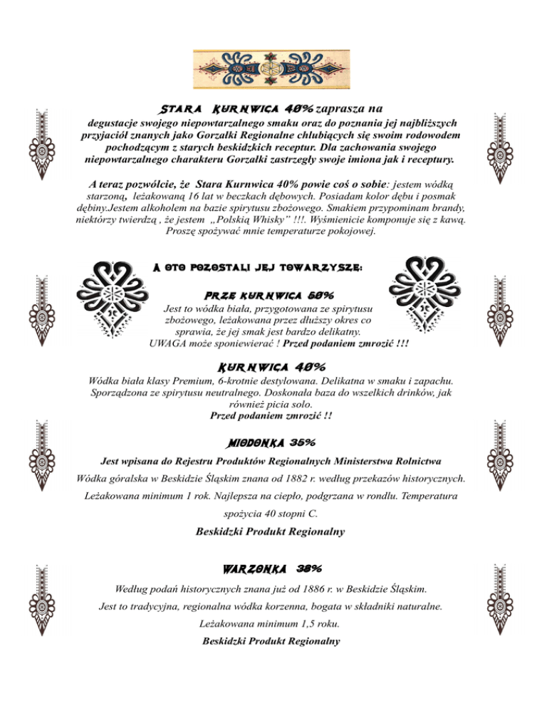 Stara Kurnwica 40% zaprasza na degustacje swojego niepowtarzalnego smaku oraz do poznania jej najbliższych przyjaciół znanych jako Gorzałki Regionalne chlubiących się swoim rodowodem pochodzącym z starych beskidzkich receptur. Dla zachowania swojego niepowtarzalnego charakteru Gorzałki zastrzegły swoje imiona jak i receptury. A teraz pozwólcie, że Stara Kurnwica 40% powie coś o sobie: jestem wódką starzoną, leżakowaną 16 lat w beczkach dębowych. Posiadam kolor dębu i posmak dębiny.Jestem alkoholem na bazie spirytusu zbożowego. Smakiem przypominam brandy, niektórzy twierdzą , że jestem „Polskią Whisky” !!!. Wyśmienicie komponuje się z kawą. Proszę spożywać mnie temperaturze pokojowej. A oto pozostali jej towarzysze: Prze kurnwica 50% Jest to wódka biała, przygotowana ze spirytusu zbożowego, leżakowana przez dłuższy okres co sprawia, że jej smak jest bardzo delikatny. UWAGA może sponiewierać ! Przed podaniem zmrozić !!! Kurnwica 40% Wódka biała klasy Premium, 6-krotnie destylowana. Delikatna w smaku i zapachu. Sporządzona ze spirytusu neutralnego. Doskonała baza do wszelkich drinków, jak również picia solo. Przed podaniem zmrozić !! MIODONKA 35% Jest wpisana do Rejestru Produktów Regionalnych Ministerstwa Rolnictwa Wódka góralska w Beskidzie Śląskim znana od 1882 r. według przekazów historycznych. Leżakowana minimum 1 rok. Najlepsza na ciepło, podgrzana w rondlu. Temperatura spożycia 40 stopni C. Beskidzki Produkt Regionalny WARZONKA 38% Według podań historycznych znana już od 1886 r. w Beskidzie Śląskim. Jest to tradycyjna, regionalna wódka korzenna, bogata w składniki naturalne. Leżakowana minimum 1,5 roku. Beskidzki Produkt Regionalny mACIDULA 40% Cytrynówka z nutką miodu Według przepisu Pawła Golca z Milówki.Jest to wódka cytrynowa z nutą miodu. Na Żywiecczyźnie znana już od 1949 r.Macidula to postać z Żywieckich Dziadów, znana też pod nazwą: łatkorka, sznurkorka, sznurkarz. Podaje się ją zmrożoną. Górale dodają Maciduli do herbaty i używają jako lekarstwo na przeziębienie. Beskidzki Produkt Regionalny Aby Państwo i goście hotelowi mieli możliwość poznania całego towarzystwa osobiście zapraszamy na degustacje w Państwa hotelu Koszt degustacji ustalany jest indwywidualnie i zawiera dla osoby: degustacja 10 kieliszków wódki podanej na kilka sposobów ( 9 proponowanych przez nas + 1 wybrany przez klienta) W zależności od budżetu jest możliwa madyfikacja oferty Czas trwania pokazu ok. 1 godzina dojazd do 35 km gratis, powyżej 35 km wg ustaleñ Pokaz prowadzony przez Mistrza sztuki barmańskiej. Cały pokaz przeprowadzony jest w stylizacji góralskiej począwszy od muzyki, stroju barmana i baru góralskiego.Aby jeszcze bardziej urozmaicić wieczór w towarzystwie wódek regionalnych proponujemy zamówienie kapeli góralskiej czy zorganizowanie napadu zbójnickiego, który na pewno zaskoczy Państwa gości. Proponowany przez nas sposób spędzenia wieczoru w towarzystwie Wódek Regionalnych jest prawdziwa nowością pozwalającą odkryć starą góralska kulturę. Wszystkie oferowane przez nas alkohole można również zakupić po pokazie zapewniamy rabat agencyjny – 20% Zaprasza Was całe towarzystwo Gorzałek Regionalnych!!! kontakt: 791 929 262 www.wodkiregionalne.pl