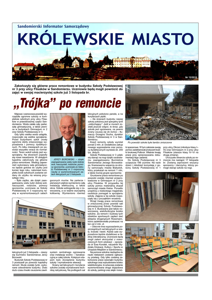 Sandomierski Informator Samorządowy KRÓLEWSKIE MIASTO Nr 12/2010 Zakoñczy³y siê g³ówne prace remontowe w budynku Szko³y Podstawowej nr 3 przy ulicy Flisaków w Sandomierzu. Uczniowie bêd¹ mogli powróciæ do zajêæ w swojej macierzystej szkole ju¿ 3 listopada br. „Trójka” po remoncie Majowa i czerwcowa powódŸ wyrz¹dzi³a ogromne szkody w kompleksie szkolnym przy ulicy Flisaków w prawobrze¿nej czêœci Sandomierza. Woda zala³a ca³y parter, salê gimnastyczn¹, a tak¿e piwnice w budynkach Gimnazjum nr 2 oraz Szko³y Podstawowej nr 3. Gdy tylko wielka woda ust¹pi³a, rozpoczê³o siê wielkie sprz¹tanie. Przed budynkami szkó³ uros³y ogromne sterty zniszczonego wyposa¿enia i pomocy dydaktycznych. Po kilku miesi¹cach po powodzi wszystko wraca do normalnoœci. Teren wokó³ szko³y jest wysprz¹tany. Na skwerach pojawi³y siê nowe nasadzenia. W ubieg³ym tygodniu zakoñczy³y siê g³ówne prace remontowe. Wed³ug zapewnieñ wykonawcy sala gimnastyczna bêdzie gotowa do u¿ytku pod koniec tego roku, natomiast kompleks boisk szkolnych zostanie oddany do u¿ytku na wiosnê przysz³ego roku. – By³o ciê¿ko, ale dziêki zaanga¿owaniu wielu ludzi dobrej woli, nauczycieli, rodziców, pomocy sponsorów, uczniowie ze Szko³y Podstawowej nr 3 rozpoczn¹ naukê w wyremontowanych salach goconych murów. Na parterze i pierwszym piêtrze wymieniono ca³¹ instalacjê elektryczn¹, a tak¿e okna. Szko³a wzbogaci³a siê o nowoczesn¹, a co wa¿ne oszczêdn¹ kot³owniê. Wymieniono równie¿ lekcyjnych ju¿ 3 listopada – cieszy siê burmistrz Sandomierza Jerzy Borowski. Budynek Szko³y Podstawowej nr 3 przeszed³ po powodzi kapitalny remont. Skute zosta³y tynki, wykonane odwodnienie budynku. Doœæ du¿o czasu trwa³o osuszenie zawil- system centralnego ogrzewania oraz instalacjê wodno – kanalizacyjn¹ w ca³ej szkole. Kolejnym etapem by³o docieplenie budynku szko³y i wymalowanie elewacji. Œciany sal lekcyjnych i korytarze szkolne zosta³y wymalowane technik¹ natryskow¹. Na pod³ogach sal JERZY BOROWSKI: – dziêki zaanga¿owaniu wielu ludzi dobrej woli, nauczycieli, rodziców, pomocy sponsorów, uczniowie ze Szko³y Podstawowej nr 3 rozpoczn¹ naukê w wyremontowanych salach lekcyjnych ju¿ 3 listopada lekcyjnych po³o¿ono panele, a na korytarzach p³ytki. – Na œcianach budynku naszej szko³y po³o¿ony jest specjalny tynk „oddychaj¹cy”. Jeœli w murach zosta³a jeszcze wilgoæ, to teraz, gdy szko³a jest ogrzewana, na pewno œciany osusz¹ siê do koñca – t³umaczy Grzegorz Socha, dyrektor Szko³y Podstawowej nr 3 w Sandomierzu. Koszt remontu szko³y wyniós³ ponad 2 mln. z³. Dodatkowo zakup nowego wyposa¿enia oraz pomocy dydaktycznych wyniesie ok. 200 tys. z³otych. Szkole Podstawowej nr 3 uda³o siê stan¹æ na nogi dziêki osobistemu zaanga¿owaniu Burmistrza Sandomierza Jerzego Borowskiego, finansowemu wsparciu ze strony samorz¹du miasta Bia³ystok, który przekaza³ na remont 1 mln, a tak¿e licznej grupie sponsorów. Gruntowne prace remontowe po powodzi zosta³y równie¿ przeprowadzone w Gimnazjum nr 2 przy ulicy Flisaków. W przypadku tej szko³y pomoc materialn¹ okaza³ samorz¹d miasta Kielce. Ponadto urzêdnicy z kieleckiego magistratu osobiœcie pomagali w sprz¹taniu szko³y. Zajêcia w tej szkole rozpoczê³y siê z pocz¹tkiem wrzeœnia. Wci¹¿ trwaj¹ prace remontowe w zniszczonej przez powódŸ sali gimnastycznej Szko³y Podstawowej nr 3. Budowane jest tak¿e nowoczesne, wielofunkcyjne boisko szkolne. Za remont i budowê tych obiektów sportowych zap³aci sieæ sklepów drogeryjnych Rossmann, która zadeklarowa³a przekazaæ na ten cel 2 mln. z³. – Obecnie trwa wyposa¿anie poszczególnych sal lekcyjnych w szafy, krzes³a i ³awki. Ka¿da sala wyposa¿ona bêdzie dodatkowo w tablicê interaktywn¹. Uczniowie bêd¹ mogli zatem skorzystaæ z nowoczesnych form edukacji – opowiada dr Ewa Kondek, naczelnik Wydzia³u Edukacji, Kultury i Sportu w Urzêdzie Miejskim w Sandomierzu. Na pomoce szkolne niezbêdne do nauki niebawem zostanie og³oszony przetarg. Gdy tylko zostan¹ zakoñczone prace wewn¹trz budynku szkolnego oraz wybudowane boisko wielofunkcyjne, to wówczas zostanie wyremontowana droga dojazdowa do szko³y, parkingi oraz alejki i œcie¿- Po powodzi szko³a by³a bardzo zniszczona ki spacerowe. W tym zakresie swoj¹ pomoc zadeklarowa³ producent kostki brukowej Polbruk. W³aœnie trwaj¹ prace przy opracowywaniu dokumentacji tego zadania. Do Szko³y Podstawowej nr 3 uczêszcza 198 uczniów. Na razie dzieci i m³odzie¿ korzystaj¹ z goœciny Szko³y Podstawowej nr 1 przy ulicy Okrzei (m³odsze klasy I– III) oraz Gimnazjum nr 2 przy ulicy Flisaków (starsze klasy IV–VI na drug¹ zmianê). Uroczyste otwarcie szko³y po remoncie ma nast¹piæ 17 listopada br. Zostan¹ zaproszeni wszyscy sponsorzy i darczyñcy, którzy pomogli stan¹æ szkole na nogi. Królewskie Miasto II Festiwal £agodnoœci 2010 „Bezalkoholowa uczta z piosenk¹” Nagrody dla nauczycieli Wolna Grupa Bukowina, Kapela ze Wsi Warszawa, Bogus³aw Nowicki i Jacek Kleyff – to gwiazdy tegorocznej edycji Festiwalu £agodnoœci, który odby³ siê w dniach 14–17 pa¿dziernika w Sandomierzu. Kolejny ju¿ raz mi³oœnicy muzyki mieli okazjê rozkoszowaœ siê piosenk¹ autorsk¹ i poezj¹ œpiewan¹. Dodatkow¹ atrakcj¹, a zarazem nowoœci¹ Festiwalu, by³ spektakl pt. „Hanka, Rita, Coco”. Festiwal otworzy³ wystêp Bogus³awa Nowickiego, autora kultowych ballad z krêgu piosenki autorskiej i literackiej, który wprowadzi³ s³uchaczy w nastrój b³ogoœci i liryzmu. W Klubie Lapidarium mia³ tak¿e miejsce drugi recital, znanego polskiego barda – Jacka Kleyffa, wspó³twórcy s³ynnego „Salonu Niezaleœnych’’ oraz „Orkiestry na zdrowie”, znanego z takich piosenek jak „Telewizja” , „Huœtawki” oraz „Nie mêcz mnie”. Muzyka Kleyffa i Nowickiego wspaniale wkomponowa³a siê w myœl przewodni¹ festiwalu. Na kameraln