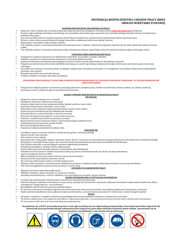INSTRUKCJA BEZPIECZEŃSTWA I HIGIENY PRACY (BHP) OBSŁUGI WIERTARKI STOŁOWEJ WARUNKI DOPUSZCZENIA PRACOWNIKA DO PRACY Ukończone 18 lat ( młodociany w ramach praktycznej nauki zawodu może obsługiwać wiertarkę stołową tylko pod nadzorem instruktora), Przejście odpowiedniego instruktażu zawodowego oraz instruktażu stanowiskowego, zapoznanie się z instrukcją obsługi wiertarki stołowej, przeszkolenie w dziedzinie bhp i ppoż., Stan zdrowia odpowiedni do wykonywanej pracy potwierdzony świadectwem wydanym przez uprawnionego lekarza medycyny pracy, Ubrany w odzież roboczą przewidzianą dla danego stanowiska w zakładowej tabeli norm odzieży roboczej, Wyposażony w niezbędne środki ochrony osobistej Przy obsłudze maszyn z ruchomymi elementami nie można pracować w odzieży z luźnymi (zwisającymi) częściami jak np. luźno zakończone rękawy, krawaty, szaliki, Przy obsłudze maszyn z ruchomymi elementami należy zabezpieczyć (związać, spiąć) długie włosy lub zastosować nakrycie głowy okrywające włosy, CZYNNOŚCI PRZED ROZPOCZĘCIEM PRACY Przygotować urządzenia pomocnicze do składowania materiałów, przyrządów, narzędzi i odpadów, Dokładnie zapoznać się z dokumentacją wykonawczą i instrukcją obsługi wiertarki, Zaplanować kolejność wykonywania poszczególnych czynności, dobrać wiertło odpowiednie do obrabianego materiału, Przygotować materiał do przetworzenia (obróbki) ustawiając go w sposób zapewniający maksymalne bezpieczeństwo przy zachowaniu granic stanowiska roboczego, Sprawdzić stan techniczny wiertarki (osłony na układzie napędowym) i oświetlenia stanowiska, a w szczególności stan instalacji elektrycznej (wyłączników), sprawdzić stan uchwytu, Wizualnie sprawdzić stan wiertarki stołowej, Próbnie uruchomić wiertarkę i sprawdzić jej działanie, PRACOWNIK URUCHAMIAJĄCY WIERTARKĘ POWINIEN PRZED DOKONANIEM TEJ CZYNNOŚCI SPRAWDZIĆ DOKŁADNIE, CZY JEJ URUCHOMIENIE NIE GROZI WYPADKIEM Przygotować niezbędne pomoce warsztatowe, przyrządy pomiarowe, narzędzia pracy, zmiotki oraz konieczne ochrony osobiste, np. okulary, maski itp., Zauważone usterki i uchybienia zgłosić natychmiast przełożonemu, ZASADY I SPOSOBY BEZPIECZNEGO WYKONYWANIA PRACY NIE WOLNO: Zdejmować osłony i zabezpieczeń z wiertarki Obsługiwać wiertarkę w rękawicach ochronnych Hamować ręką wrzeciono przy wyłączeniu silnika, dotykać wiertła w czasie ruchu Smarować i konserwować wiertarkę w czasie ruchu Zdmuchiwać wióry ustami lub sprężonym powietrzem, usuwać wióry rękami Używać do pracy niewłaściwych lub uszkodzonych narzędzi Pozostawić klucz w uchwycie lub klin w otworze wrzeciona Mocować lub zdejmować przedmiot w czasie ruchu wrzeciona Pracować z niewłaściwym lub źle naostrzonym wiertłem Ręczne przemieszczać i przewozić ciężary o masie przekraczającej ustalone normy Podtrzymywać przy mocowaniu wiertło od dołu Mocować nieodpowiednich wierteł Pozostawiać żadnych przedmiotów na płycie stołu NAKAZUJE SIĘ: Prawidłowo ułożyć i mocować wiertło (w sposób pewny zgodny z instrukcją obsługi) Opierać wiertło o dno uchwytu Sukcesywnie usuwać odpady pasy pędne, liny i taśmy pędne napinać, naprawiać, łączyć, skracać i smarować po unieruchomieniu maszyny (jeżeli jest to dozwolone przez instrukcje obsługi) Utrzymywać w porządku miejsce pracy, nie rozrzucać narzędzi i przedmiotów przeznaczonych do obróbki lub obrobionych, Przy obróbce materiału o znacznej długości stosować odpowiednie podstawki Utrzymywać posadzkę w czystości (suchą, odtłuszczoną), Używać tylko sprawnych narzędzi i pomocy warsztatowych, nieuszkodzonych, Przedmiot mocować mocno w imadle maszynowym (lub przy pomocy śrub dociskowych), ale tak aby nie uległ uszkodzeniu, używać wymagane ochrony osobiste Małe przedmioty trzymać przy pomocy kleszczy lub ręcznych uchwytów Dosuwać wiertło do przedmiotu ostrożnie i powoli Nie wywierać nadmiernego nacisku na wiertło podczas pracy Wyłączać silnik wiertarki w razie konieczności oddalenia się, przerwy w dopływie prądu, wykonywania pomiarów, mocowania przedmiotu Przy wierceniu głębokich otworów przerywać posuw i usuwać wióry CZYNNOŚCI PO ZAKOŃCZENIU PRACY Wyłączyć wiertarkę wyłącznikiem (głównym) Odkładać obrabiane i gotowe elementy na wyznaczone miejsca Uprzątnąć stanowisko pracy z wiórów, chłodziwa, oraz uporządkować narzędzia i sprzęt ochronny ZASADY POSTĘPOWANIA W SYTUACJACH AWARYJNYCH O wadach lub uszkodzeniach wiertarki należy niezwłocznie zawiadomić przełożonego, Wiertarki, których uszkodzenie stwierdzono w czasie pracy, powinny być niezwłocznie zatrzymane, odłączone od zasilania i odpowiednio oznakowane tablicą ostrzegawczą "Uwaga naprawa - nie uruchamiać", Bezwzględnie udzielić pierwszej pomocy poszkodowanym, W razie awarii maszyny stwarzającej zagrożenie dla otoczenia należy zastosować zrozumiałą i dostrzegalną sygnalizację ostrzegawczą i alarmową, Każdy zaistniały wypadek przy pracy zgłaszać swojemu przełożonemu, a stanowisko pracy pozostawić w takim stanie, w jakim nastąpił wypadek, UWAGI Narzędzia i urządzenia o napędzie mechanicznym podlegają okresowym przeglądom i badaniom na skuteczność zerowania, Na terenie zakładu pracy się znajdować prawidłowo wyposażona apteczka, a wyznaczeni pracownicy powinni umieć udzielać pierwszej pomocy W razie pożaru ściśle stosować się do instrukcji przeciwpożarowej Na podstawie art. 210 K.P. pracownik ma prawo w razie, gdy warunki pracy nie odpowiadają przepisom bhp i stwarzają bezpośrednie zagrożenie dla zdrowia lub życia pracownika lub gdy wykonywana przez niego praca grozi takim niebezpieczeństwem innym osobom - powstrzymać się od wykonywanej pracy, zawiadamiając o tym niezwłocznie przełożonego.