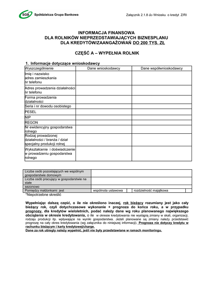 Załącznik 2.1.8 do Wniosku o kredyt Z/RI INFORMACJA FINANSOWA DLA ROLNIKÓW NIEPRZEDSTAWIAJĄCYCH BIZNESPLANU DLA KREDYTÓW/ZAANGAŻOWAŃ DO 200 TYS. ZŁ CZĘŚĆ A – WYPEŁNIA ROLNIK 1. Informacje dotyczące wnioskodawcy Wyszczególnienie Dane wnioskodawcy Dane współwnioskodawcy Imię i nazwisko adres zamieszkania nr telefonu Adres prowadzenia działalności nr telefonu Forma prowadzenia działalności Seria i nr dowodu osobistego PESEL NIP REGON Nr ewidencyjny gospodarstwa rolnego Rodzaj prowadzonej działalności / branża / dział specjalny produkcji rolnej Wykształcenie i doświadczenie w prowadzeniu gospodarstwa rolnego Liczba osób pozostających we wspólnym gospodarstwie domowym Liczba osób pracujący w gospodarstwie na stałe sezonowo Pomiędzy małżonkami jest wspólnota ustawowa rozdzielność majątkowa *Niepotrzebne skreślić Wypełniając dalszą część, o ile nie określono inaczej, rok bieżący rozumiany jest jako cały bieżący rok, czyli dotychczasowe wykonanie + prognoza do końca roku, a w przypadku prognozy, dla kredytów wieloletnich, podać należy dane wg roku planowanego największego obciążenia w okresie kredytowania, o ile w okresie kredytowania nie wystąpią zmiany w skali, organizacji, rodzaju produkcji itp. wpływające na wyniki gospodarstwa. Jeżeli planowane są zmiany należy przedstawić prognozę na cały okres kredytowania (wg załącznika do niniejszej informacji). Prognoza nie dotyczy kredytu w rachunku bieżącym i karty kredytowej/charge. Dane za rok ubiegły należy wypełnić, jeśli nie były przedstawiane w ramach monitoringu. Załącznik 2.1.8 do Wniosku o kredyt Z/RI 2. Majątek gospodarstwa rolnego stan na dzień ……………….. 1) Grunty Wyszczególnienie Powierzchnia [ha] Wartość wg rolnika [zł] Wartość wg banku [zł] (wg śr. cen GUS) 1. Grunty własne 2. Grunty dzierżawione/ użyczone Ogółem: X X w tym użytki rolne X X W tym: grunty orne Łąki i pastwiska sady inne 2) budynki (podać rodzaj , rok budowy i wartość). Lp. 1. 2. 3. 4. 5. 6. 7. 8. Rodzaj zabudowania Rok budowy Szacunkowa wartość w zł X RAZEM 3) Maszyny, ciągniki, samochody. L. p. Ciągnik/ maszyna / samochód Typ Nr.rejestracyjny Rok Wartość / fabryczny produkcji szacunkowa zł 1. 2. 3. 4. 5. 6. 7. 8. 9. 10. 11. 12. 13. RAZEM X X X w Załącznik 2.1.8 do Wniosku o kredyt Z/RI 4) inwentarz żywy Wyszczególnienie ( wymienić zwierzęta wg rodzajów) Rok bieżący Ilość (w szt.) Prognoza na okres kredytowania Wartość w zł Ilość (w szt.) Wartość w zł Stado podstawowe: ………………………………….. ………………………………….. ………………………………….. Stado obrotowe: …………………………………. …………………………………. …………………………………. ............................................... ................................................ Razem X 5) pozostały majątek ( wymienić rodzaj i wartość) Wyszczególnienie Należności z tytułu dopłat bezpośrednich Zapasy* :…………………………………………..... ………………………………………………………… …………………………………………………………. ............................................................................... ............................................................................... ............................................................................... ............................................................................... Produkcja roślinna w toku Gotówka Lokaty Inne ( w tym majątek niezwiązany z gospodarstwem rolnym) Wartość w zł +ewentualny komentarz *wyszczególnić czego dotyczą 6) informacja o zobowiązaniach Zadłużenie z tytułu zaciągniętych kredytów, pożyczek, przyznanych limitów, kart kredytowych, udzielonych poręczeń w innych bankach nie posiadam/y zobowiązań w innych bankach nazwa instytucji finansującej rodzaj zobowiązania Posiadam/y zobowiązania w kwocie ogółem: Udzieliliśmy poręczeń kwocie ogółem: ZOBOWIĄZANIA WŁASNE kwota i waluta wg umowy aktualna kwota pozostająca do spłaty okres kredytowania od…do ………………………..zł ………………………..zł miesięczna rata rodzaj zabezpieczenia Załącznik 2.1.8 do Wniosku o kredyt Z/RI UDZIELONE PORĘCZENIA 3. Planowane przedsięwzięcie inwestycyjne Dla kredytów unijnych Elementy inwestycji RAZEM Udział % Koszt całkowity inwestycji brutto/netto1 Środki własne Kredyt/Kredyt Koszty unijny kwalifikowane Dotacja Termin realizacji 100% Zaawansowanie na dzień …………………. …………………………..zł…………………% 4. Prowadzona produkcja 1) produkcja roślinna i zwierzęca Dane za rok bieżący Dane za ostatni zakończony rok Rodzaj produkcji roślinnej i zwierzęcej np. pszenica, ziemniaki, tuczniki, prosięta, krowy 1 Obszar uprawy (ha)/ilość sprzedanych szt. zwierząt/ posiadanych krów mlecznych Obszar uprawy (ha)/ilość sprzedanych szt. zwierząt/posiadanych krów mlecznych Ilość sprzedanyc h ton/litrów /kg żywca Średnia cena zł/t, l, kg Przychód zł/tys. zl2 np. pszenica 10 ha 40 t 800 zł/t 32000 zł 8 ha np. krowy 10 szt. 7500 l 1,40 zł/l 10500 zł 12 szt. Niepotrzebne skreślić, wartość netto dla płatników podatku VAT, wartość brutto dla pozostałych podmiotów. Załącznik 2.1.8 do Wniosku o kredyt Z/RI 2) przychody i koszty Wyszczególnienie Rok ubiegły zł/tys. zł2 Rok bieżący zł/tys. zł2 Prognoza na okres kredytowania zł/tys. zł23 A. Przychody ogółem 1. Przychody z tytułu produkcji roślinnej 2. Przychody z tytułu produkcji zwierzęcej 3. Przychody z tytułu dopłat bezpośrednich i innych dopłat 4. Pozostałe przychody z tytułu………………………………… B. Koszty uzyskania przychodu 1) zakup pasz 2) zakup zwierząt 3) opieka weterynaryjna 4) zakup materiału siewnego 5) zakup nawozu 6) zakup środków 