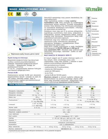 WAGI ANALITYCZNE AS.R Wyjmowane szyby: boczne, górna i tylna! Szybki dostęp do informacji Bezpośredni dostęp do funkcji i baz danych jest możliwy z poziomu przycisków klawiatury. Database - bezpośredni dostęp do baz danych Function - bezpośredni dostęp do podstawowych funkcji F1 do F4 - programowalne klawisze funkcyjne oraz klawisze nawigacyjne menu. Pamięć ALIBI Zastosowana pamięć ALIBI jest obszarem bezpieczeństwa danych i pozwala na zapis do 100 tysięcy rekordów ważeń. Daje to bezpieczeństwo ciągłości gromadzenia danych w długim okresie czasu. Seria AS.R reprezentuje nowy poziom standardowy dla wag analitycznych. Wagi wyposażone zostały w nowy czytelny wyświetlacz LCD, który pozwala na czytelniejszą prezentację wyniku ważenia. Ponadto wyświetlacz posiada nową tekstową linię informacyjną pozwalającą na wyświetlanie dodatkowych komunikatów i informacji, np. nazwa towaru czy wartość tary. Dodatkowo nowe wagi serii R za pomocą piktogramów sygnalizują uruchomiony mod pracy, połączenie z komputerem, poziom naładowania baterii, funkcje wagowe oraz serwisowe. Rozszerzono także ilość wyświetlanych jednostek wagowych. Dokładność wagi oraz rzetelność pomiarów jest zapewniona przez automatyczną adiustancję wewnętrzną, działającą z uwzględnieniem zmian temperatury oraz upływu czasu. Wagi AS.R zostały wyposażone w wiele interfejsów komunikacyjnych: 2 x RS 232, USB typu A, USB typu B oraz opcjonalnie WiFi. Obudowa wagi wykonana jest ztworzywa sztucznego, natomiast szalka ze stali nierdzewnej. BAZY DANYCH W WAGACH SERII R Ważenie Liczenie sztuk Doważanie Odchyłki procentowe Dozowanie Sumowanie ważeń Statystyki Wyznaczanie gęstości Ważenie zwierząt Zatrzask max wskazania W nowych wagach serii R system informacji oparto o 5 baz danych, które umożliwiają pracę wielu użytkowników z bazą wielu towarów, a zbierane w bazie ważenia można poddawać dalszej analizie. Dane gromadzone są w 5 bazach: - użytkowników (do 10 użytkowników), - towarów (do 1000 towarów), - ważeń (do 1000 ważeń), - tar (do 10 tar), - pamięć ALIBI (do 100 000 ważeń). Wymiana danych w ramach systemu odbywa się dwukierunkowo za pomocą szybkiego złącza USB. Nowe wagi pozwalają importować i eksportować bazy danych wykorzystując zewnętrzne nośniki Pendrive. Dane techniczne: AS 60/220.R2 Obciążenie maksymalne Obciążenie minimalne Dokładność odczytu Zakres tary Powtarzalność * Liniowość Wymiar szalki AS 110.R2 AS 310.R2 110 g 160 g 220 g 310 g 1 mg 10 mg 10 mg 10 mg 10 mg 0,01 mg / 0,1 mg 0,1 mg 0,1 mg 0,1 mg 0,1 mg -220 g -110 g -160 g -220 g 0,03 mg (60g) 0,1 mg (60g÷220g) ± 0,07 mg (60g) ± 0,2 (60g÷220g) Ø 70 mm -310 g 0,1 mg (dla 220 g) 0,1 mg 0,1 mg 0,1 mg ± 0,2 mg ± 0,2 mg ± 0,2 mg ± 0,2 mg Ø 85 mm Ø 85 mm Ø 85 mm Ø 85 mm 0,2 mg (dla 220g ÷ 310g) +10° ÷ +40°C Wilgotność względna powietrza ** 40% ÷ 80% 6 s / 3,5 s Dryft czułości 3,5 s 1 ppm/°C w temperaturze +10° ÷ +40°C Interfejs 2 × RS 232, USB typ A, USB typ B, WiFi - opcja Zasilanie *** 12 ÷ 16 V DC / 2,1 A Adiustancja wewnętrzna (automatyczna) Wyświetlacz Masa netto/brutto AS 220.R2 60 g / 220 g Temperatura pracy Czas stabilizacji AS 160.R2 LCD (z podświetleniem) 5,6 / 8,3 kg 5,6 kg / 8,3 kg 5,6 kg / 8,3 kg Wymiary opakowania 495×385×515 mm * Powtarzalność jest wyrażona jako odchylenie standardowe z 10-ciu postawień obciążenia ** Warunki niekondensujące *** 250 mA dla wag bez modułu WiFi, 350 mA dla wag z zainstalowanym modułem WiFi 5,6 kg / 8,3 kg 5,6 kg / 8,3 kg Wymiary: 160 ~345 168 ~355 227 206 333 Wyposażenie dodatkowe: Stół antywibracyjny granitowy SAL/STONE Zestaw do wyznaczania gęstości ciał stałych i cieczy Stelaż do ważenia ładunków pod wagą Wyświetlacz LCD „WD-6" Profesjonalny stół wagowy Zasilacz ZR-02 Drukarka termiczna Kafka Klawiatura USB Drukarka igłowa Epson Zewnętrzna pamięć USB (format plików FAT) Drukarka etykiet „Citizen” Wzorzec masy Drukarka USB PCL Odważnik adiustacyjny Uchwyty do naczyń szklanych Przewód USB A - USB B (waga - komputer, waga - drukarka PCL) Program komputerowy "PW-WIN" Przewód RS 232 (waga - drukarka Kafka) "P0136" Program komputerowy "RAD-KEY" Przewód RS 232 (waga - komputer) "P0108" Jonizator antystatyczny DJ-02 Przewód RS 232 (waga - drukarka Epson, Citizen) "P0151" Czytnik kodów kreskowych RS 232 Przycisk nożny dla funkcji „TARA, PRINT” Czytnik kodów kreskowych USB HID MULTISERW-Morek Jan Morek 34-114 Brzeznica Marcyporeba 36 tel. +48 33 8792821· fax. +48 33 338792172· www.multiserw-morek.pl· e-mail: [email protected]