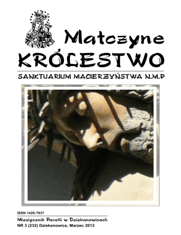 ISSN 1426-7837 NR 3 (232) Dziekanowice, Marzec 2013 Matczyne Królestwo, Marzec 2013 Przez cały okres jesienno-zimowy wszelkie nabożeństwa wieczorne w dni powszednie będziemy odprawiać o godz. 17.00. Środą Popielcową rozpoczęliśmy Wielki Post. To dla nas, chrześcijan, czas pokuty, w którym pragniemy praktykować czyny służące nawróceniu naszych serc. Wielki Post, który jest czasem przygotowania na owocne przeżywanie największej tajemnicy naszej wiary Zmartwychwstania Pańskiego, sprzyja także naszej mobilizacji, aby jeszcze więcej w naszym życiu było uczynków pobożności i miłości, również poprzez dawanie jałmużny ludziom potrzebującym. Wszystko to zaś pragniemy czynić nie z przymusu, czy tylko dla spełnienia przykazania kościelnego, lecz z miłości dla naszego Pana i Zbawcy. On tyle wycierpiał i umarł na krzyżu za nas grzeszników, a po trzech dniach zmartwychwstał dla naszego zbawienia. Jest jednak jeszcze jedna forma pokuty, którą Kościół szczególnie sobie ceni - modlitwa. Wśród wielu modlitw, które znamy i praktykujemy są i te tak charakterystyczne dla okresu Wielkiego Postu: Droga Krzyżowa i Gorzkie Żale. Myślę, że w tym czasie także częściej będziemy odmawiać Koronkę do Miłosierdzia Bożego. Warto zatem pamiętać, że Kościół z tymi nabożeństwami złączył możliwość zyskiwania odpustu zupełnego. Miesiąc marzec to również czas, w którym przeżyjemy rekolekcje wielkopostne oraz najważniejsze uroczystości Triduum Paschalnego! Już dzisiaj się módlmy o dobre przeżycie tego czasu! Serdecznie zachęcamy do udziału w tym pięknym nabożeństwie, jak i w Drodze Krzyżowej. Niech nikogo nie zabraknie na tych nabożeństwach!!! PIERWSZY PIĄTEK MIESIĄCA 1 III 2013 r. przypada pierwszy piątek miesiąca, kiedy to modląc się do Serca Jezusowego, przepraszamy Go za zniewagi, jakich doznało Jego Miłosierne Serce od nas i innych, jeszcze słabszych od nas ludzi. Nabożeństwo do Bożego Serca będzie po Mszach św. o godz. 7.00 i o godz. 17.00, a od godz. 16.00 będziemy spowiadać. Bardzo prosimy, aby dzieci i młodzież skorzystała ze spowiedzi również w czwartek 28 II 2013 r. od godz. 16.00 wtedy też będzie Adoracja oraz Msza Św. wieczorna za naszych bliskich zmarłych wypominanych w wypominkach rocznych!!! Tak jak w I czwartek!!! PIERWSZA SOBOTA MIESIĄCA W sobotę, 2 III, przypada pierwsza sobota miesiąca; pamiętajmy o uczczeniu Matki Najświętszej. Msze Św. z nabożeństwem wynagradzającym do Niepokalanego Serca NMP odprawimy po Mszach św. o godz. 7.00 i o godz. 17.00. W tym dniu odwiedzimy chorych z posługą duszpasterską od godz. 10.00. PIERWSZY CZWARTEK MIESIĄCA 7 III 2013 r. o godz. 20.00 Mszą św. rozpoczniemy Wieczór Bł. Jana Pawła II. Będzie to bardzo dobry czas, na zweryfikowanie pracy nad swoim sumieniem w tym Wielkim Poście. NABOŻEŃSTWA DROGI KRZYŻOWEJ I GORZKICH ŻALI W każdy piątek Wielkiego Postu odprawiamy Drogę Krzyżową o godz. 17.00, po której będzie Msza św. Drogę Krzyżową, podobnie jak w latach poprzednich, odprawiamy obok piątków także w niedziele po sumie. Zaś w niedziele Wielkiego Postu odprawiamy Gorzkie Żale z wystawieniem Pana Jezusa i kazaniem pasyjnym o Męce Chrystusa o godz. 15.00. To uświęcone tradycją nabożeństwo o Męce Zbawiciela, we wszystkich polskich parafiach gromadzi tłumy wiernych. Wielkopostne nabożeństwa pobudzają nas do gorliwości i miłości Boga, pomagają nam przemyśleć i naprawić swoje życie. 11 III 2013 R. WIECZÓR MARYJNY godz. 17.00 Modlitwa Dzieci u stóp Pani Dziekanowskiej (Różaniec, po różańcu Adoracja Najświętszego Sakramentu). godz. 19.40 Koronka do Bożego Miłosierdzia i zakończenie Adoracji. godz. 20.00 Msza Święta z procesją Maryjną. Bardzo prosimy by zabrać świece! W numerze polecamy: Credo - część III Namaszczenie chorych Papież Benedykt XVI Św. Franciszka O opiece hospicyjnej Bóg zawsze słyszy Abp Józef Bilczewski Jak dobrze się spowiadać? Rekolekcje Triduum Sacrum Na pielgrzymim szlaku Wielki Post Ani jednego słowa… Rekolekcje czasem wyznania wiary… KORONKA DO MIŁOSIERDZIA BOŻEGO I POUCZENIE PRZED CHRZTEM ŚWIĘTYM 15 III 2013 r. To trzeci piątek marca, o godz. 17.00 będzie Droga Krzyżowa następnie Msza św. z Koronką do Miłosierdzia Bożego ofiarowaną w intencji wszystkich naszych ofiarodawców; o zdrowie, błogosławieństwo Boże i opiekę Matki Bożej Dziekanowskiej dla nich i ich rodzin, a następnie będzie pouczenie przed Chrztem św. dla rodziców i chrzestnych. Chrzcić dzieci będziemy w Poniedziałek Wielkanocny 1 IV 2013 r. 6 8 9 10 10 11 12 13 14 15 16 18 19 20 REKOLEKCJE WIELKOPOSTNE 17 – 20 2013 r. W Wielkim Poście mamy obowiązek jak najlepiej odprawić rekolekcje. Rekolekcje Parafialne rozpoczniemy w piątą Niedzielę Wielkiego Postu – tj. 5 marca i zakończymy Nieustającą Nowenną do Matki Wydawca: SANKTUARIUM MACIERZYŃSTWA NMP w Dziekanowicach; 32-410 DOBCZYCE ; tel/fax: 12 271-13-14 www.dziekanowice.pl e-mail: [email protected] Konto bankowe Parafii: 30 1020 2892 0000 5402 0118 8648; PKO BP o/Myślenice 2 Matczyne Królestwo, Marzec 2013 Bożej Dziekanowskiej w środę 20 marca. Porządek rekolekcji podajemy na osobnej stronie. Rekolekcje to święty czas obcowania z Bogiem, czas przemyśleń, pojednania i nawrócenia. Postarajmy się maksymalnie wykorzystać te dni na wysłuchanie codziennie nauki rekolekcyjnej i prywatną, osobistą modlitwę w kościele i w domu. Tak mało mamy czasu dla Boga. Nawet w kościele nam się dłuży i śpieszy. W czasie rekolekcji winniśmy więcej czasu spędzić z Bogiem na rozmowie i adoracji oraz więcej troski poświęcić swemu zbawieniu. Czy Ty jeszcze umiesz i chcesz rozmawiać z Bogiem sam na sam? Po każdej nauce rekolekcyjnej winniśmy chwilę pozostać w świątyni, by przemyśleć i przemodlić to co usłyszeliśmy, by zastosować to do siebie. Nie śpieszmy się przynajmniej w c