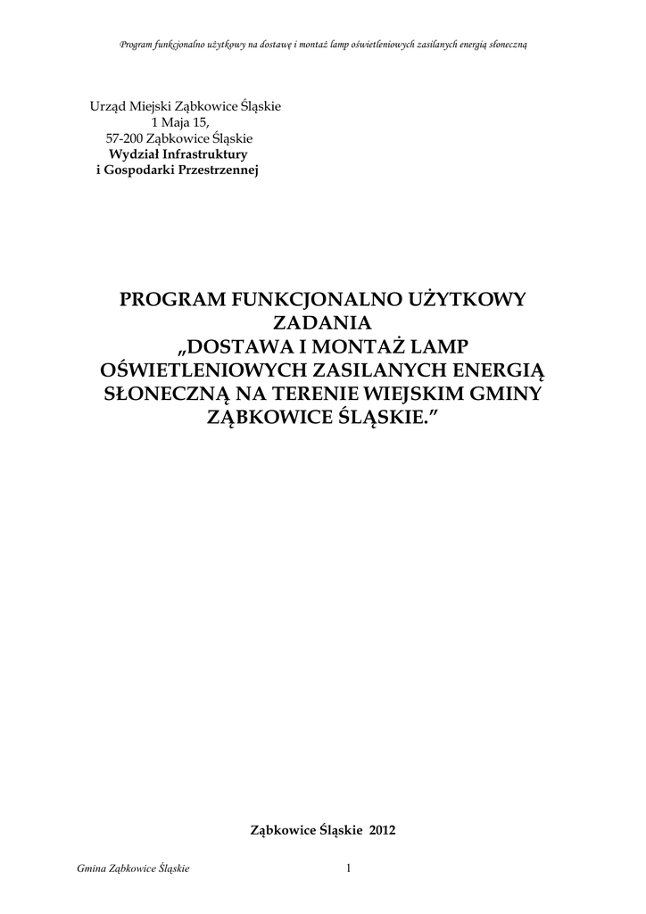Program funkcjonalno uŜytkowy na dostawę i montaŜ lamp oświetleniowych zasilanych energią słoneczną Urząd Miejski Ząbkowice Śląskie 1 Maja 15, 57-200 Ząbkowice Śląskie Wydział Infrastruktury i Gospodarki Przestrzennej PROGRAM FUNKCJONALNO UśYTKOWY ZADANIA „DOSTAWA I MONTAś LAMP OŚWIETLENIOWYCH ZASILANYCH ENERGIĄ SŁONECZNĄ NA TERENIE WIEJSKIM GMINY ZĄBKOWICE ŚLĄSKIE.” Ząbkowice Śląskie 2012 Gmina Ząbkowice Śląskie 1 Program funkcjonalno uŜytkowy na dostawę i montaŜ lamp oświetleniowych zasilanych energią słoneczną Zamawiający Gmina Ząbkowice Śląskie ul. 1 Maja 15 57-200 Ząbkowice Śląskie woj. dolnośląskie NIP 887-163-52-43 REGON 890718461 tel. +48 (074) 815-18-81 fax. +48 (074) 815-54-45 e-mail: [email protected] www.zabkowiceslaskie.pl Osoba Prowadząca Sprawę Pan Jarosław Trześniak mail: [email protected] Gmina Ząbkowice Śląskie 2 Program funkcjonalno uŜytkowy na dostawę i montaŜ lamp oświetleniowych zasilanych energią słoneczną Skład Programu Funkcjonalno UŜytkowego: 1. Koncepcja techniczna budowy systemu oświetlenia ulicznego w oparciu o źródła światła typu LED i moduły fotowoltaiczne 1.1. Główny cel inwestora 1.2. ZałoŜenia: do wykonania oświetlenia spełniającego główny cel inwestora 1.3. Cele dodatkowe wykonania oświetlenia w ww. technologii 2. Dobór technologii i urządzeń do oczekiwań inwestora 2.1. ZałoŜenia techniczne – meteorologiczne 2.2. ZałoŜenia techniczne 2.3. Opis działania systemu 2.4. Miejsca MontaŜu 2.5. Szczegółowy opis elementów zestawu systemu oświetlenia ulicznego: a) - kompletny zestaw 5,5 m b) - kompletny zestaw 5,5 m 3. Ochrona środowiska - zastosowane materiały 4. Zakres zamówienia i obowiązki Wykonawcy: 5. Czas realizacji dostawy i montaŜu: 6. Serwis gwarancyjny i pogwarancyjny 7. Szkolenia 8. Obowiązki Inwestora: 9. Dodatkowe wymagania od Wykonawcy: Produkty występujące w opracowaniu są objęte kodami Wspólnego Słownika Zamówień - CPV: 09331200-0 09332000-5 09330000-1 09331000-8 Słoneczne moduły fotowoltaiczne Instalacje słoneczne Energia słoneczna Baterie słoneczne Gmina Ząbkowice Śląskie 3 Program funkcjonalno uŜytkowy na dostawę i montaŜ lamp oświetleniowych zasilanych energią słoneczną 1. Koncepcja techniczna budowy systemu oświetlenia ulicznego w oparciu o źródła światła typu LED i moduły fotowoltaiczne 1.1. Główny cel inwestora: Oświetlić odcinki dróg we wsiach w miejscach pozbawionych dostępu do tradycyjnej linii energetycznej. Po wizji lokalnej wysunięto następujące wnioski: - wskazane odcinki ww. dróg są zamieszkiwane przez osoby, które zmuszone są poruszać się w godzinach zmierzchu oraz nocą i świtem w prawie całkowitych ciemnościach, co znacząco wpływa na ich bezpieczeństwo, - konieczne staje się budowa kilkudziesięciu punktów oświetleniowych w zaleŜności od ulicy oraz warunków natęŜenia ruchu. 1.2. ZałoŜenia do wykonania oświetlenia spełniającego główny cel inwestora - NaleŜy postawić lampy oświetleniowe w miejscach pozbawionych dostępu do tradycyjnej linii energetycznej - Lampy mają posiadać własne zasilanie - Lampy mają być wyposaŜone w słoneczne moduły fotowoltaiczne – produkujące prąd elektryczny z energii słonecznej - Kompletna lampa musi posiadać całkowicie autonomiczny system zasilania/oświetlenia umoŜliwiający prawie bezprzerwową pracę systemu oświetleniowego. - Pozyskanie energii elektrycznej z energii słonecznej musi umoŜliwić pokrycie zapotrzebowania w energię elektryczną wybranych źródeł oświetleniowych - System zasilania będzie wykorzystywał moduły fotowoltaiczne jako jedyne źródło zasilania - Lampy muszą posiadać bardzo ekonomiczne źródło światła wraz z system ich zasilania 1.3. Cele dodatkowe wykonania oświetlenia w ww. technologii - Prowadzenie eko-edukacji wśród mieszkańców, - Zwiększanie poziomu świadomości o energii odnawialnej w społeczeństwie - oszczędności w zuŜyciu energii elektrycznej pochodzącej z tradycyjnych źródeł energii - redukcji emisji CO2 - promowanie technologii energooszczędnych - wskazywanie nowych kierunków w budownictwie - medialnie przyciągać określone grupy klientów - gwarantowanie zasilania w sytuacjach braku zasilania z tradycyjnej sieci energetycznej - obniŜanie kosztów inwestycyjnych instalacji zasilających - obniŜanie kosztów zakupu energii elektrycznej - dostosowanie się do dyrektyw UE w zakresie oświetlenia - stosowanie technologii wykorzystujących odnawialne źródła energii [OZE] Gmina Ząbkowice Śląskie 4 Program funkcjonalno uŜytkowy na dostawę i montaŜ lamp oświetleniowych zasilanych energią słoneczną 2. DOBÓR TECHNOLOGII I URZĄDZEŃ DO OCZEKIWAŃ INWESTORA 2.1. ZałoŜenia techniczne - meteorologiczne, W oparciu o warunki pogodowe, meteorologiczne, rozkład energii słonecznej na przestrzeni roku, instalację naleŜy wykonywać w taki sposób, aby z jednej strony maksymalnie wykorzystać dostępny potencjał energii słonecznej w danym okresie roku, a z drugiej strony zapewnić zasilanie wybranych odbiorników. Konieczne staje się wybudowanie charakterystycznego systemu zasilania, który jest w stanie takie zadania spełnić. Jednym z głównych warunków poprawnego wykorzystania dostępnej energii słonecznej jest zwrócenie szczególnej uwagi na kąt nachylenia modułów fotowoltaicznych. NaleŜy pamiętać, Ŝe w naszej szerokości geograficznej słońce „operuje” dość nisko średnio na przełomie trzech kwartałów tj. pół trzeciego, cały czwarty, cały pierwszy oraz pół drugiego, dlatego naleŜy maksymalnie wykorzystać dostępny potencjał tkwiący w energii słonecznej w okresie jesiennozimowo-wiosennym. MoŜliwe staje się to dopiero po zainstalowaniu modułów fotowoltaicznych pod kątem około 60st. Z powodu duŜego zróŜnicowania nasłonecznienia w ciągu całego roku na terenie Polski uzyski energii elektrycznej z e