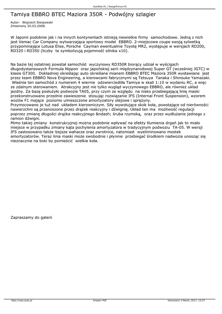AutoRok.PL / DesignForum.PL Tamiya EBBRO BTEC Maziora 350R - Podwójny szlagier Autor: Wojciech Sierpowski Zmieniony 20.03.2008. W Japonii podobnie jak i na innych kontynentach istnieją niewielkie firmy samochodowe. Jedną z nich jest Vemac Car Company wytwarzająca sportowy model EBBRO. 2-miejscowe coupe swoją sylwetką przypominające Lotusa Elise, Porsche Cayman ewentualnie Toyotę MR2, występuje w wersjach RD200, RD320 i RD350 (liczby te symbolizują pojemność silnika x10). Na bazie tej ostatniej powstał samochód wyczynowy RD350R biorący udział w wyścigach długodystansowych Formula Nippon oraz japońskiej serii międzynarodowej Super GT (wcześniej JGTC) w klasie GT300. Dokładniej określając auto określane mianem EBBRO BTEC Maziora 350R wystawiane jest przez team EBBRO Nova Engineering, a kierowcami fabrycznymi są Tetsuya Tanaka i Shinsuke Yamazaki. Właśnie ten samochód z numerem 4 wiernie odzwierciedliła Tamiya w skali 1:10 w wydaniu RC, a więc ze zdalnym sterowaniem. Atrakcyjny jest nie tylko wygląd wyczynowego EBBRO, ale również układ jezdny. Za bazę posłużyło podwozie TA05, przy czym ze względu na nisko przebiegającą linię maski przekonstruowano przednie zawieszenie stosując rozwiązanie IFS (Internal Front Suspension), wzorem wozów F1 mające poziomo umieszczone amortyzatory olejowe i sprężyny. Przymocowano je tuż nad układem kierowniczym. Siły wywołujące skok koła, powstające od nierówności nawierzchni są przenoszone przez drążek reakcyjny i dźwignię. Układ ten ma możliwość regulacji poprzez zmianę długości drążka reakcyjnego – śruba rzymską, oraz przez wydłużanie jednego z ramion dźwigni. Mimo takiej zmiany konstrukcyjnej można podobnie wpływać na efekty tłumienia drgań jak to miało miejsce w przypadku zmiany kąta pochylenia amortyzatora w tradycyjnym podwoziu TA-05. W wersji IFS zastosowano także lżejsze wahacze oraz zwrotnice, natomiast wyeliminowano mostek amortyzatorów. Teraz linia maski może swobodnie i płynnie przebiegać środkiem nadwozia unosząc się nieznacznie na boki by pomieścić wielkie koła. Zapraszamy do galerii http://mas.auto.pl Kreator PDF Utworzono 3 March, 2017, 15:57