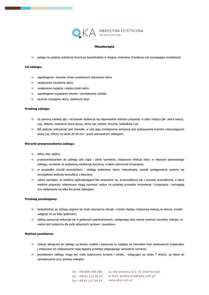 Mezoterapia • polega na podaniu substancji leczniczej bezpośrednio w miejsce zmienione chorobowo lub wymagające rewitalizacji Cel zabiegu: • zapobieganie i leczenie zmian wywołanych starzeniem skóry • zwiększenie nawilżenia skóry • zwiększenie napięcia i elastyczności skóry • zapobieganie wypadania włosów i powstawania cellulitu • leczenie rozstępów skóry, niektórych blizn Przebieg zabiegu: • Za pomocą cienkiej igły i strzykawki dostarcza się odpowiednio dobrane preparaty w takie miejsca jak: skóra twarzy, szyi, dekoltu, owłosiona skóra głowy, skóra rąk, ramion, brzucha, pośladków i ud. • Ból podczas wstrzyknięć jest niewielki, w celu jego zmniejszenia wskazane jest zastosowanie kremów znieczulających skórę (np. EMLA) na około 20-30 min. przed planowanym zabiegiem. Warunki przeprowadzenia zabiegu: • dobry stan ogólny; • przeciwwskazaniem do zabiegu jest ciąża i okres karmienia, miejscowa infekcja skóry w obszarze planowanego zabiegu, uczulenie na podawaną substancję leczniczą, a także zaburzenia krzepnięcia; • w przypadku chorób przewlekłych i stałego pobierania leków indywidualny sposób postępowania omawia się szczegółowo podczas konsultacji z lekarzem; • należy pamiętać, że niektóre ogólnodostępne leki stosowane np. przeciwbólowo lub z powodu przeziębienia, a także niektóre preparaty witaminowe mogą wywierać wpływ na przebieg procesów krwawienia i krzepnięcia i wymagają one odstawienia na kilka dni przed zabiegiem. Przebieg pozabiegowy: • bezpośrednio po zabiegu pojawić się może nieznaczny obrzęk i rumień, będący miejscową reakcją na ukłucie, zwykle ustępuje on po kilku godzinach; • zabieg zazwyczaj wykonuje się w godzinach popołudniowych, następnego dnia można wykonać normalny makijaż, co ważne jest zwłaszcza dla osób aktywnych życiowo i zawodowo. Możliwe powikłania: • reakcje alergiczne po zabiegu są bardzo rzadkie i zazwyczaj ze względu na niewielkie ilości podawanych preparatów i miejscowe ich zastosowanie mają łagodny przebieg ustępującego samoistnie rumienia; • powikłaniem zabiegu mogą być małe wybroczyny krwawe i siniaki, zamaskowania przy pomocy makijażu. ustępujące po około 7 dniach; są łatwe do