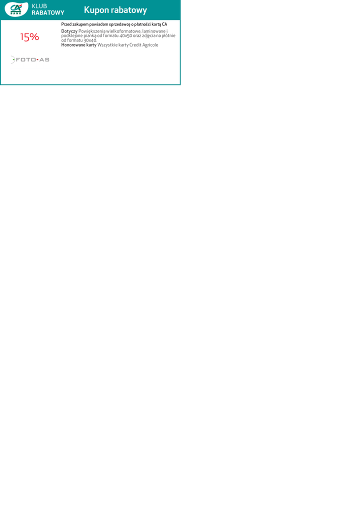Przed zakupem powiadom sprzedawcę o płatności kartą CA 15% Dotyczy Powiększenia wielkoformatowe, laminowane i podklejone pianką od formatu 40x50 oraz zdjęcia na płótnie od formatu 30x40. Honorowane karty Wszystkie karty Credit Agricole